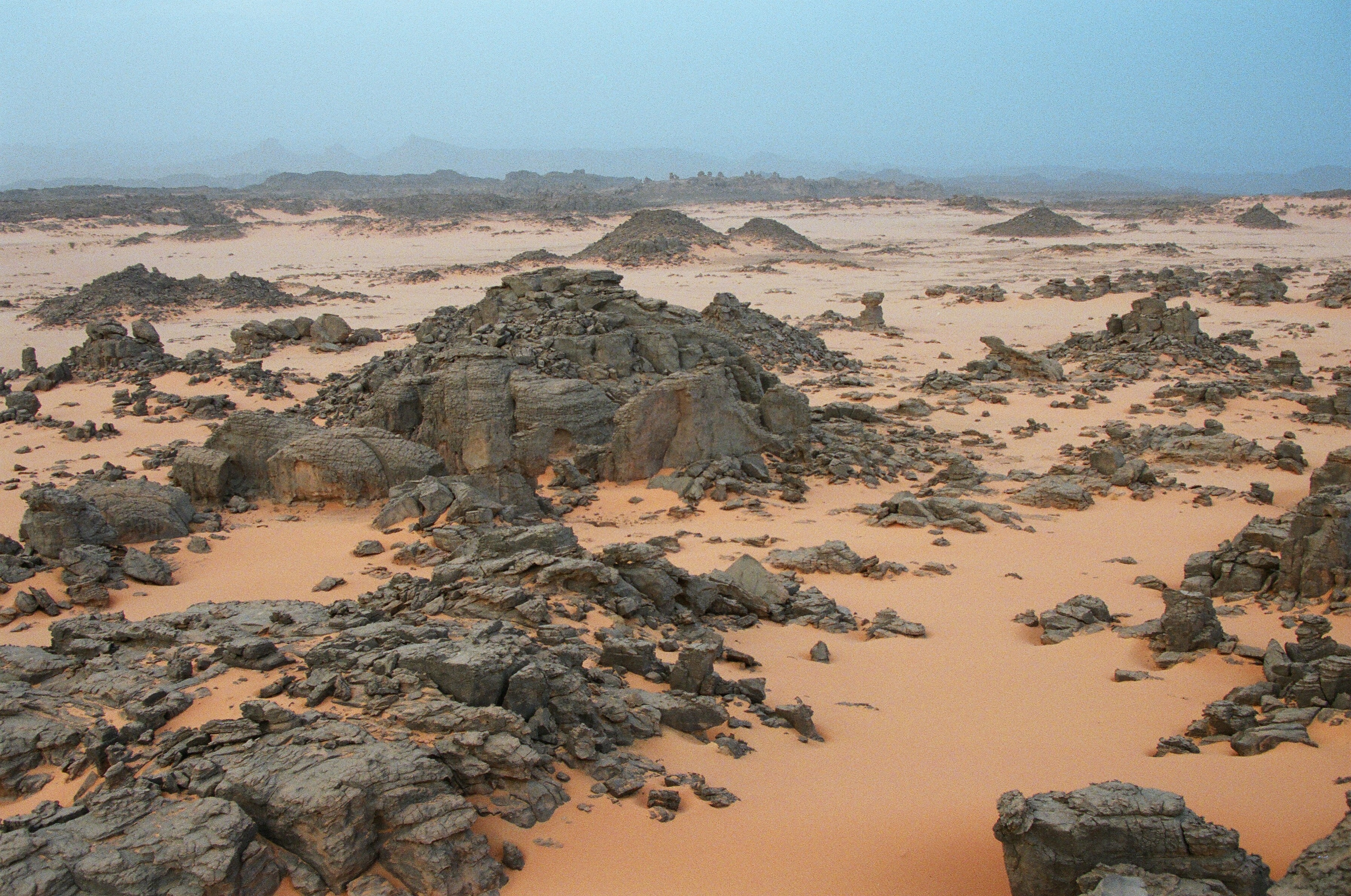 巨人の黒い尖塔岩が空に聳え、ティハラミウェンの広大な砂漠に日がゆっくり沈むころ、遠く鮮やかな草の絨毯に横たわるモン・ブラン山の完璧な円錐が現れてくる。岩の足元で我々は最後の野外キャンプの夜を過ごす。夕暮れ、どこかの遊牧キャンプに山羊と一緒に帰る羊飼娘の呼び声や、牧草地に連れて行く足かせをはめられたラクダの低いうなり声が聞こえ、その後は完全な静けさ・・