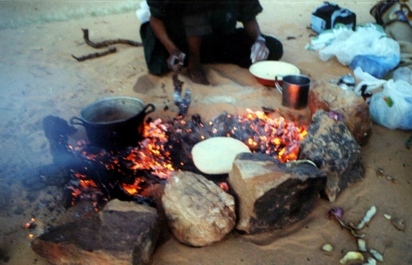 日が沈む前には、キャンプの周りを散歩しながら、夜のための薪を探す。夕食はいつもシンプルで美味しい。それは我々がとてもおなかが空いているせいなのか、簡単なものに満足することを学び初めているせいかもしれない・・炭で焼くパンやマカロニ、刻んだ肉、お茶、焚き火のパチパチいう音、言葉少なに眼差しや微笑を交わすだけで心が通じる。