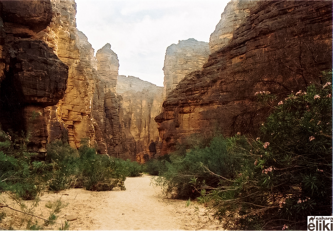 そしてラクダ使いは難なくラクダを見つけ、我々は岩の隘路にゴーゴーと吹く砂風のせいで幻のように朦朧とした砂漠の海の中をジャネットに向かって錨を上げる。ティスラスの高地に至る何千のラクダの足跡に踏み固められたうねうねした道を通って、小さい我々のキャラバンはお昼ごろジャネットの門に到着する。我々の眼の前に広がるジャネットのクスールと豊かな椰子の菜園を眺めて言葉もなく目が眩み感嘆する。そして、砂漠を横断したキャラバンの人々のように究極の満足感と共に、「タッシリの真珠」ジャネットのオアシスの慰めに満ちた木陰へゆっくりと降りていく。
