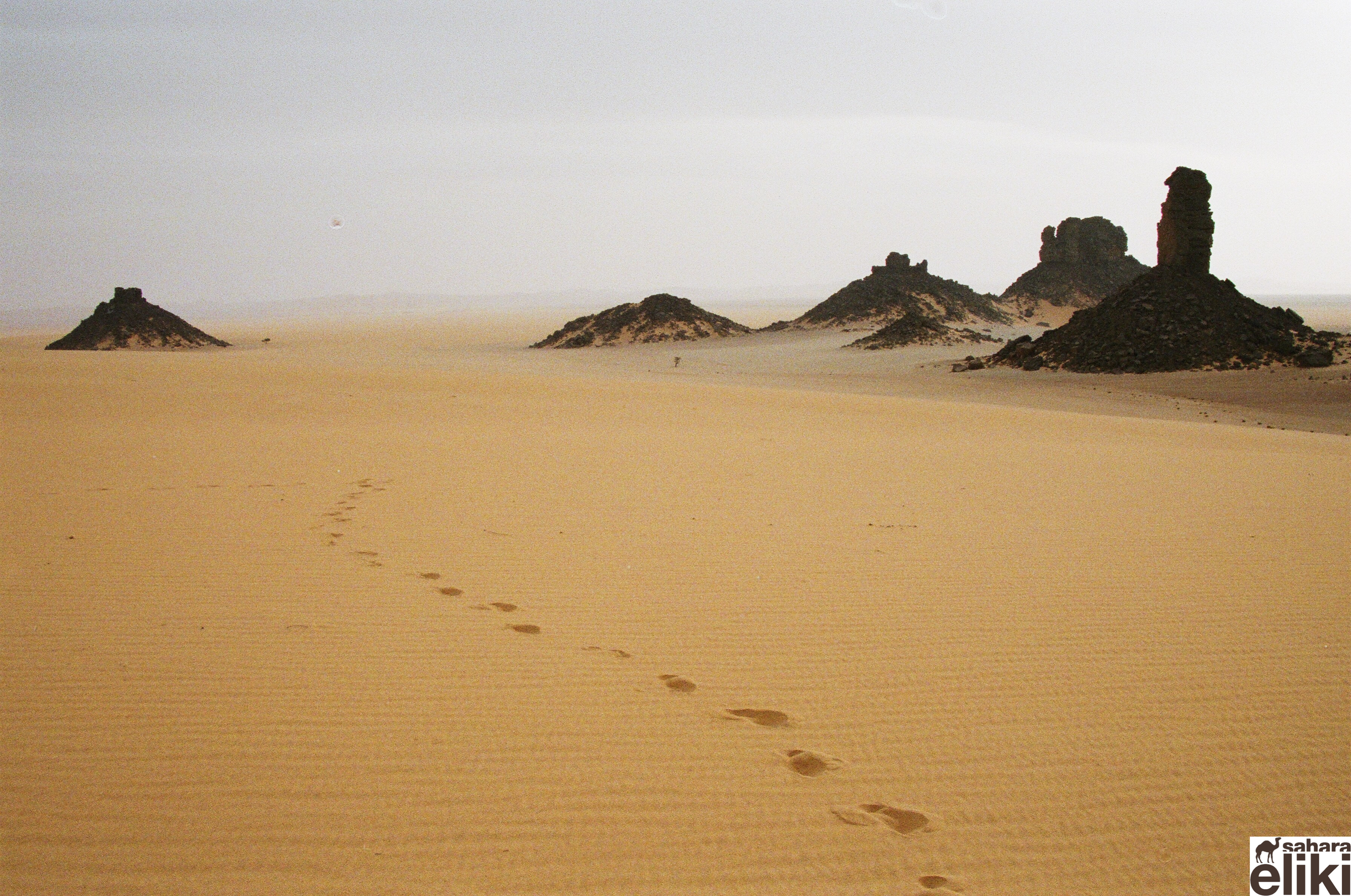 翌日は午前中は急がずに、お茶を飲みながら、砂丘にくっきりと見える草を食む黒と白の山羊の姿を見る。我々のラクダ使いは朝早くラクダ達を探しに行っているので、ゆっくりと彼の帰りを待っている。実は、足かせがはめられたラクダは隣に草地があっても、夜にかけて一番好きなところまで何キロも歩くのは珍しくない。それでラクダ使いはラクダの足跡を追って探さなければならない・・多数のラクダの足跡がいっぱいの砂の上には、その他に砂漠に生きているジャッカル、フェネックギツネ、ガゼル(小型のカモシカ)、ウサギ、白ねずみやムフロンという野生の山羊の足跡などもあり、そこから自分のラクダの足跡を見つけることは信じられないほど優れた知恵がいる。その知恵によって、遊牧民は砂に書いてあるものを本のように読み、各足跡の古さや形によって検討し、そこを通った動物に限らず人間も見つけることが出来る!
