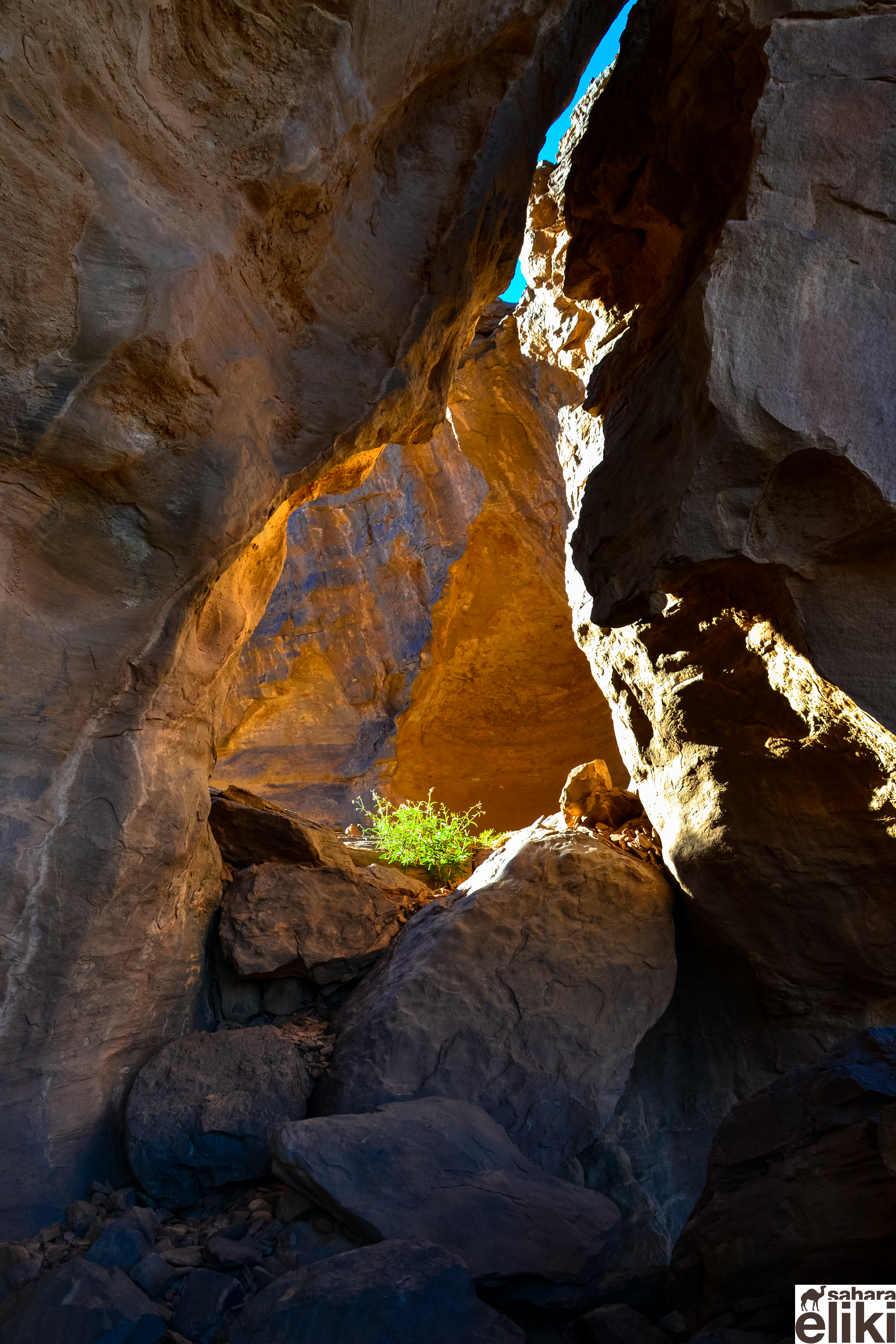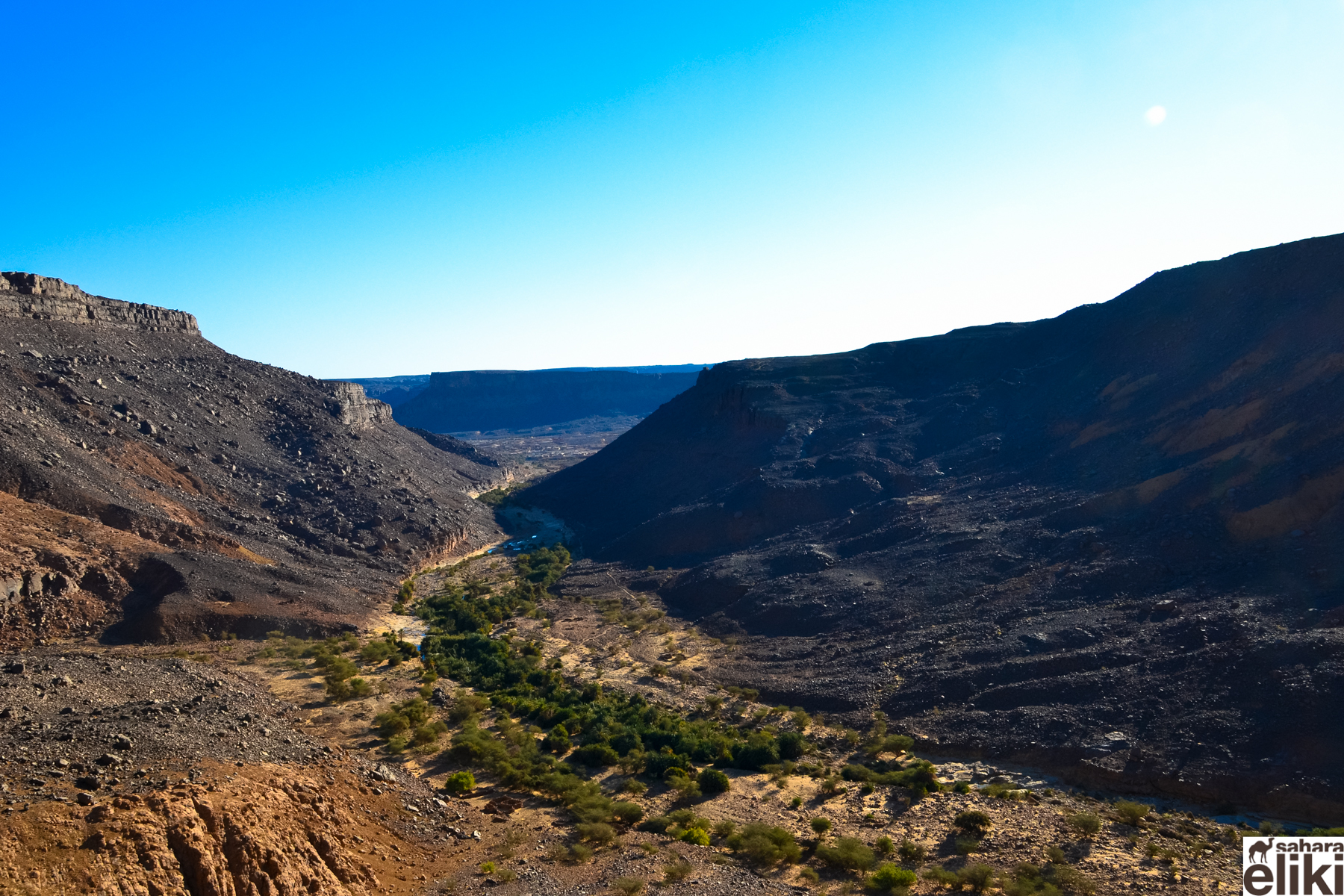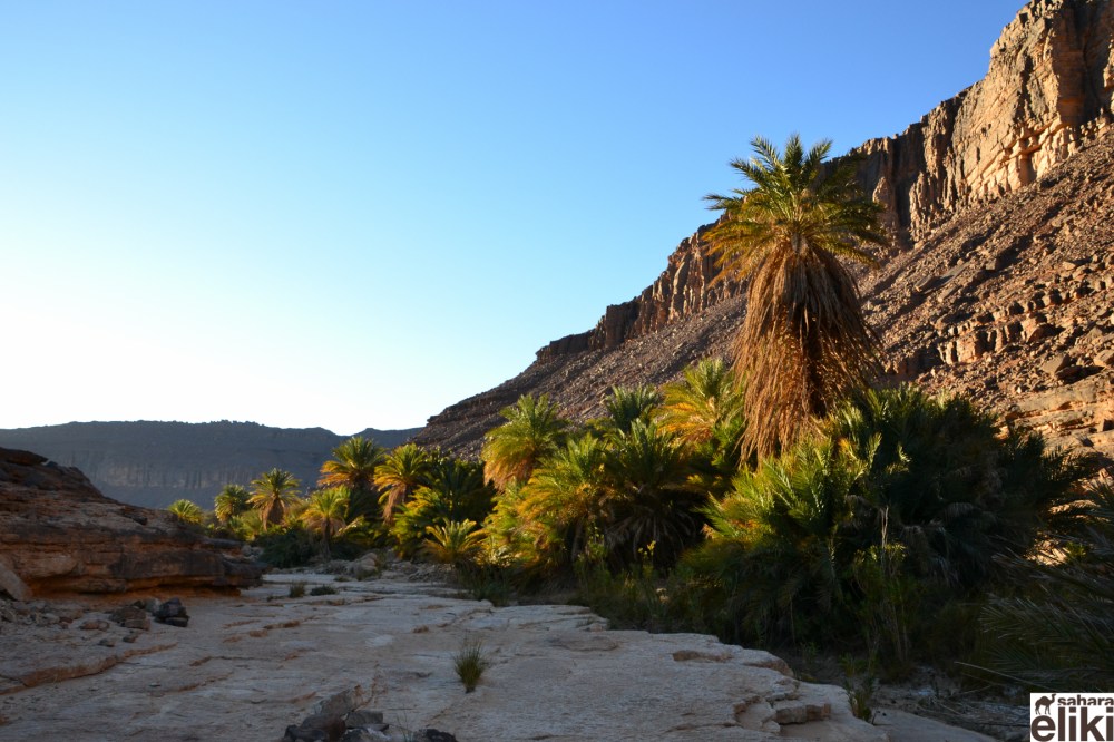 アドメル砂漠の砂丘に沿って、エレヘルに3時間で着いた。そこのヤシの木影で長い間、ロバを待った。8頭のロバが集まっても、あとの2頭が来ないと荷物を積めない。各ロバの体力を見てから荷物を振り分けて積まなくてはいけないからだ。今までの私のツアーではロバが遅刻したこと無かったので少し焦ったが、今回はいつものジャネットのチームとは違うので仕方がない。今回同行するのは、60歳くらいのガイドにコック、それとロバ使い二人だ。結局、私はガイドに頼んで、先に歩き出した。山のオアシスは美しい夕方の光に照らされていた。まもなく日が崖の裏に沈み、気温はあっという間に下がった。