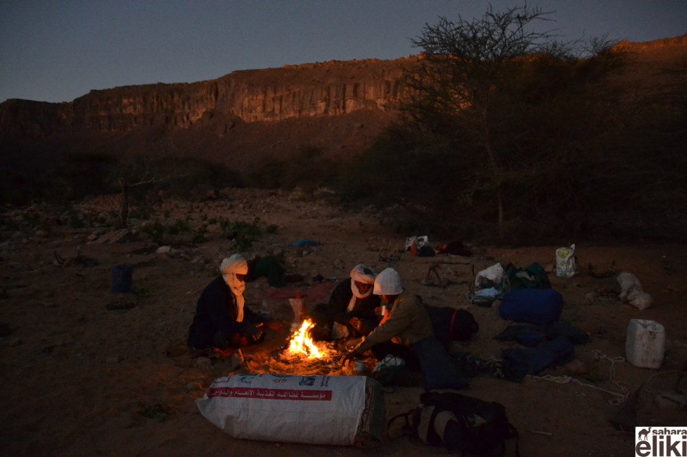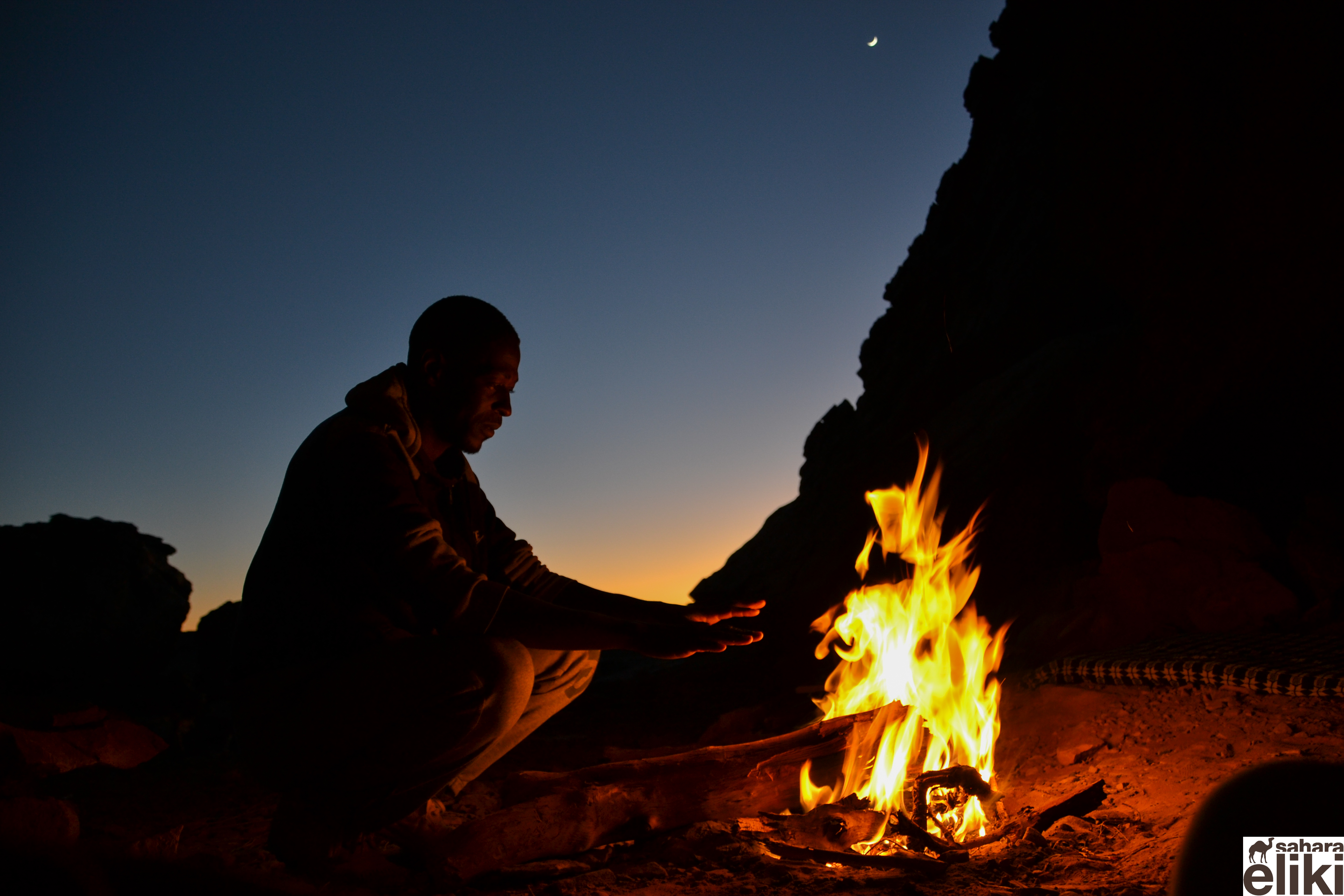ガイドは「ここでキャンプするからロバを待ちましょう」とタマシェック語で言うが、ロバが着かないと私たちの荷物も着かない。そして寒い。「薪を探しましょう!」。さっそく皆は動き出し、大きい枝も小さい枝も、アカシアやヤシの木のもの全部集めてきた。大きな炎が空に上り、皆で温まりながら、日本のお菓子を食べながら待った。ロバ隊がやっと見えた時はもう夕暮れだった。皆は薄暗い空にテントを立てるのかと、私はため息をついた。ちゃんと飼育されていないロバが一頭でも混じっていると、このようにスケジュールが遅れるのだ。それにお腹がぺこぺこ、皆は寝ていないのだ。しかしコックがさっそく作ってくれる夕食を待っている間に、私は離れたところでマットを敷いて、独り寝のベッドを作り始めると気分がなおった。トゥアレグの友達にラクダの毛のケープと寝袋を借りて、市場で5キロの毛布も買ったので、星空を見ながらこれでぐっすり眠れるはずだ!しかしおいしいスープと野菜シチューを食べてから、空の下のベッドにもぐった途端に、山からジャッカルの吠え声が聞こえた。しかもすごい数だ。私はその声に耳を傾けながら、ロバ使いたちにジャッカルの様子を聞きに行った。「そうだ。ここは多いよ。君ももうちょっと近くで寝れば良いのに!」と言って笑った。「でもジャッカルは人間を襲わないでしょう?」と確かめると、「うん、その通り」と答えた。私はまた聞いた。「じゃ、どうして近くで寝た方がいいの?」「なんとなく」。トゥアレグはいつもこんな感じだから諦めてベッドにもどった。それで不気味な吠え声を聞きながら砂漠の流れ星を待った。「でも…ジャッカルは一頭だけじゃあぶなくないけど、群だとどうなるのかな?」そんなことを思いながらいつか寝てしまった。