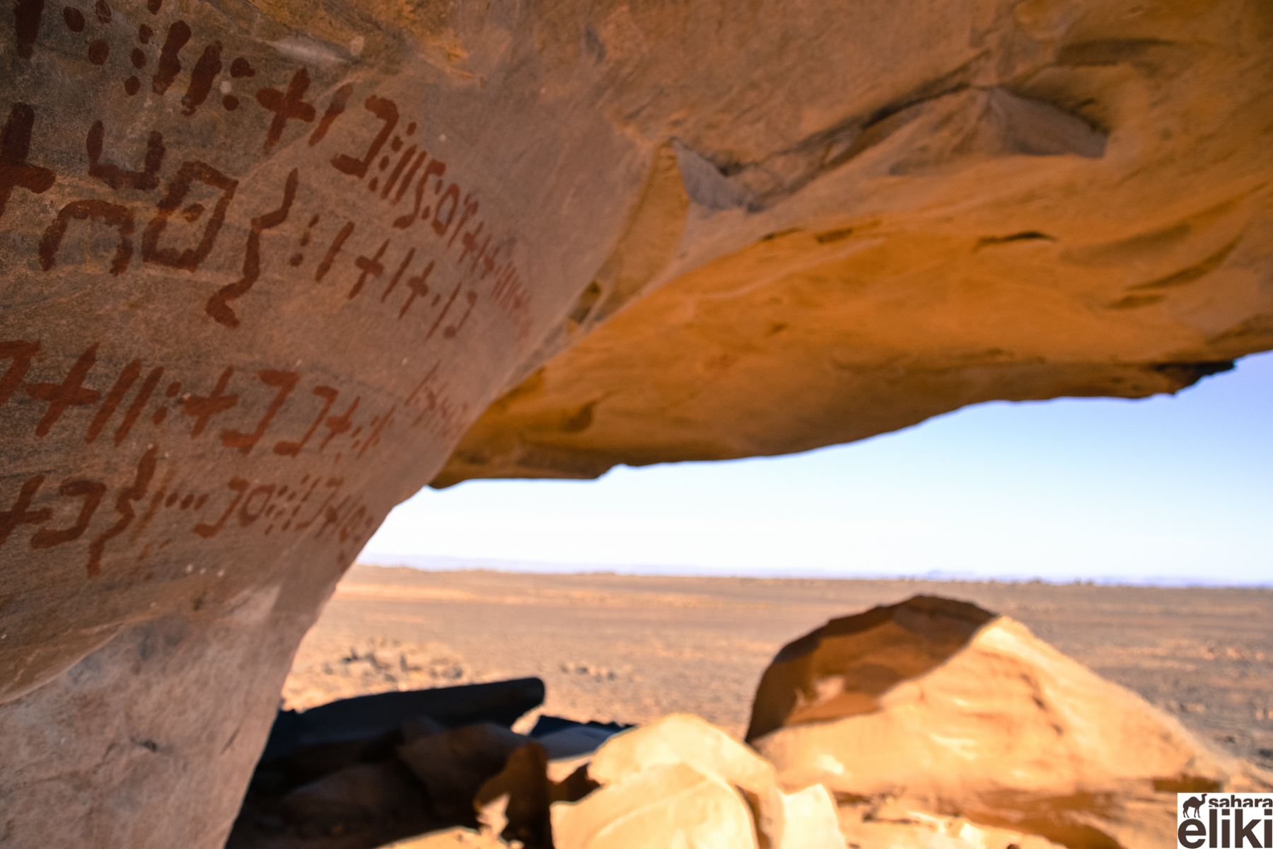 タジェラヒン台地を3時間で登った。1950年代、フランス軍が作った山道があるから歩きやすいが、車ではとても登れないところだ。台地の上に着くと、大きな岩の壁にティフィナグ文字が赤く書いてあった。北アフリカの原住民であるベルベル族が共有しているアルファベットが約2000年前に存在していたそうだ。トゥアレグ族は口頭伝承だが、ティフィナグ文字を教えるのは女性たちの大事な役割の一つだ。しかし、同行しているガイドおじさんのアイサは、オアシスに定住しているせいか、ティフィナグをよく読めないという。この岩から見渡す限り広がる大地を眺めていると、この文字を書いた人きっと凄い詩を残したに違いないと思った。しかし、その後ティフィナグをよく知っている友人にこの写真を見せたら、彼は笑いながら、「これはラッラという女性がタルハナクというもう一人の女性に書いた伝言らしい。その意味は「ラッラはタルハナクに対して怒っています」と言ってびっくりした。世の中、本当に謎だらけ…
