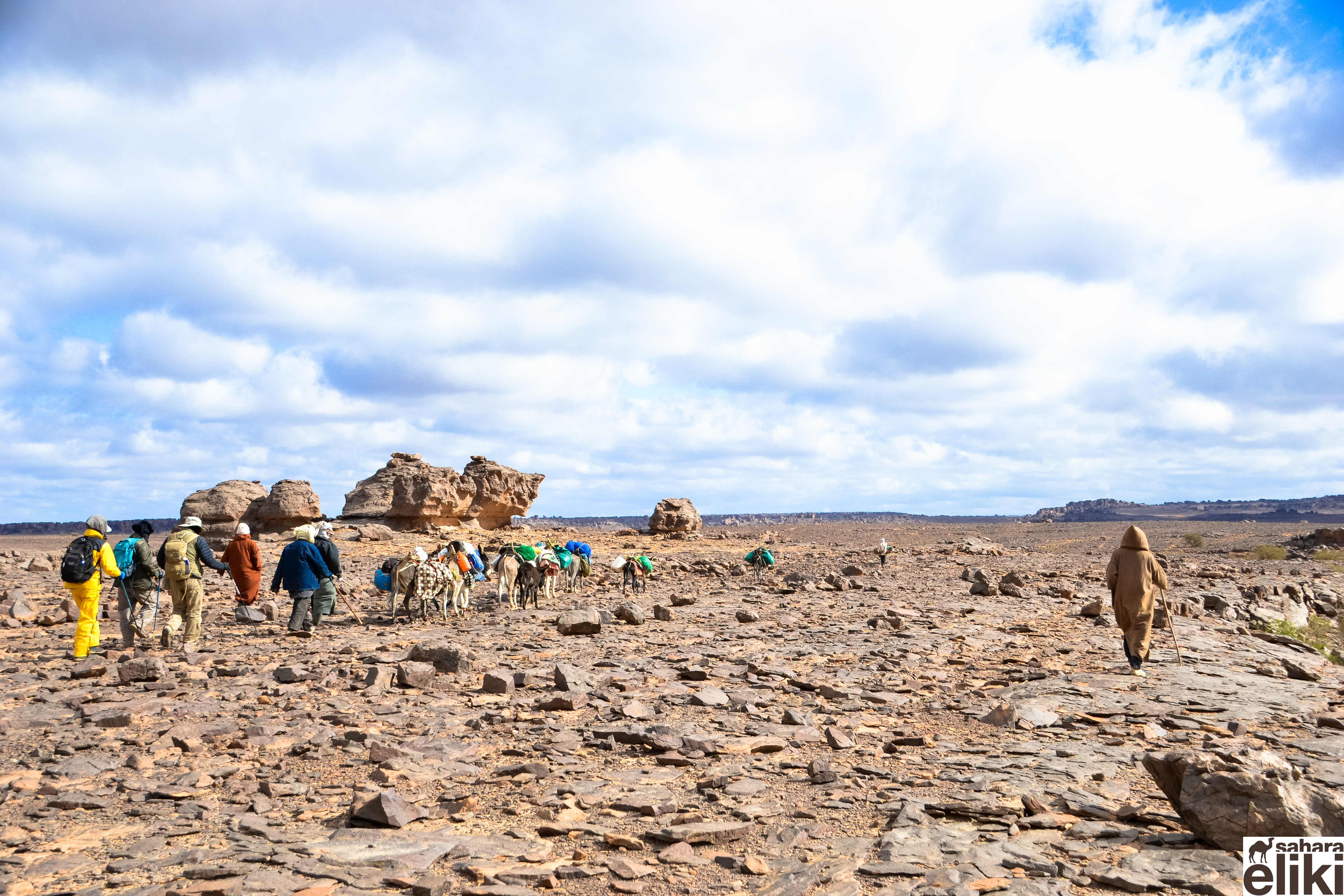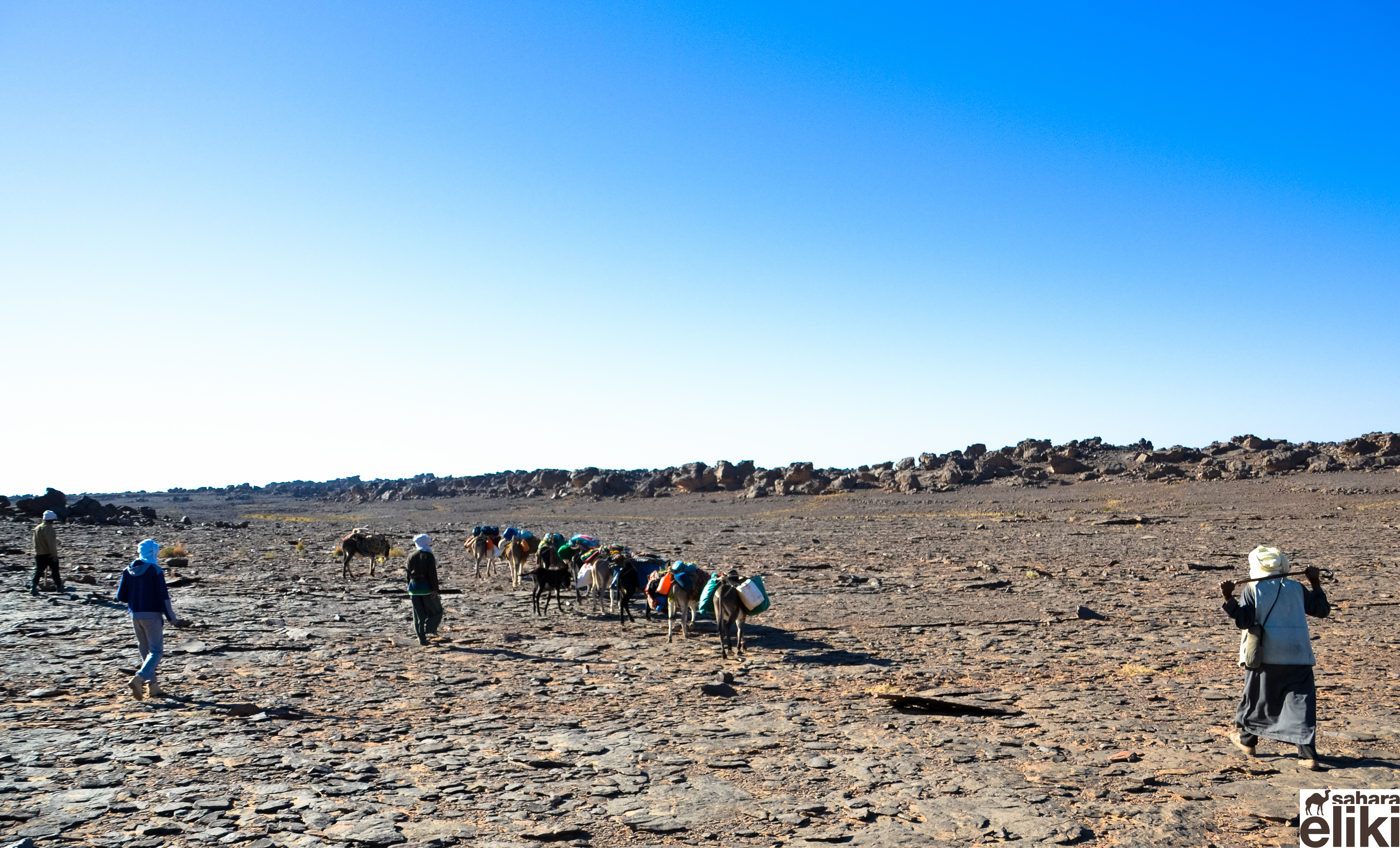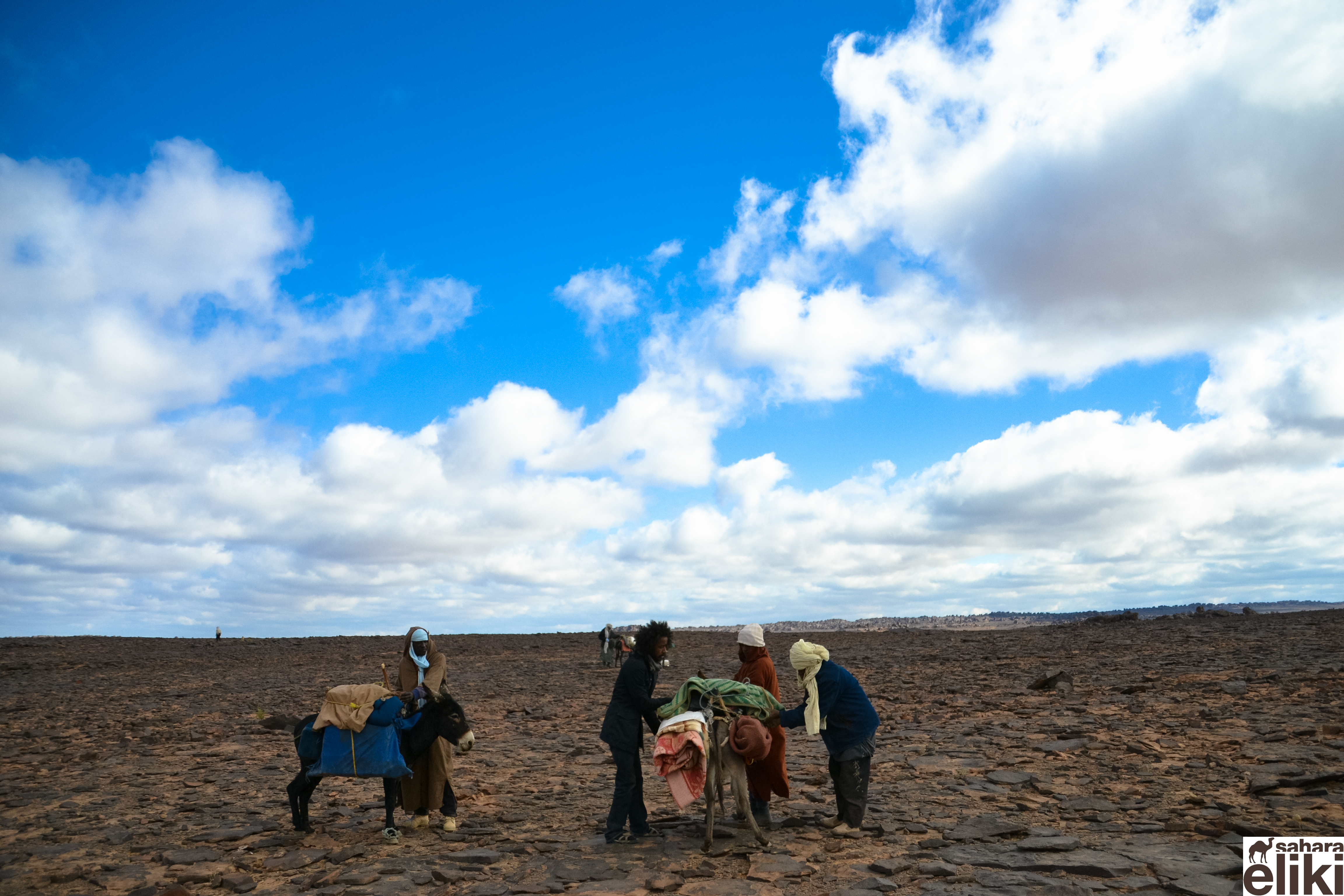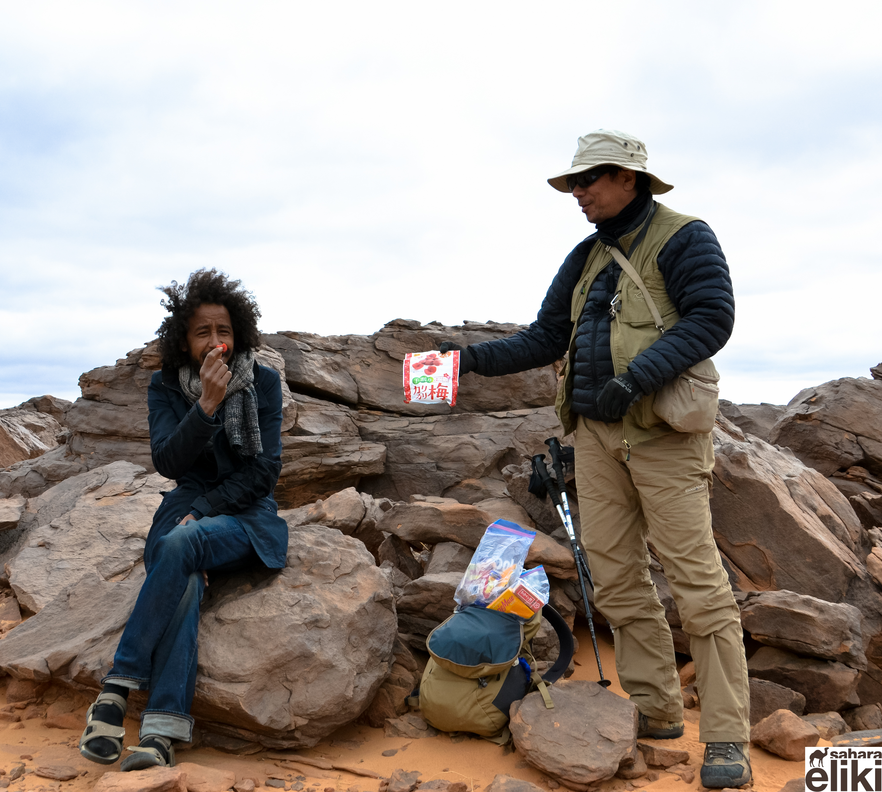ジャネットからエレヘルのオアシスへ向かって国道を走った。同行しているのは溝口さん、大ちゃんとチカさんという日本人3名で、これからロバ隊と一緒にタジェラヒン台地を登って6日間を過ごす予定だ。10年ぶりのサハラ・エリキのツアーに興奮するが、私はパリの実家が今引っ越しなどで忙しくて、ウェスタンブーツ以外、ビーチサンダルしか持ってきていないのだ。そのビーサンを見てお客さんたちは「それで歩けますか」と心配そうに尋ねた。「ニジェールで3000キロの塩キャラバンもビーサンだったから、なんとかなる!」と答えるが、失敗したことすでに分かっていた。これから行く岩の砂漠はとても寒いのだ、、