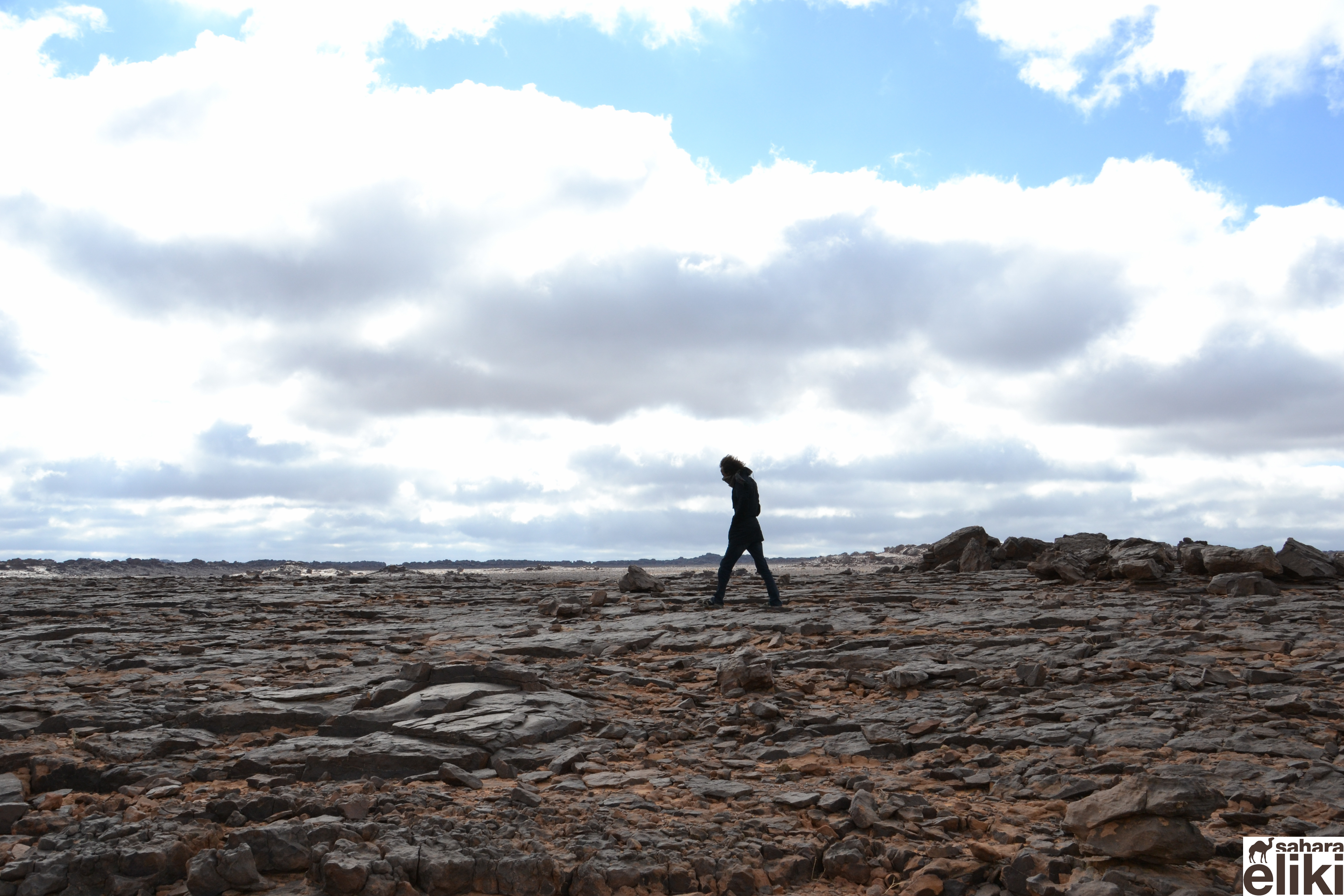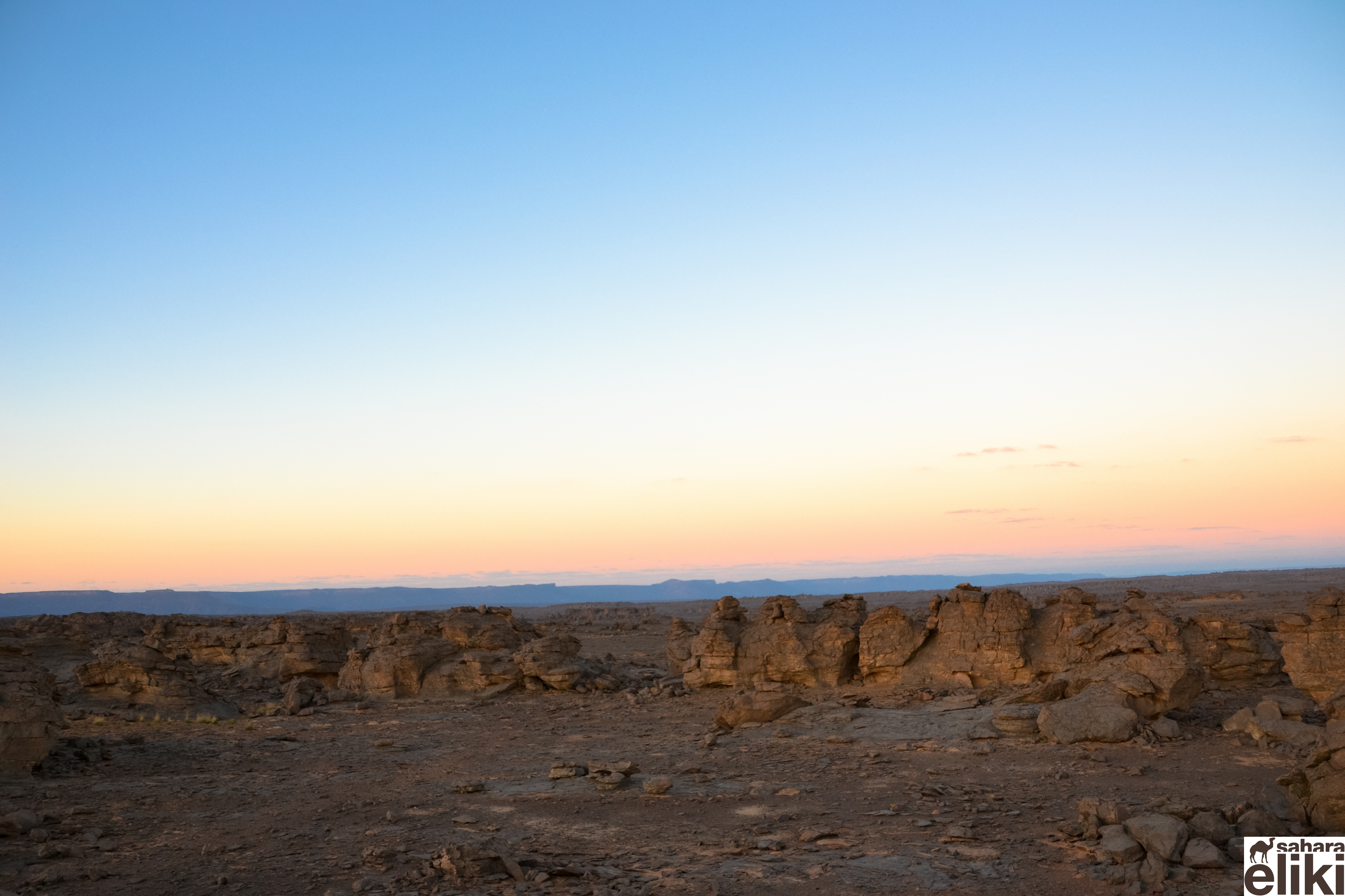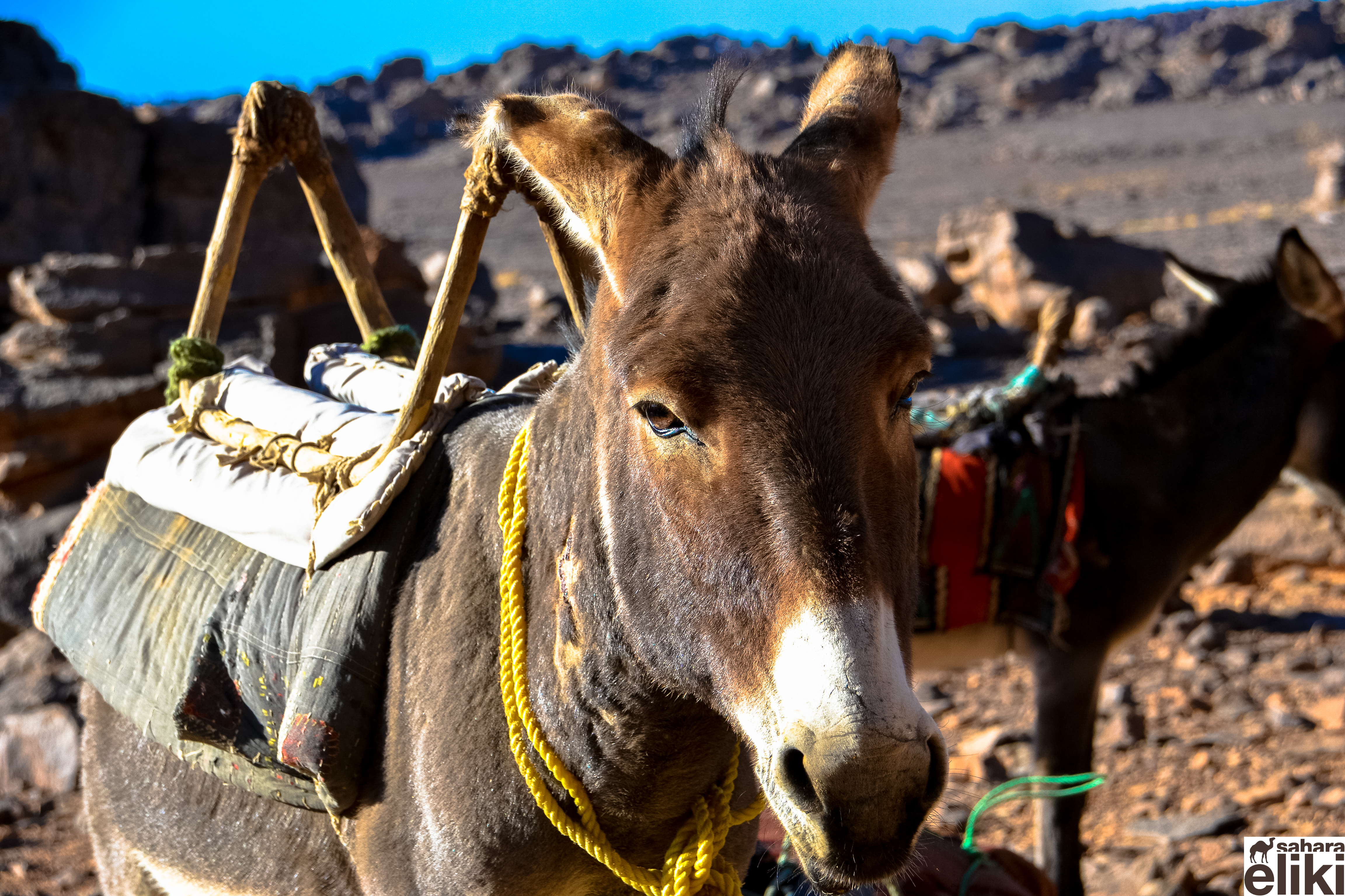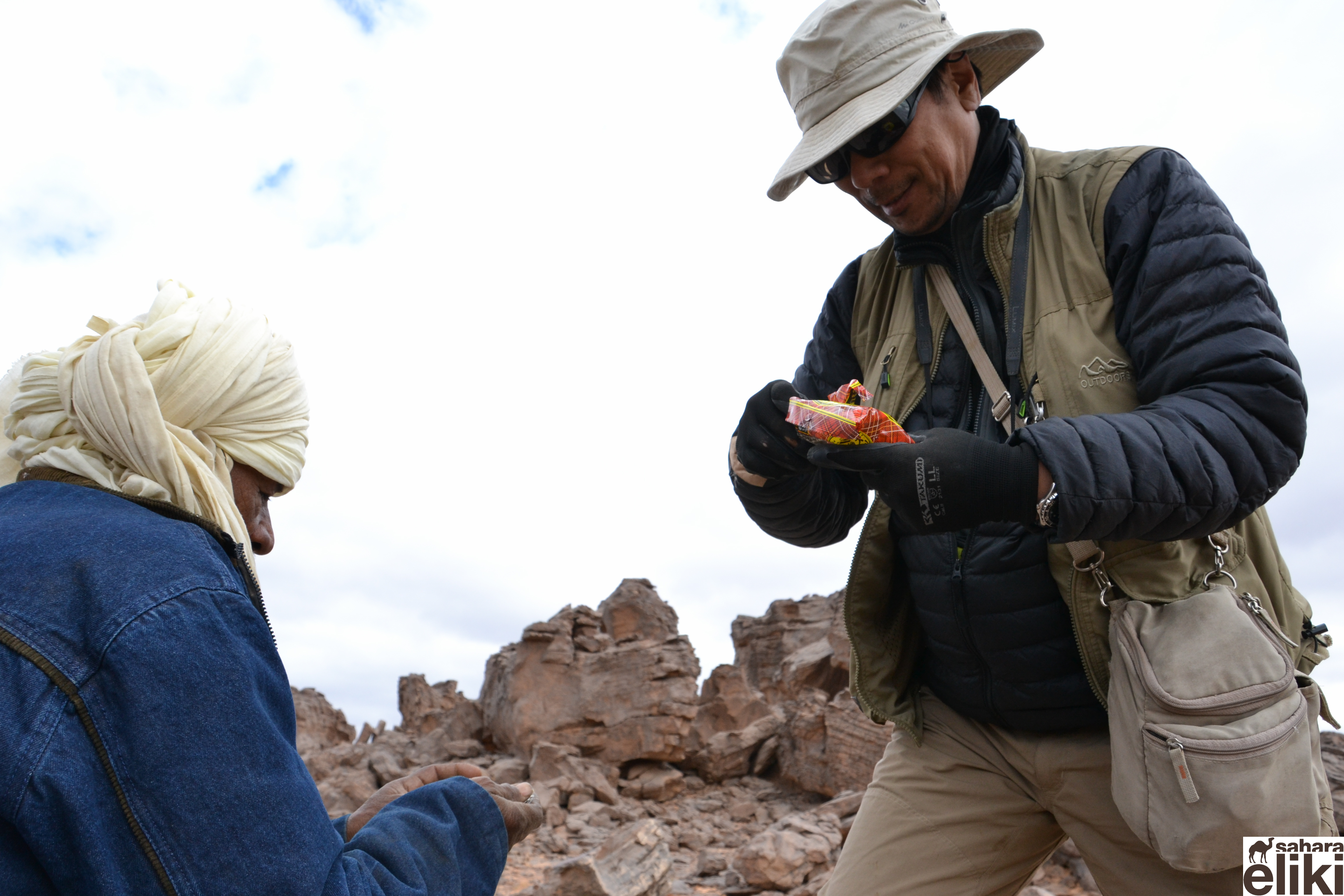 ジャネットからエレヘルのオアシスへ向かって国道を走った。同行しているのは溝口さん、大ちゃんとチカさんという日本人3名で、これからロバ隊と一緒にタジェラヒン台地を登って6日間を過ごす予定だ。10年ぶりのサハラ・エリキのツアーに興奮するが、私はパリの実家が今引っ越しなどで忙しくて、ウェスタンブーツ以外、ビーチサンダルしか持ってきていないのだ。そのビーサンを見てお客さんたちは「それで歩けますか」と心配そうに尋ねた。「ニジェールで3000キロの塩キャラバンもビーサンだったから、なんとかなる!」と答えるが、失敗したことすでに分かっていた。これから行く岩の砂漠はとても寒いのだ、、