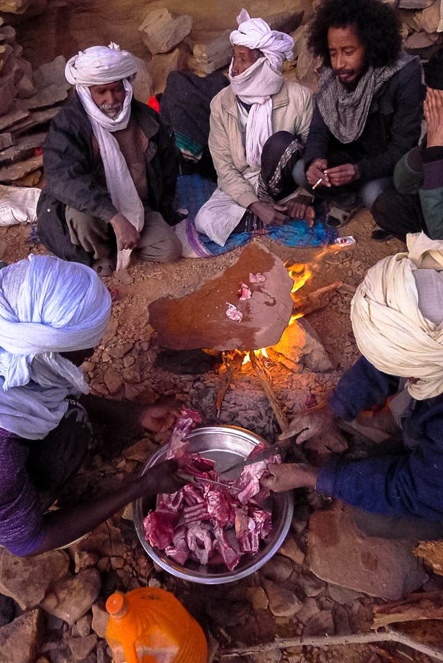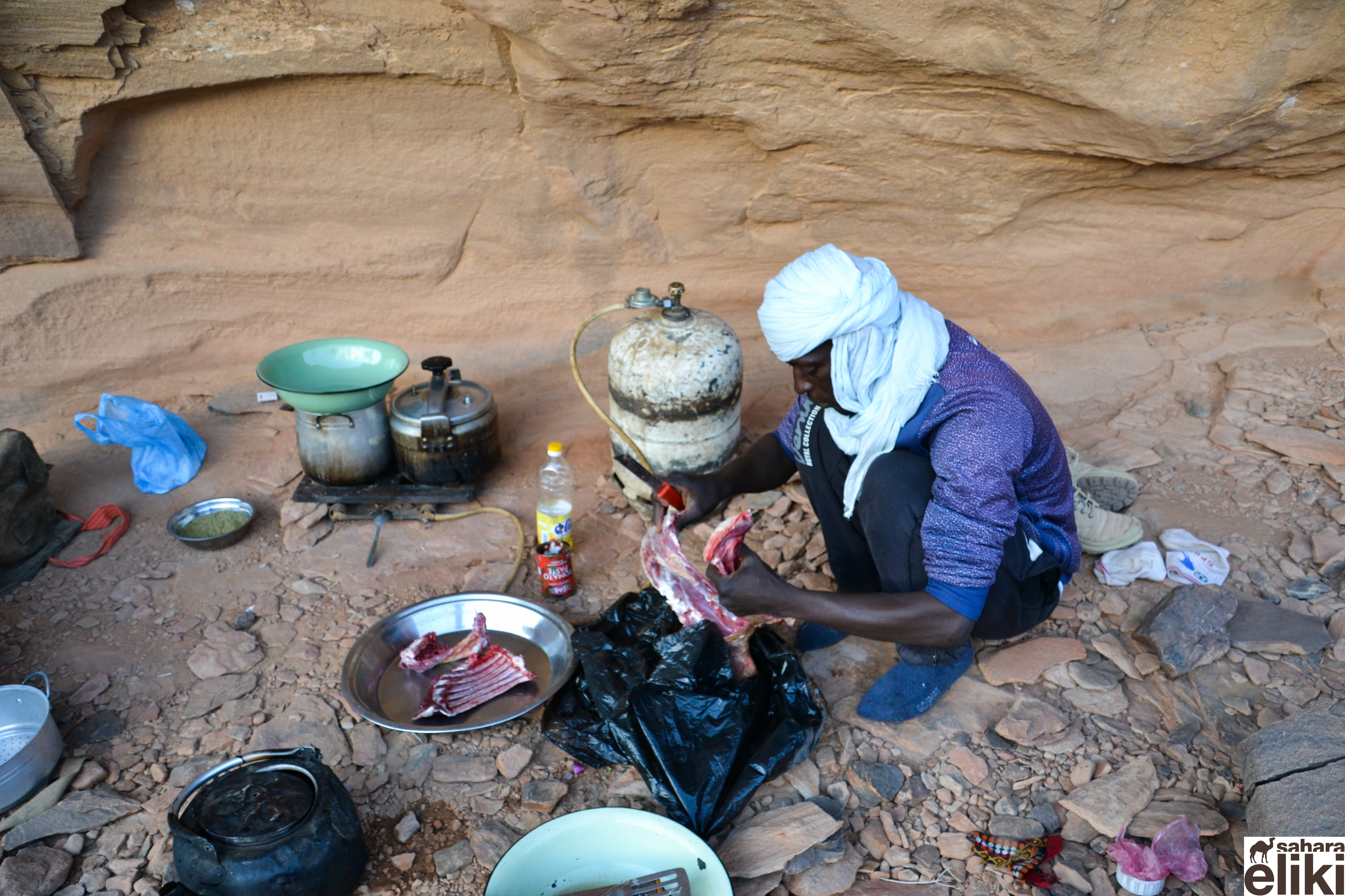とても寒い中、キャンプするところへ向かった。洞窟はコックが一生懸命に前日屠った山羊の内臓でスープを作ってくれた。イヘーレンから帰ってきて体が震えるほど凍えた私はこのスープで蘇った。ところがそのスープの匂いにまるで導かれたように、ロバ2頭とロバ使い一人を伴ったウスマンが現れた。タミクレストというトゥアレグのバンドのボーカルである彼と、タジェラヒンのどこかでという約束で待ち合せをしていたが、それがいつで、どこでさえも決まっていなかったから、私は他の仲間たちには黙っていた。そこに頭ボサボサでロバにエレキギターとアンプを積んだウスマンが急に出てくると、皆は目が点になった。「豊田で演奏していたバンドの彼だ!」と溝口さんたちが叫んだ。タミクレストはこれまでに2回ほど来日したことがあるので、ウスマンも日本人は始めてではない。そして彼はぐっすり睡眠をとってから、夜の大晦日ライブの準備をした。