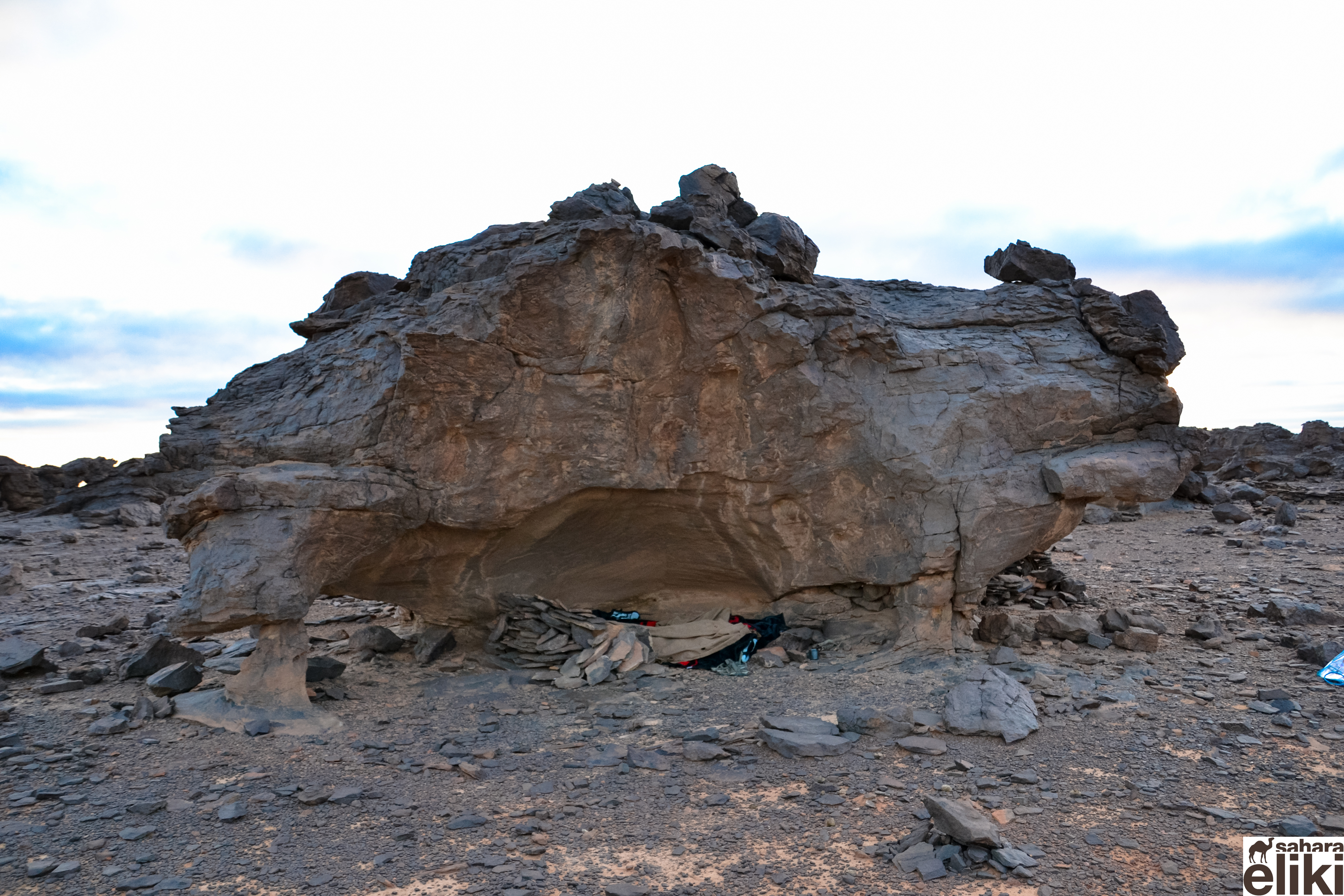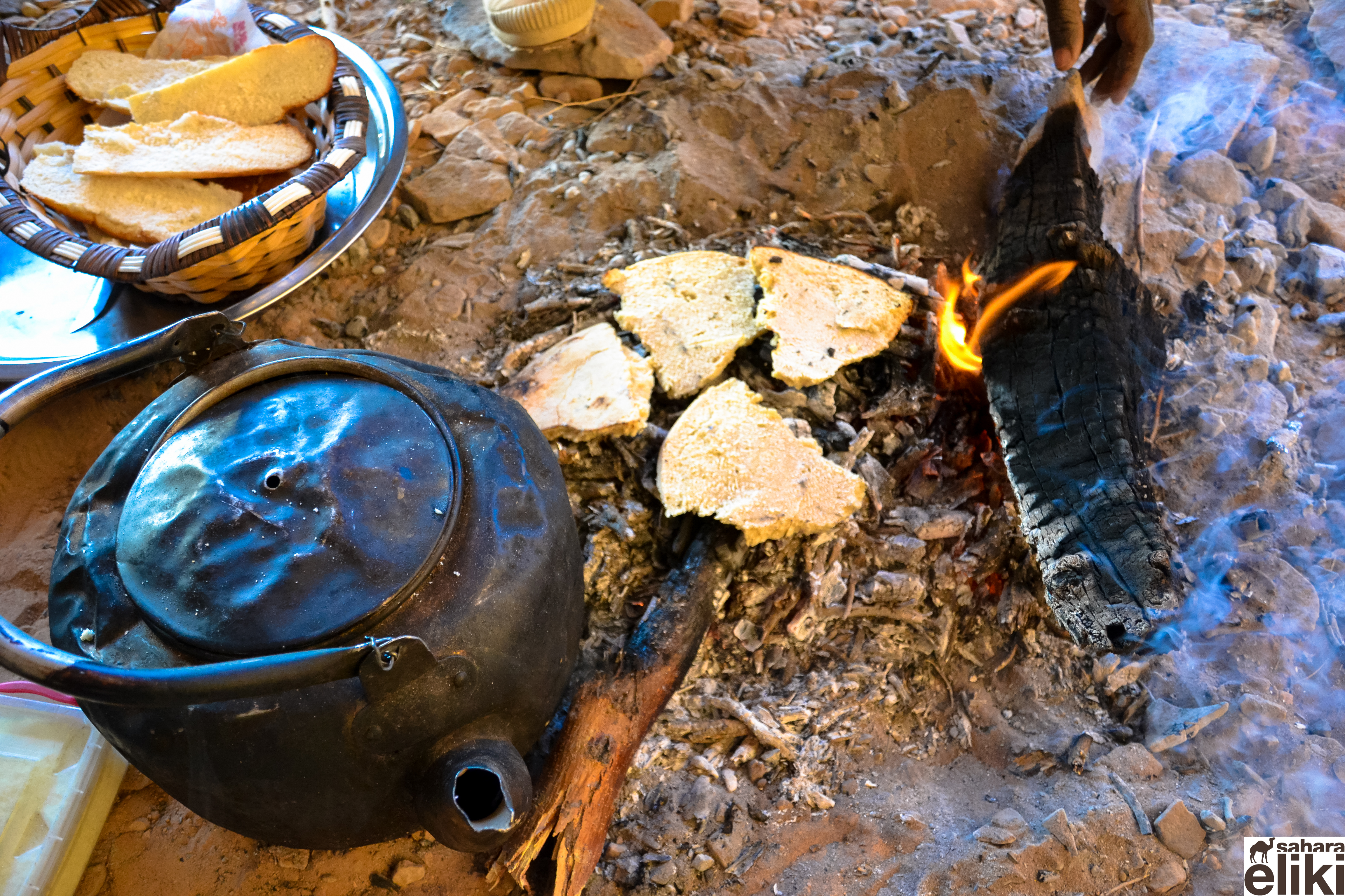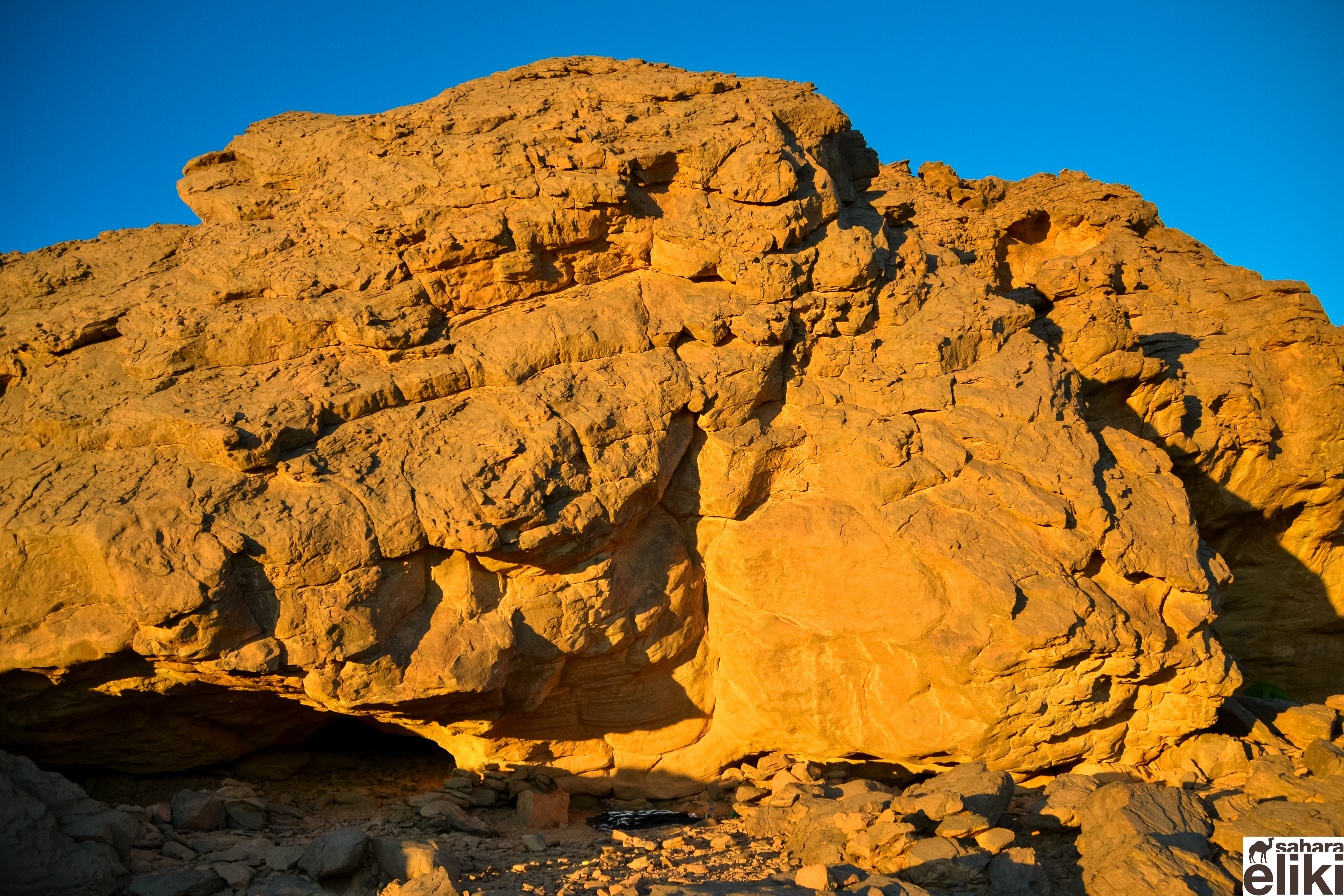 イサラマンという砂漠でキャンプを立てた。トゥアレグ族にとって砂漠はどれも同じではない。それぞれが昔から名前を持っているのことで、道が分かりやすく待ち合わせもできるのだ。夜、トゥアレグはさっそくトゲラのパンを作った。暑い砂の中で焼く丸いパンは、それなのに一切砂が入っていないのは彼らの特技だ。私は岩の壺の中でマットを敷いて長い間星空を眺めた。何年かぶりにサハラの夜を静かに楽しめた場所だ。