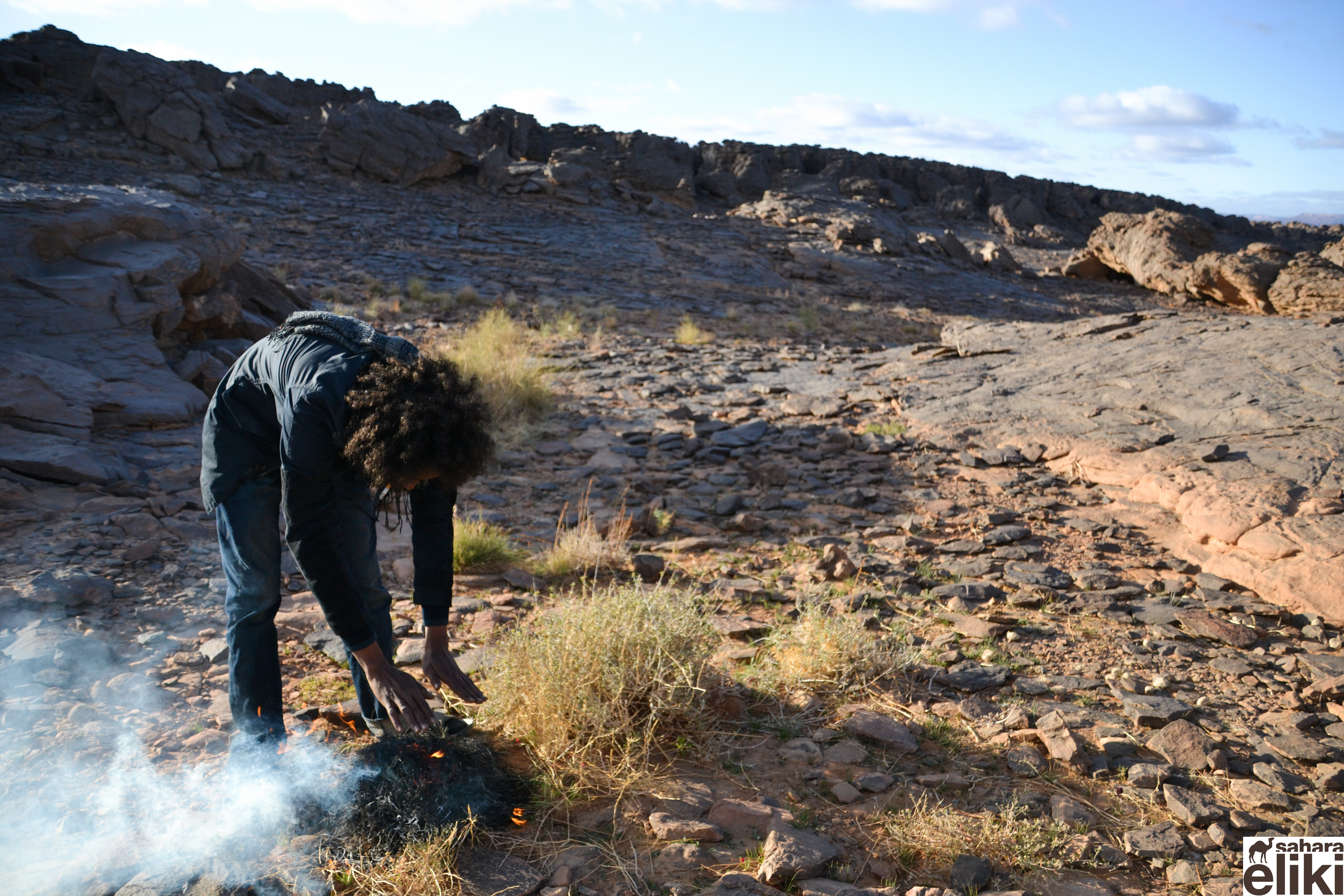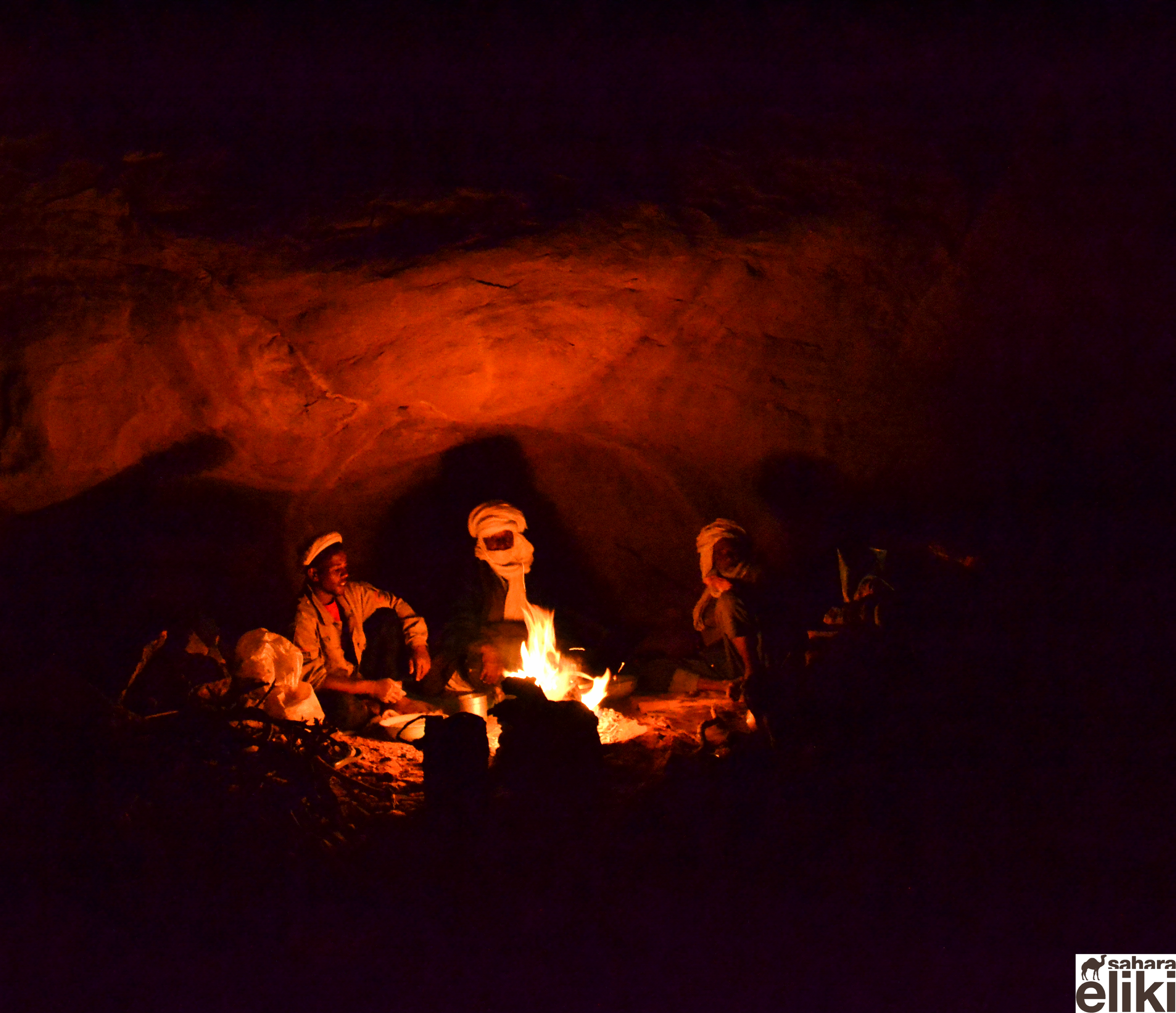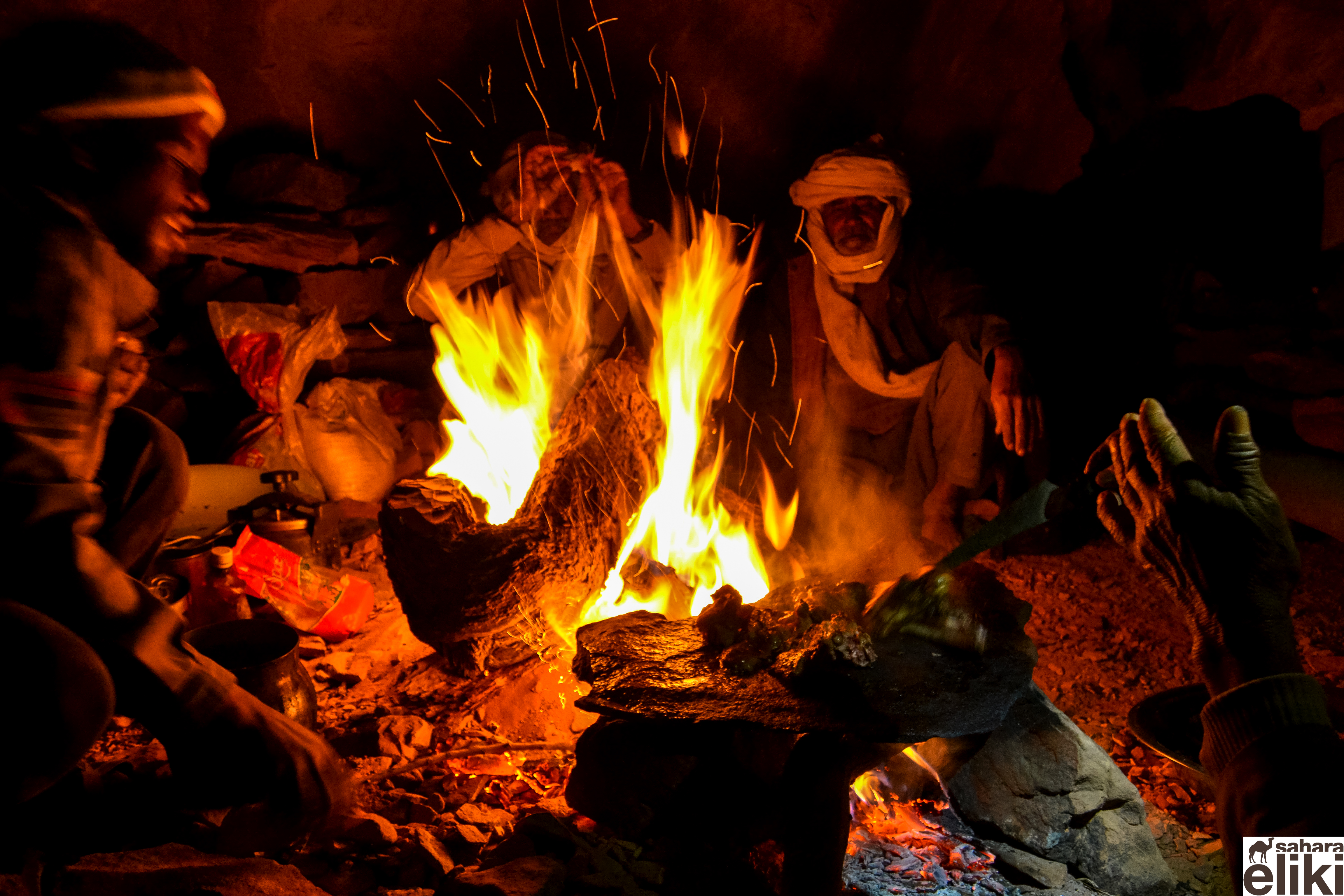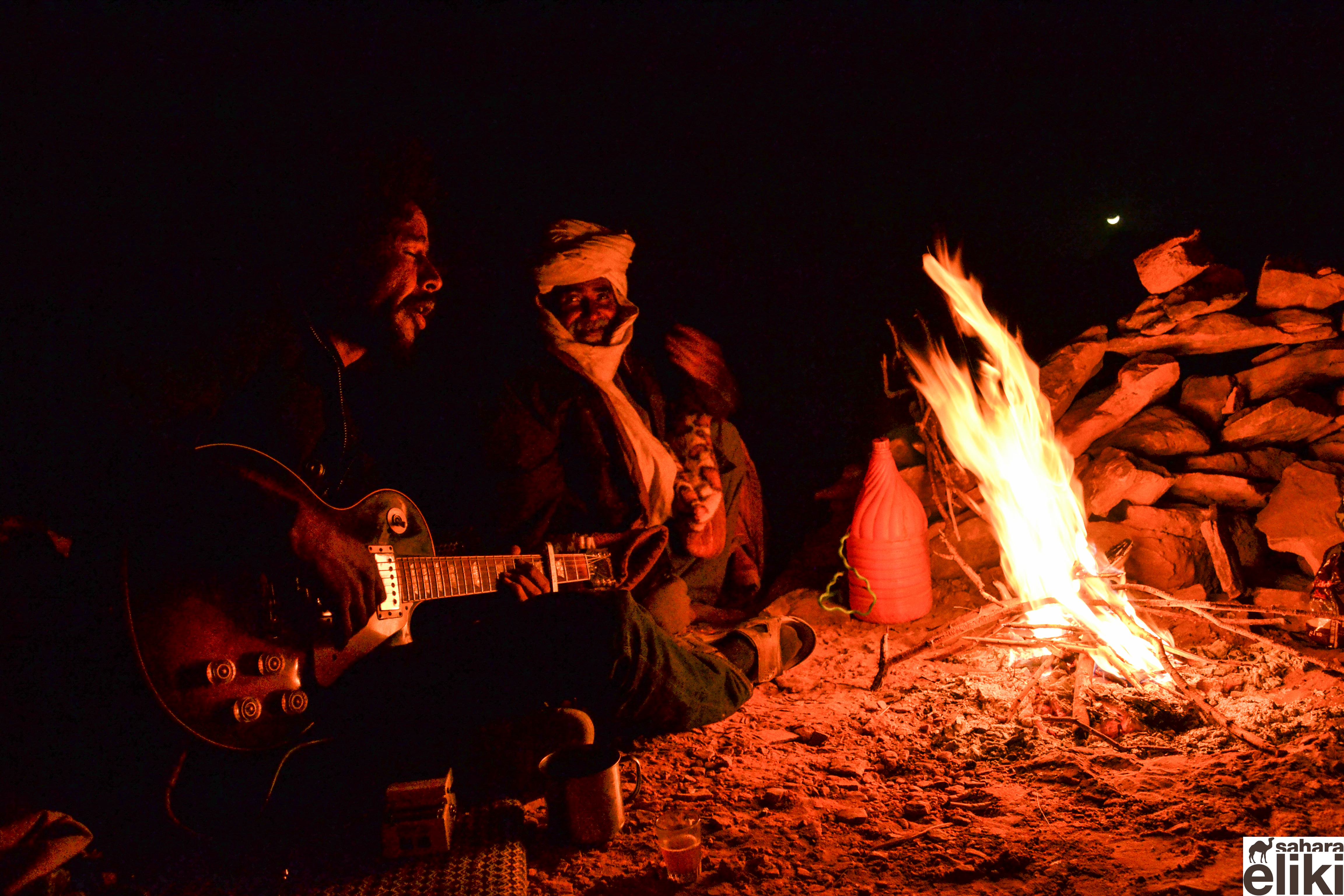 2020年を迎える夜は真っ赤だった。大蛇のような太い薪は空まで舞い上がり、寒気を追い払った。ロバ使いたちは串焼きに石焼の山羊肉を作ってくれて皆で食べた。そしてウスマンはギターを弾き始めた。私が彼に「ギターを持ってきてね」と頼んだ時に、実は彼の手元にはアコースティクギターがなく、そのためアンプと貴重なギプソンをロバに積んで持ってくるとは思いもしなかった。タマンラセットからエヘレルまで700キロ車で走ってから二日間くらい暴れロバと寒さと戦ったウスマンは歌い始めた。ロバ使いのおじさんも傍に来て、とても穏やかな表情を浮べた。何回も聞いたことがあるウスマンの名曲だ。この夜、マリ北部のサハラ砂漠、アザワドのアーティストは、初めてこのダジェラヒン台地の上で演奏したのだった。それはとても感動的な時だった。