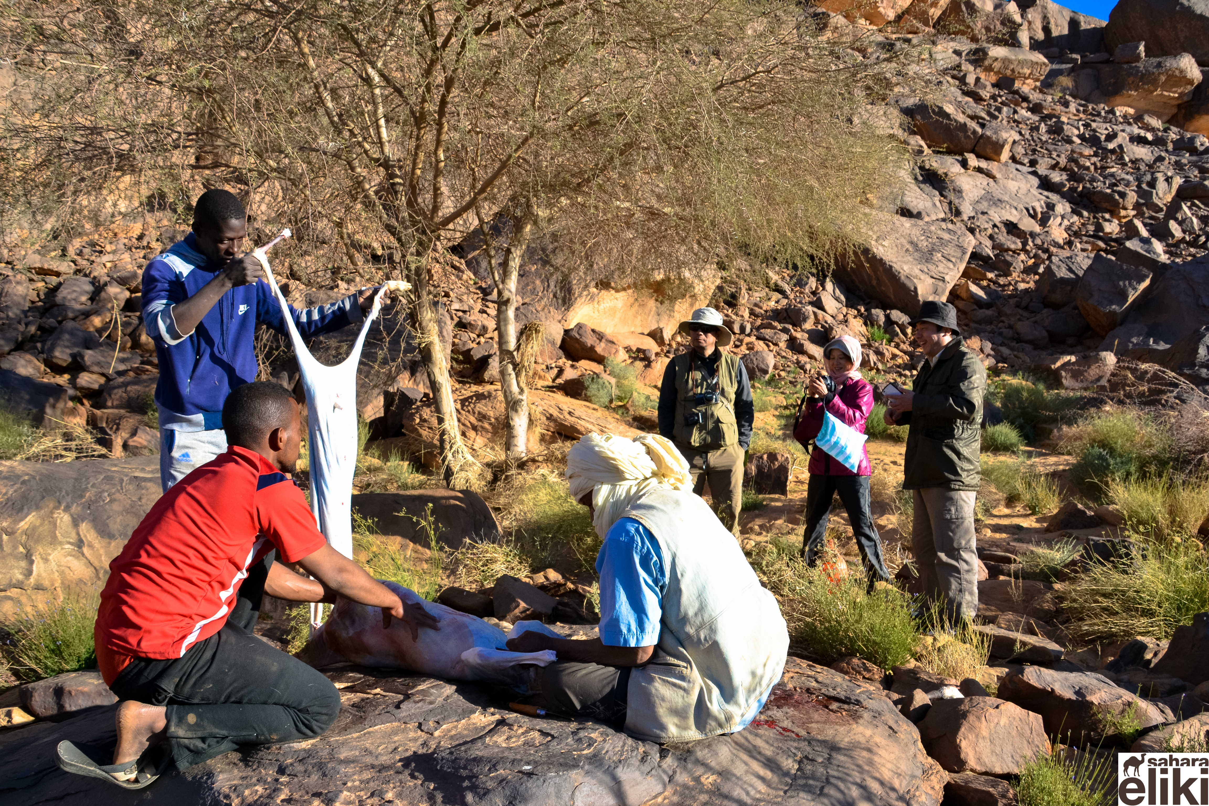 限りなく続く平たい台地のあちらこちらに、ティクミズテンという草が植えて、それをトゥアレグ達が一生懸命拾って大事にポケットにしめた。台地にしかない薬草は百の病を治るという。昼に小さい川が流れているキャニオンについた。ヤシの木もあって、とても綺麗なオアシスだ。青い水を見てつい泳ぎたくなった。私はシャンプーとバケツを用意した。が昼食後とても冷たい風が吹き始めたので、入浴を諦めた。とりあえず昼寝しようと思ったが、日なたは暑く、日影は寒いという落ち着かない天気だ。ガイドのアイサに聞くと散歩はできるという。がこの周囲には岩絵がないうえに石の上は歩きにくい。暇だね…とため息ついたら、向こうの岸の岩に山羊の群が現れた。そうだ!暇つぶしに山羊を殺すのだ!