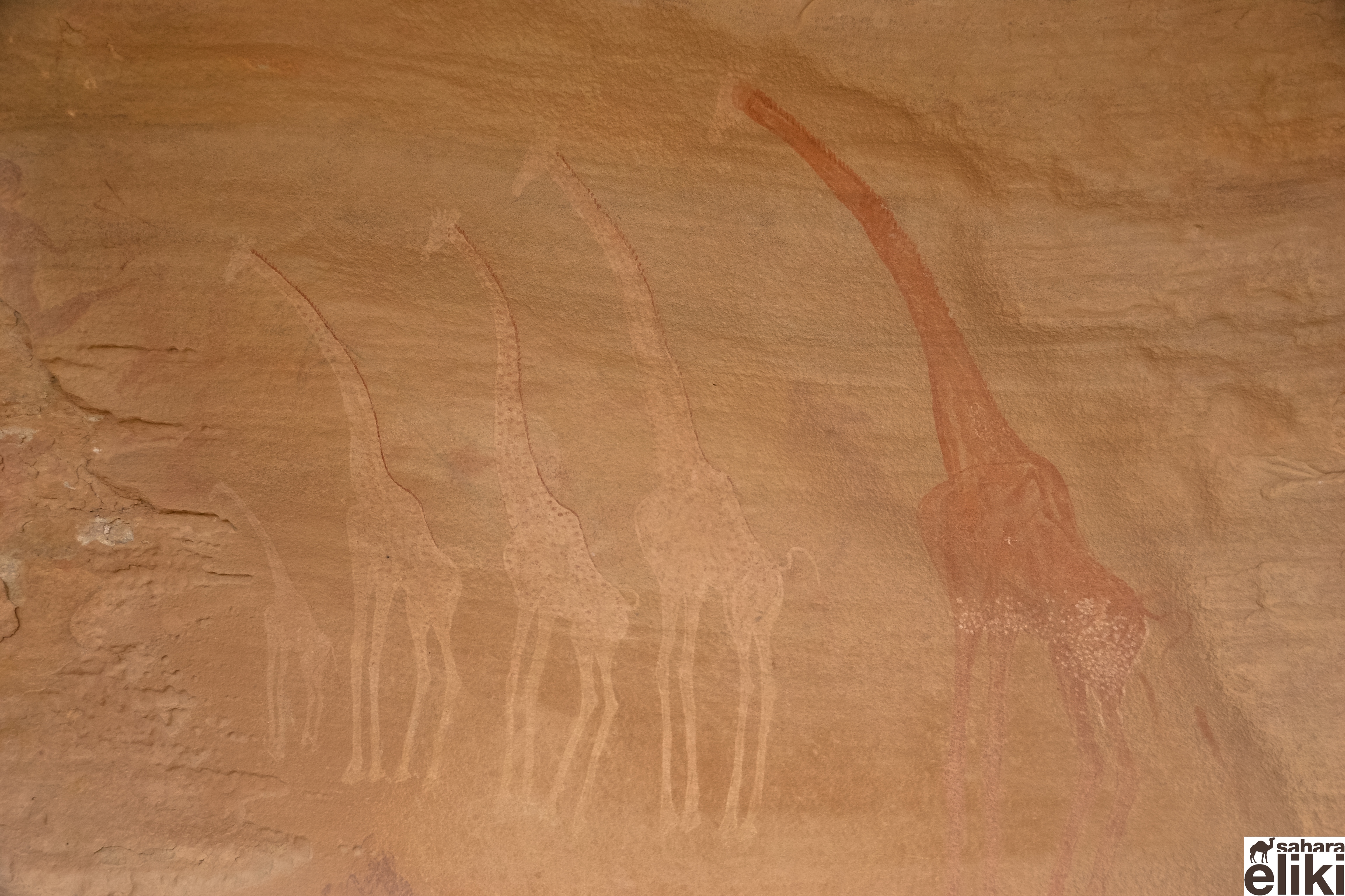 大晦日だ。今日は風が冷たいし、日差しがほとんどないとても寒い日だ。灰色の台地をひたすら歩くとイヘーレンに着いた。弓を持った狩猟をする男たちがライオンを追いかけている。後ろからはエレガントな服装と髪型を持つ女性たちが牛に乗って続き、その後ろからも大きな角の持つ牛や山羊の群がついていく。その下にはキリンの模様が繊細に点々と描かれる。このように様々な遊牧民の日常生活のシーンが描かれているイヘレンのフレスコの岩面は9m x 3mだ。そしてこれはほぼ一人のアーティストの作品でそのことも非常に珍しいものだ。1970年に考古学者アンリ・ロートに発見されてからほとんど顧みられていないが、紀元前3000年〜の岩絵は今まで見たことがない繊細な筆遣いで、まるで現代アートである。これはタジェラヒン台地にしかいなかった白人系の遊牧民が描いたものだと知るともっと驚く。