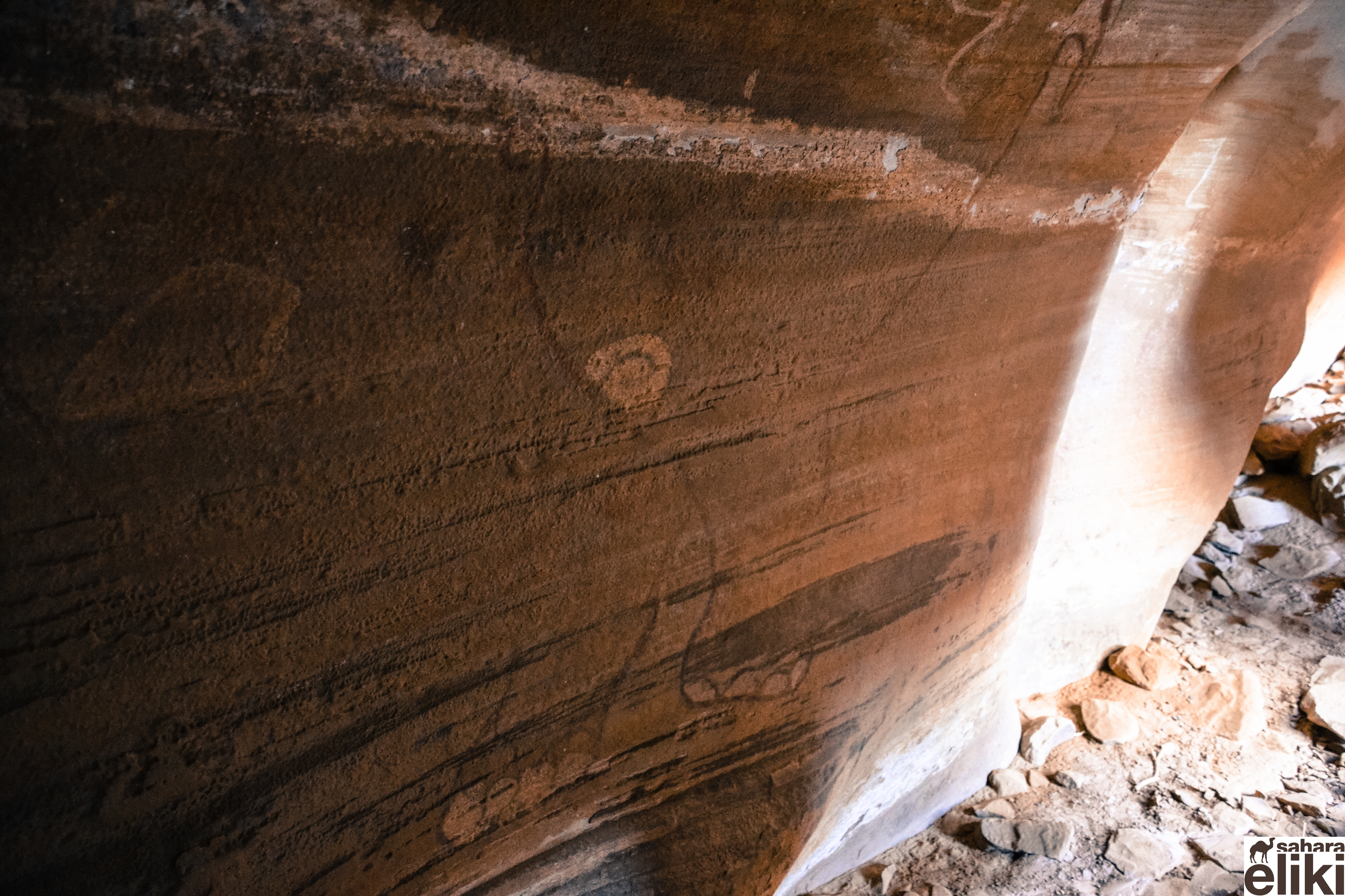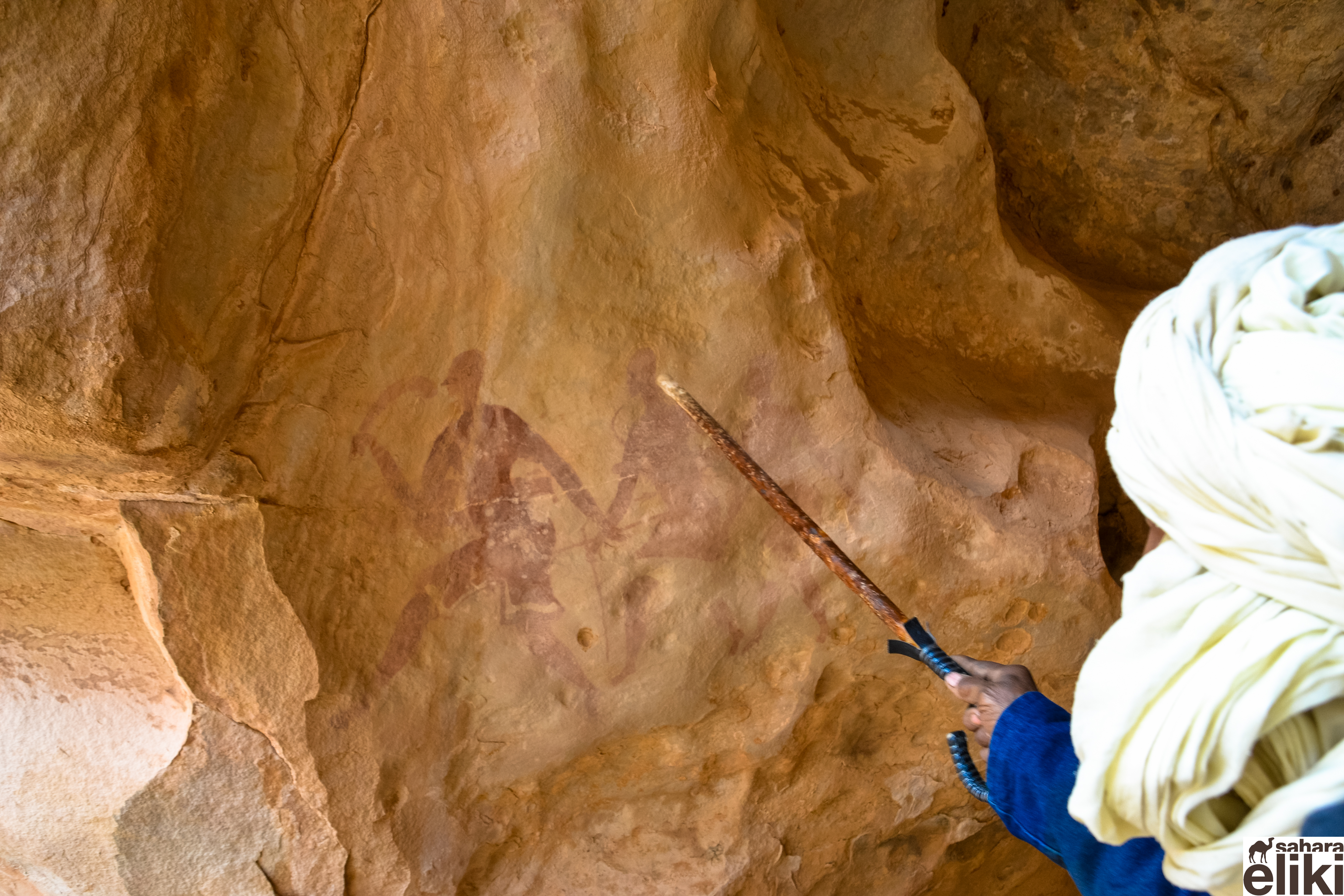 Tin Abenharに着くと緑だった時代の砂漠を蘇らせる岩絵を発見した。牛、キリン、猟師、そして謎の絵もたくさん。神か人間か。それぞれの想像力を刺激するアートだ。キャンプで昼食を食べてからまた2時間くらい砂漠を歩いたら、もっとも驚きの発見があった。岩陰にほぼ等身大のカバ一匹がいた!しかも抽象的でとてもモダンな絵だった。同行するウスマンも目が点になった。彼は大昔はサハラ砂漠が緑だったことを、これではじめて知ったのだ。紀元前5000年ごろから、カバはだんだん枯れてくるサバンナの目撃者として、砂漠のど真ん中に生き残っていた。