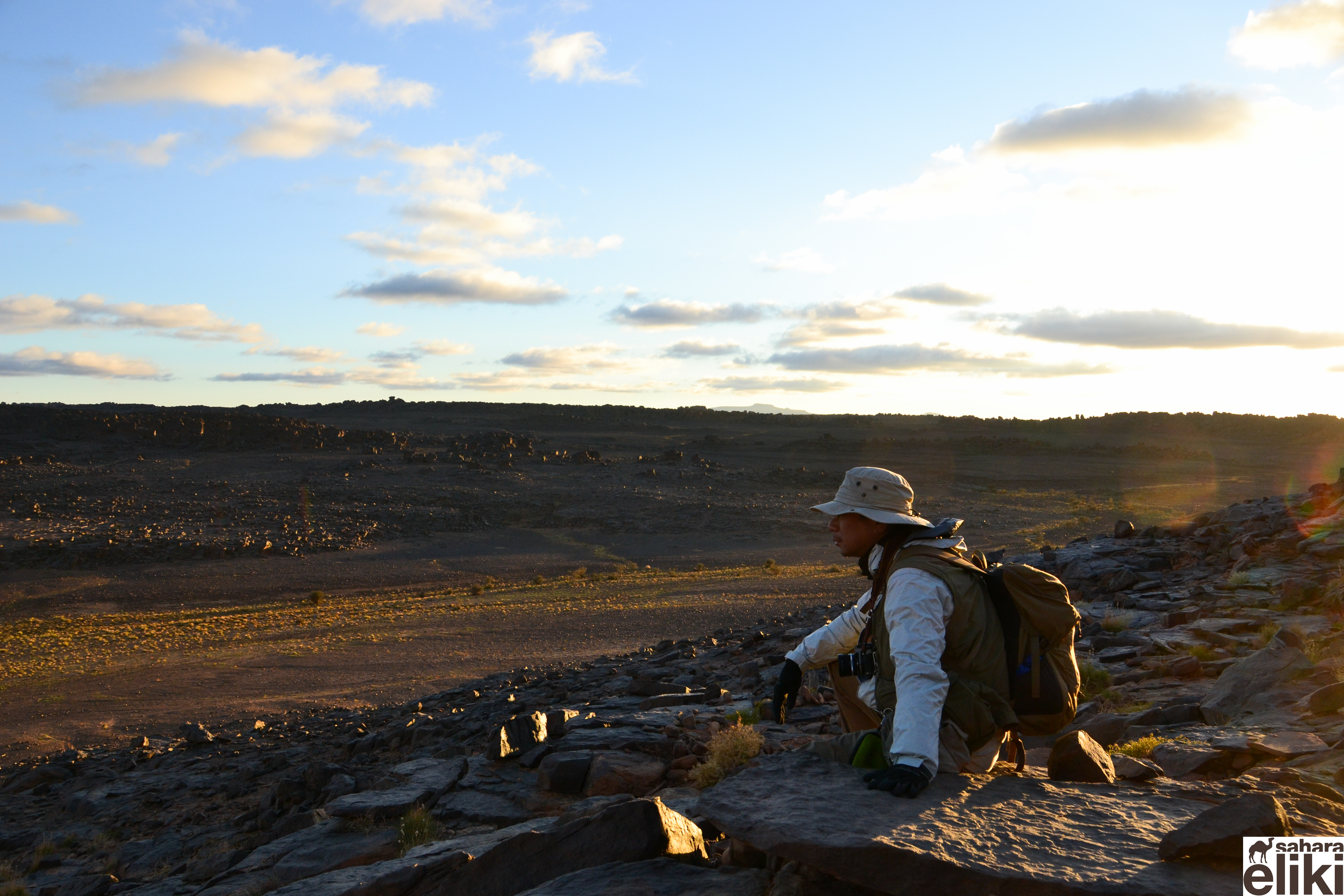 河馬の岩絵を見てからさらにキャンプへ戻った。台地を歩くととても冷たい風が吹き、ウスマンは急にライターで草むらを火につけた。何しているの!と叫ぶと、彼がただ寒いから一瞬燃え尽くす炎でも温まる気分だ。それで2時間の間、いくつかの焼きついた草むらへ手を伸ばした。まるで燃える柴の前のモーセ(笑)。やっとキャンプ近辺に着くと、氾濫地を見下ろす夕焼けを眺めた。これから冷え込む夜だが、ウスマンがどこか秘密の洞窟を見つけてくれた、
