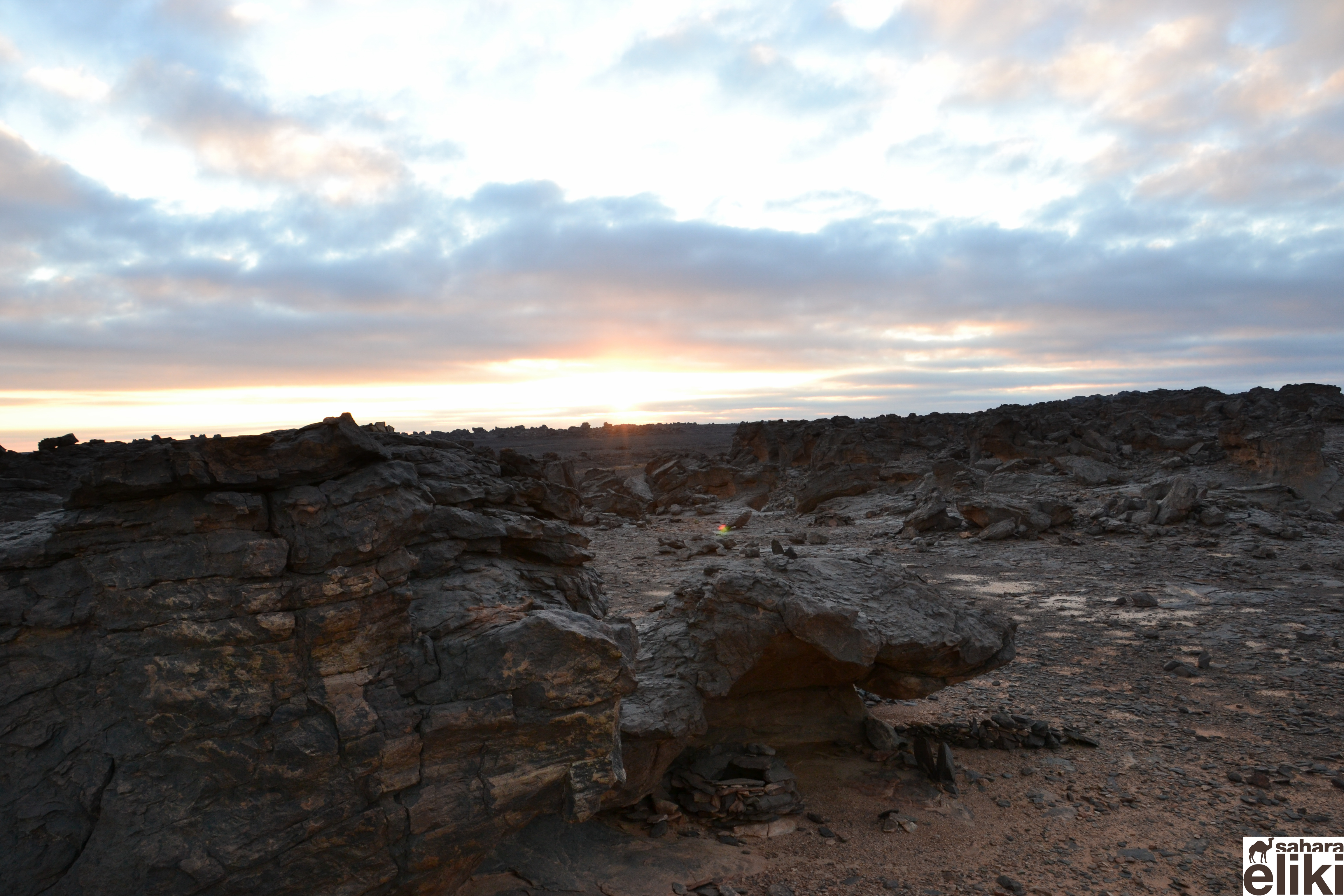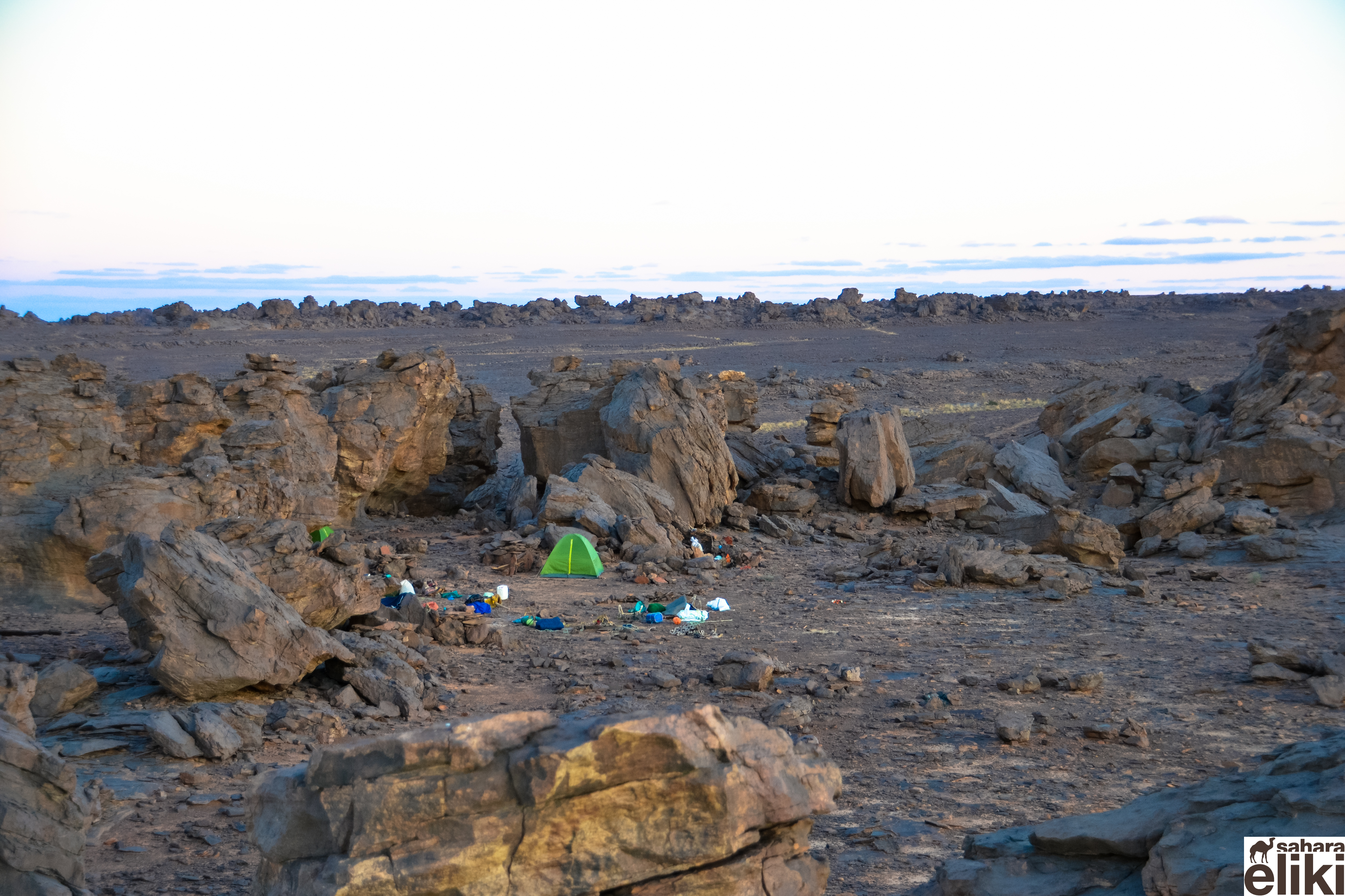 雨が夜中に急に降ったので岩穴で寝て本当に正解だった。目が覚めると、氾濫地を見下ろす景色もばっちり。まだ寒い一日になりそうだが太陽が光り、ここで皆で一枚の記念写真を撮った。日本人の技師やリフォーム業者、トゥアレグのロバ使い、ギタリスト、謎のジャーナリスト、、多様な人種が集まるグループだ!