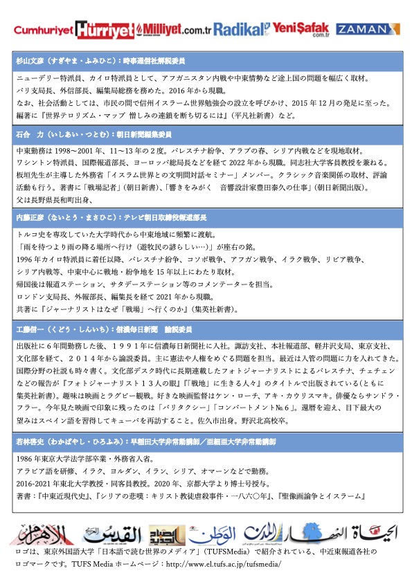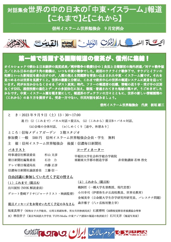 「第一線で活躍する国際報道の俊英が、信州に集結! オイルショックで終わる日本経済の高度成長╱湾岸戦争の戦費5分の1負担と自衛隊初の海外派遣╱対テロ戦争協力╱これら日本の曲がり角の動機は、いつも中東の戦争でした。泥沼のウクライナ戦争下で、サウジとイランの和解といった新局面を産み出すのが、人類の抱える問題群を背負い込まされた中東・イスラーム圏です。それを見つめるのは世界を見渡すこと。世界の激動と分断は、これまで欧米中心の世界の報道システムに変身を迫っています。何が本当か分らなくさせる「ポスト真実」時代、フリーの報道者の活躍、情報の送り手・受け手の区別なくすSNS、通信技術の進化とデータの多面体化に加え、軽視・看過されてきた地域の隅々が、うごめきだしたからです。中東・イスラーム圏を覗き窓にして、報道界のヴェテランの方々とともに、世界の新しい情報循環の〈これから〉のあり方を提言する、受身一方でない、市民対話を試みましょう」。