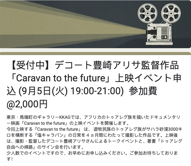 今回上映する「Caravan to the future」 は、 遊牧民族のトゥアレグ族がサハラ砂漠3000キロを横断する「塩キャラバン」の日常を4ヵ月間にわたって撮影した作品です。上映後は、撮影・監督したデコート豊崎アリサさんによるトークイベントと、著書「トゥアレグ 自由への帰路」のサイン会を行います。