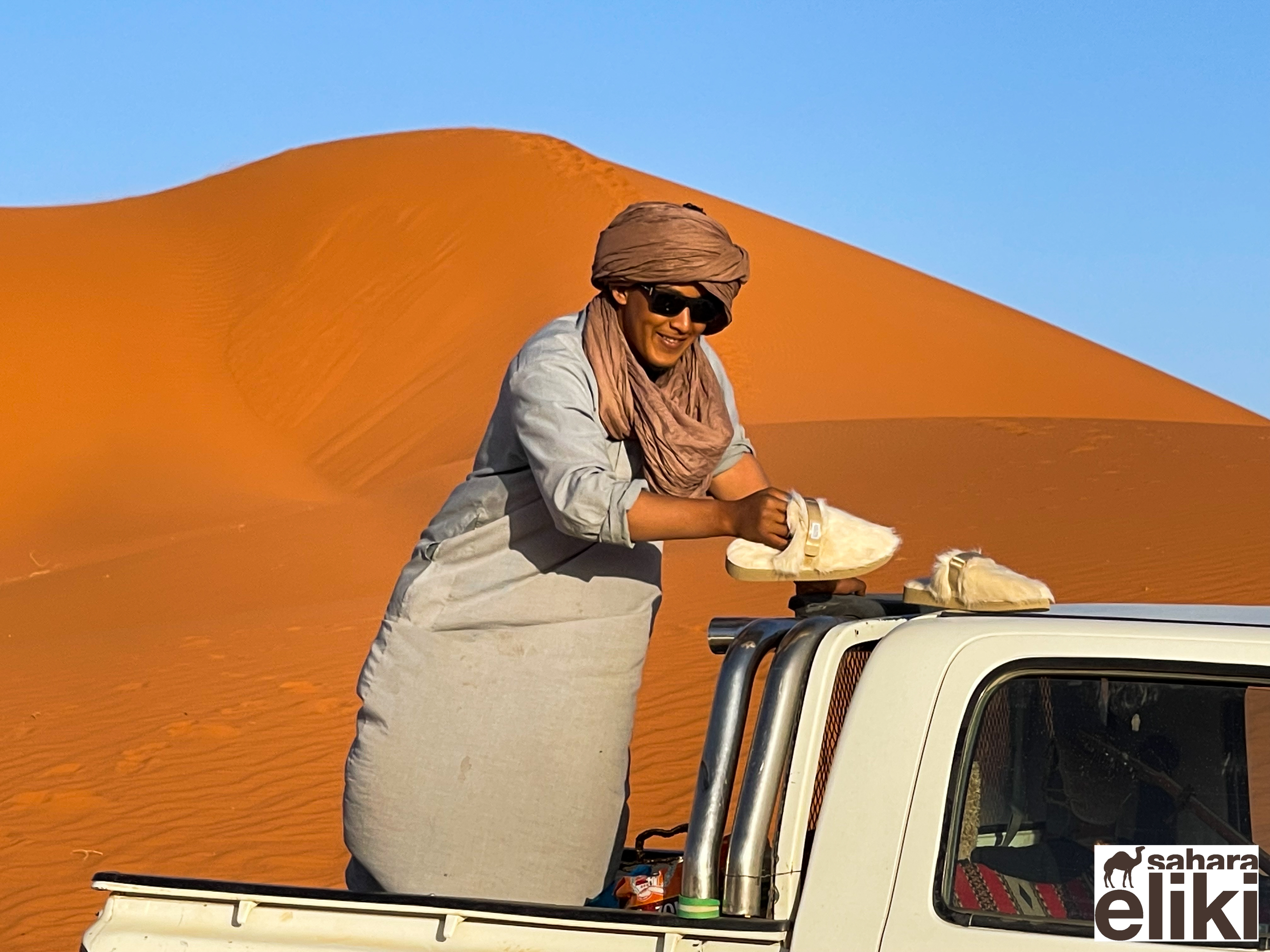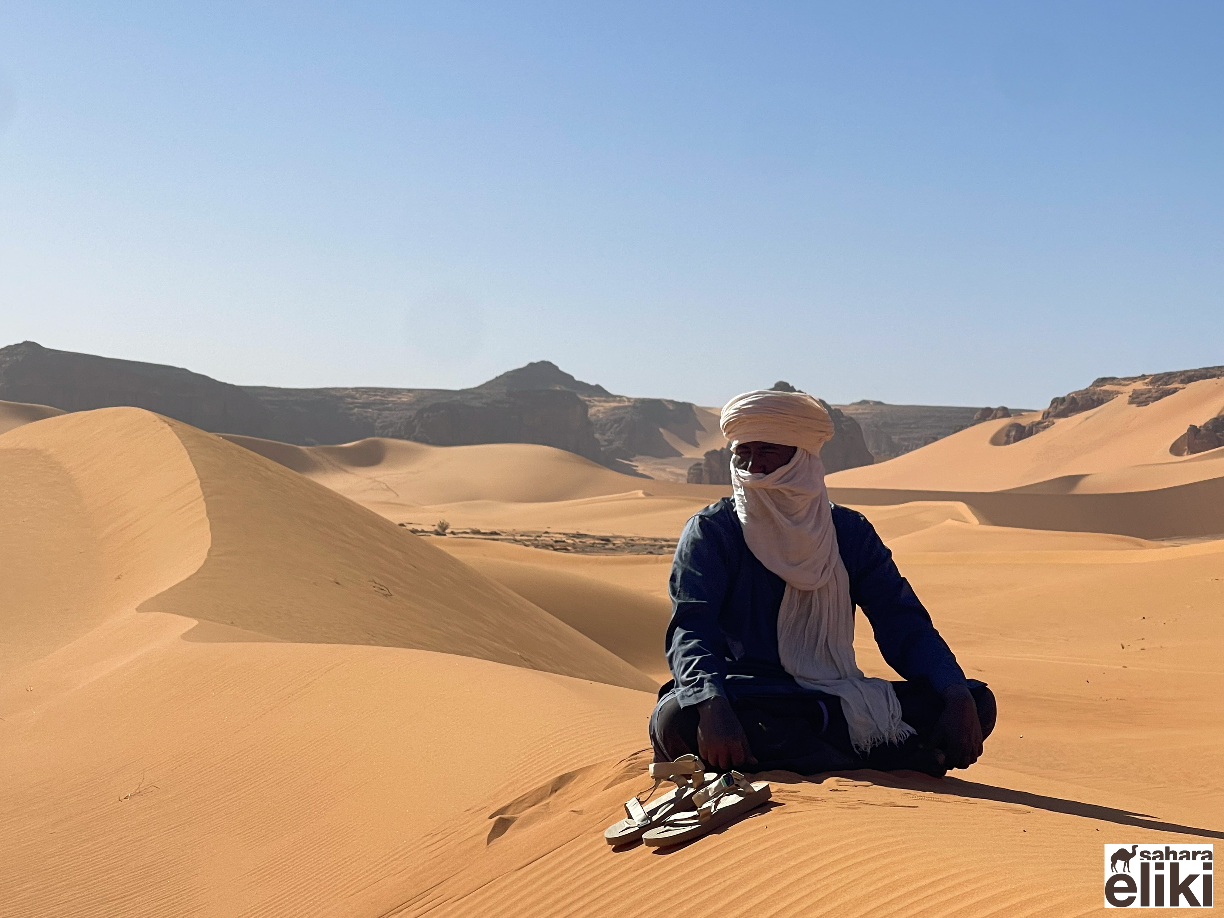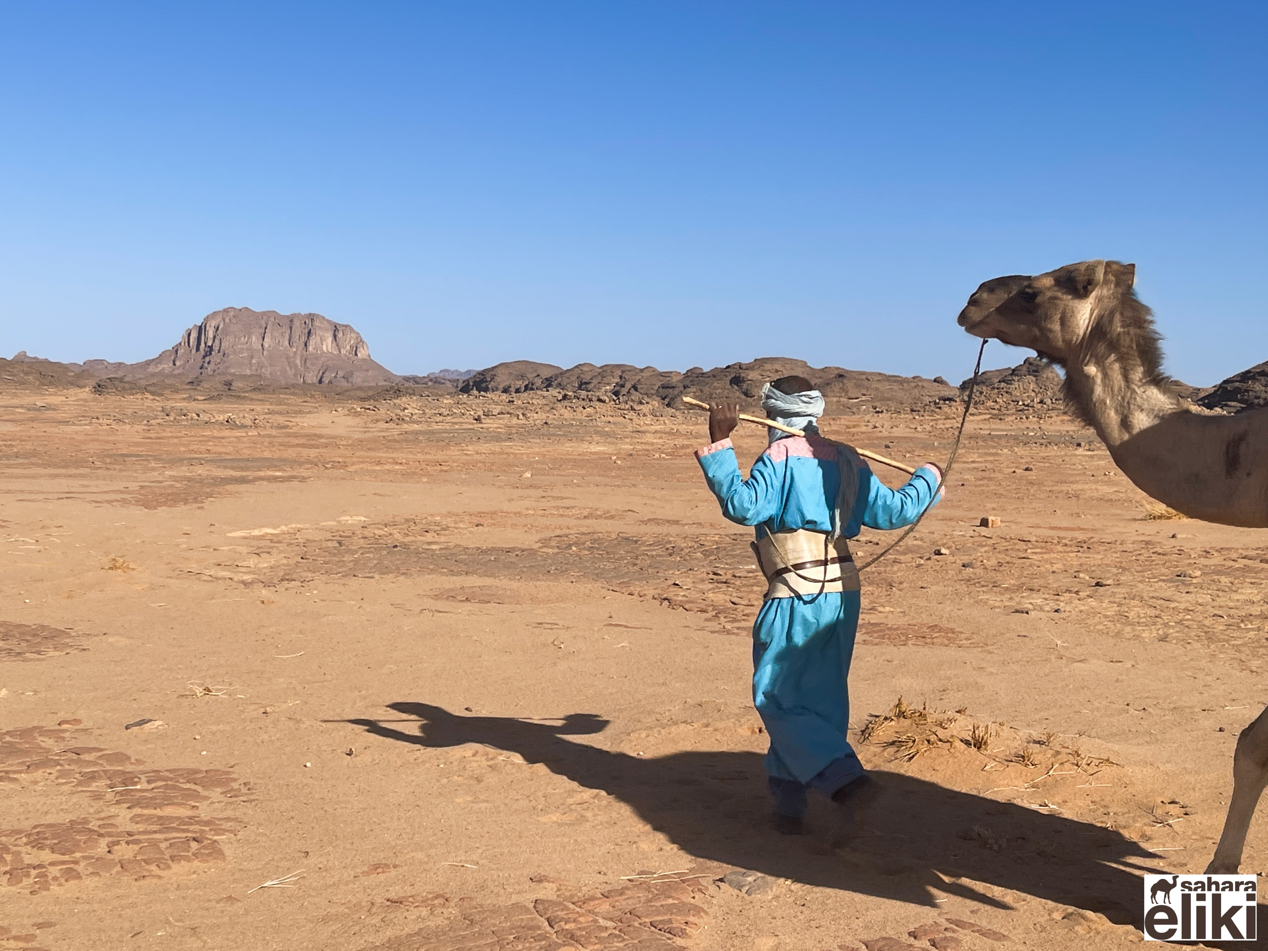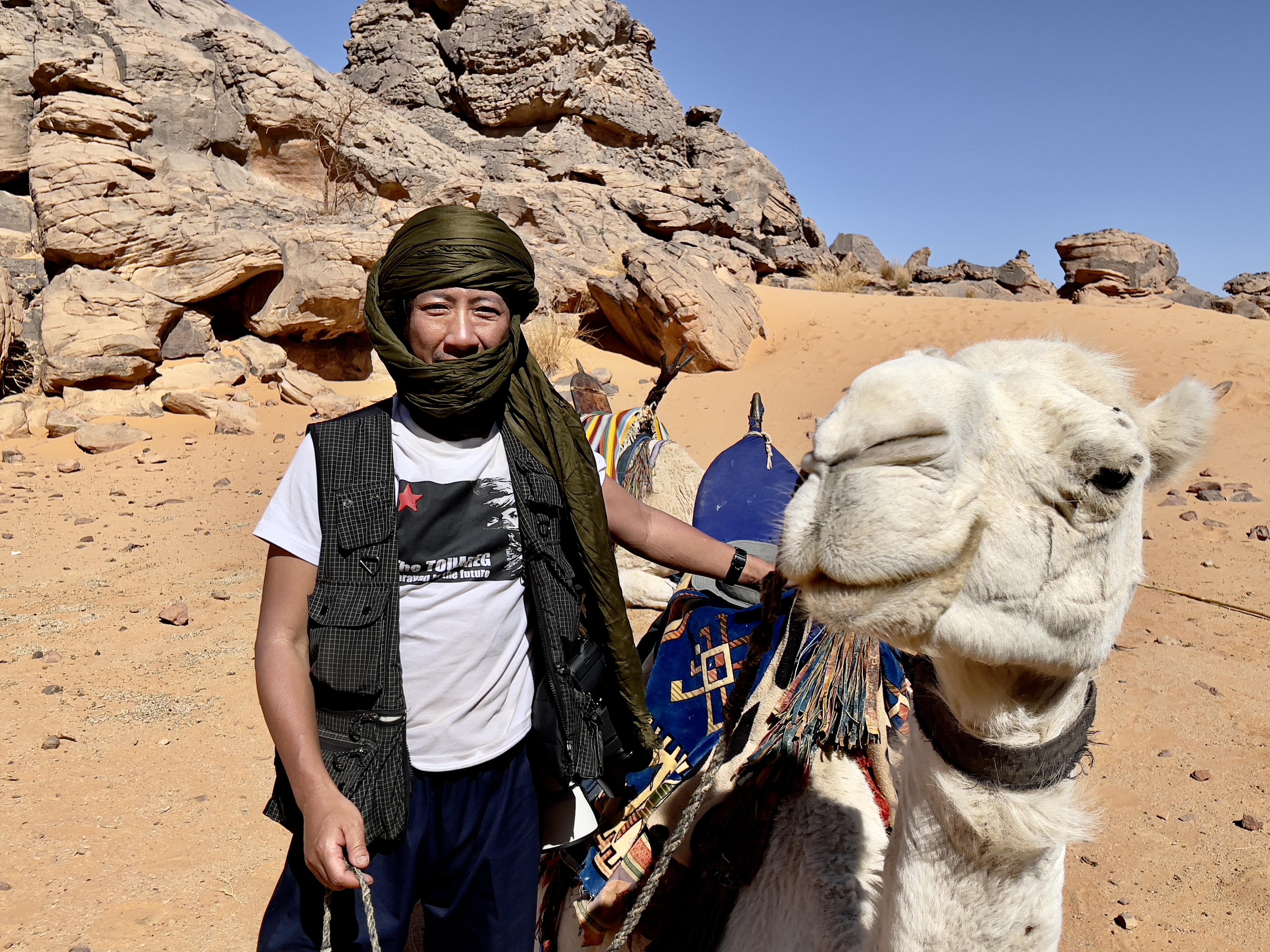 2023年3月、日本のシューズブランド「スイコック」からトゥアレグ族と旅をしながらカタログ撮影をしたいという依頼があって、そのための特別なエリキツアーを企画しました。友人のカメラマン名越啓介さんが紹介してくれたスイコックは、日本のブランド企業としてはじめてアルジェリアの砂漠を舞台にすることを決めました。ジャネットからリビアの国境に広がる「赤いタドラート」は、オレンジ色の砂丘を囲む巨大な岩盤の稀有な景色が150キロも広がり、麒麟や象の岩絵もたくさん残っている絶景です。モロッコの砂漠と違って誰もすれ違いませんでした。二週間目はタッシリナジェール砂漠を7人のトゥアレグとラクダ15頭のキャラバンと一緒に移動しながら、スイコックの撮影が続きました。ソーラーパネルが付いたラクダの上で、手綱を持ちながら写真を撮る名越さんの姿を見て、「これはサハラ・エリキだ!」と私は自慢を覚えました。ラクダ乗りを教えるのも、自然エネルギーで砂漠を撮影するコツも、サハラ.エリキの大事な使命です!アルジェリアの砂漠で撮影されたスイコックのカタログは来年出版される予定です。