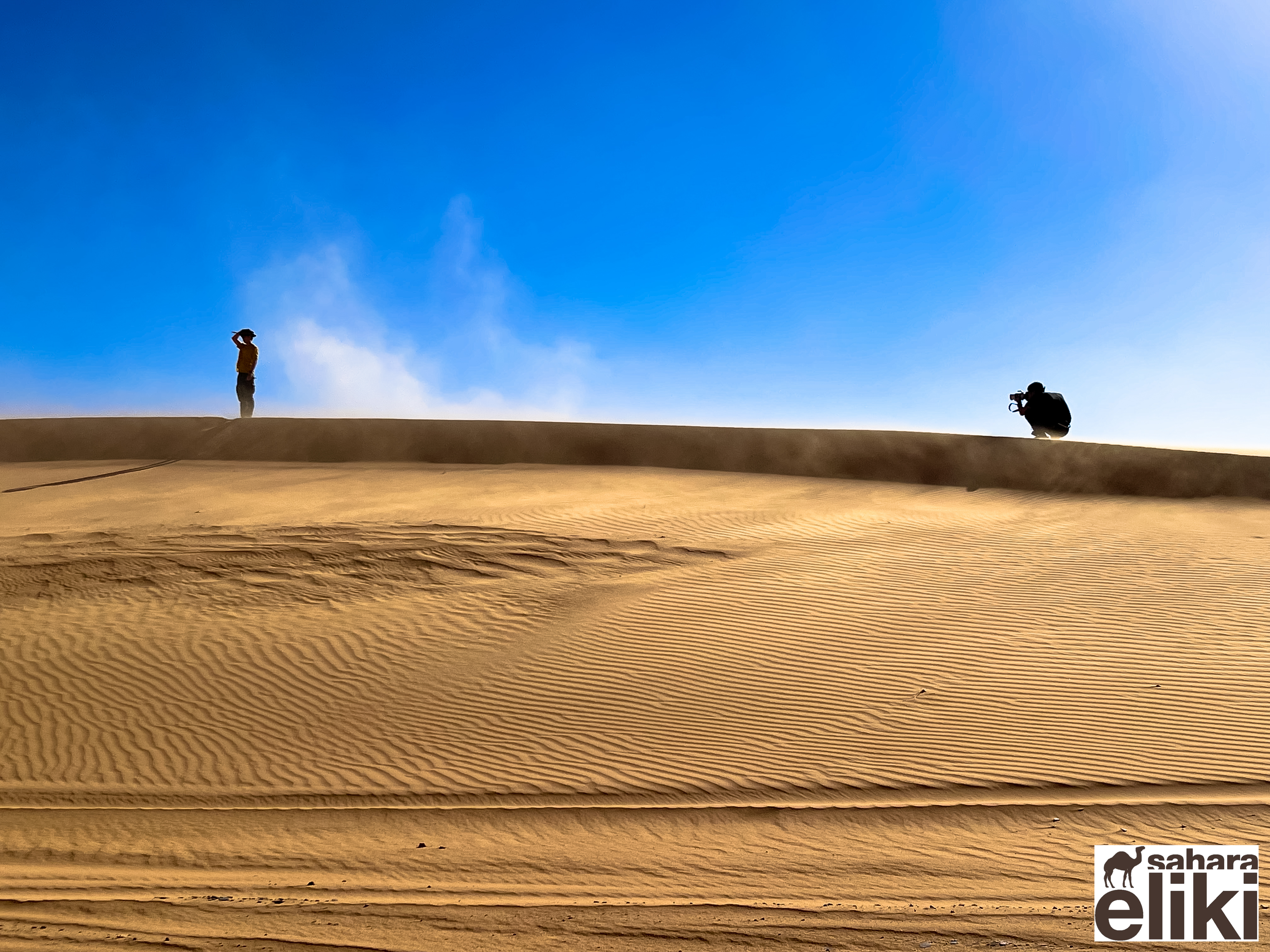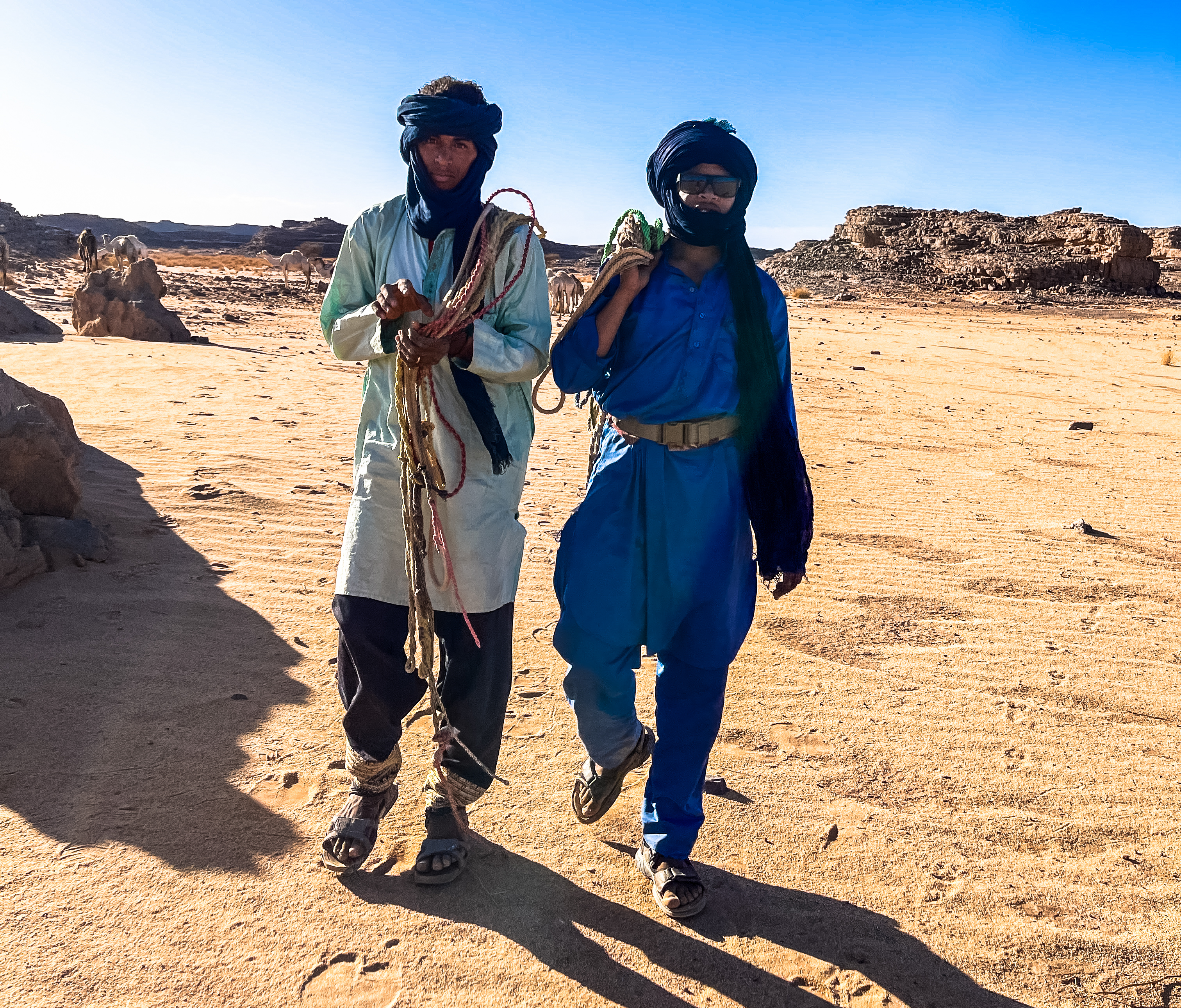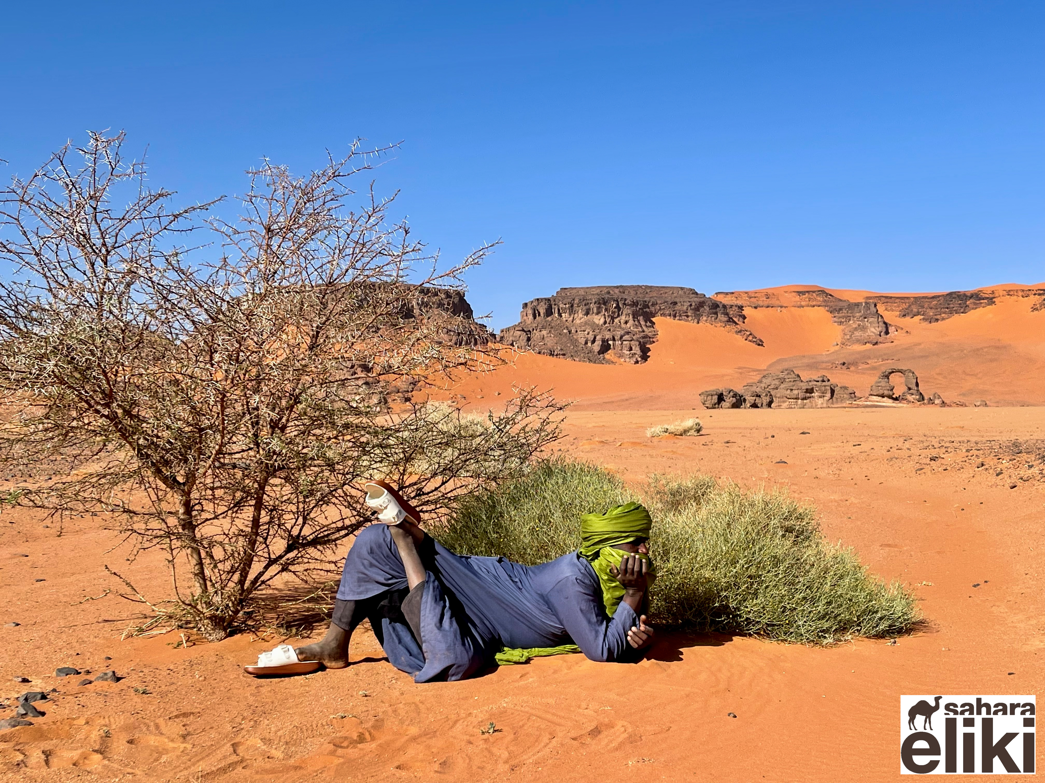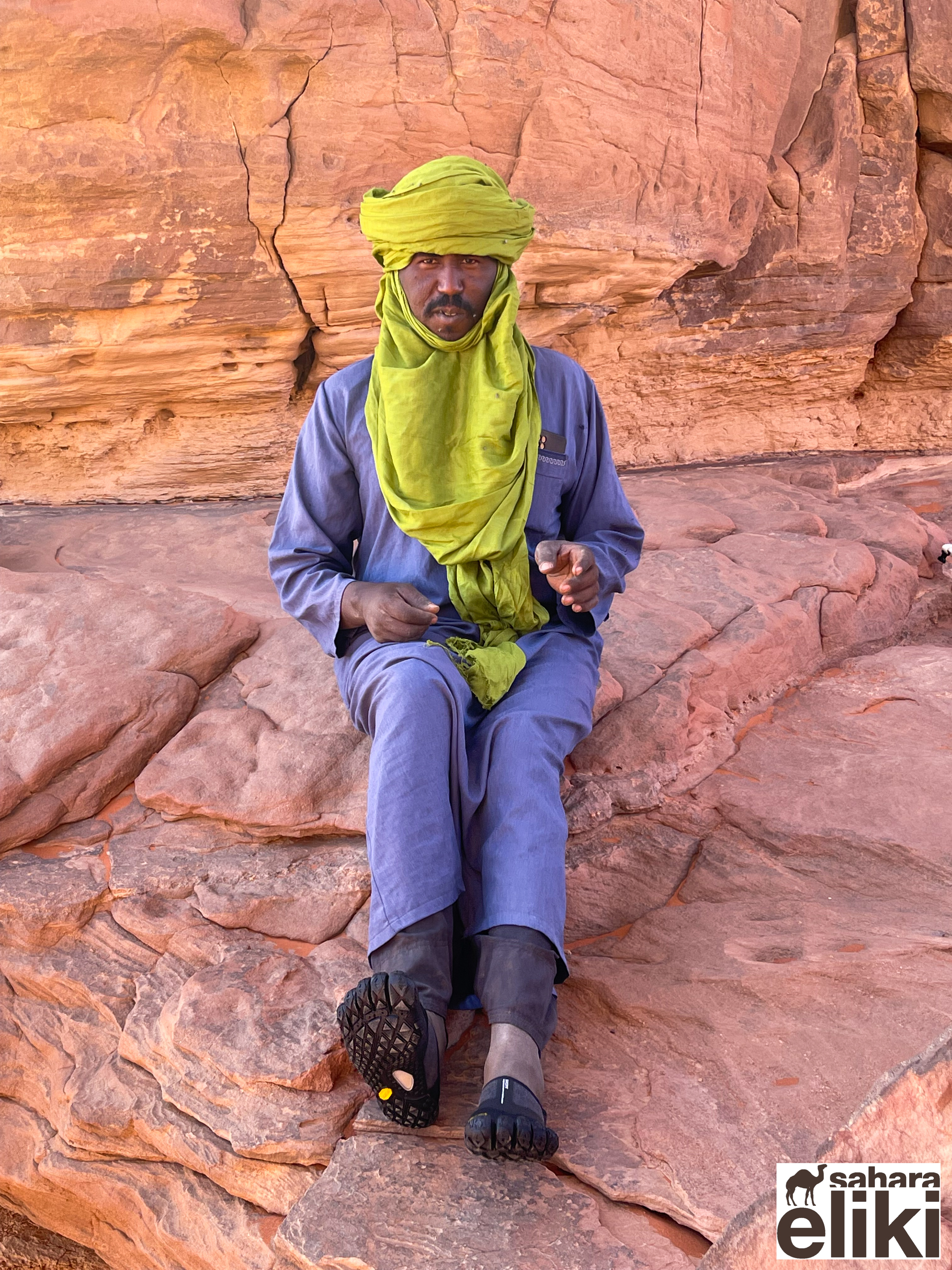 2023年3月、日本のシューズブランド「スイコック」からトゥアレグ族と旅をしながらカタログ撮影をしたいという依頼があって、そのための特別なエリキツアーを企画しました。友人のカメラマン名越啓介さんが紹介してくれたスイコックは、日本のブランド企業としてはじめてアルジェリアの砂漠を舞台にすることを決めました。ジャネットからリビアの国境に広がる「赤いタドラート」は、オレンジ色の砂丘を囲む巨大な岩盤の稀有な景色が150キロも広がり、麒麟や象の岩絵もたくさん残っている絶景です。モロッコの砂漠と違って誰もすれ違いませんでした。二週間目はタッシリナジェール砂漠を7人のトゥアレグとラクダ15頭のキャラバンと一緒に移動しながら、スイコックの撮影が続きました。ソーラーパネルが付いたラクダの上で、手綱を持ちながら写真を撮る名越さんの姿を見て、「これはサハラ・エリキだ!」と私は自慢を覚えました。ラクダ乗りを教えるのも、自然エネルギーで砂漠を撮影するコツも、サハラ.エリキの大事な使命です!アルジェリアの砂漠で撮影されたスイコックのカタログは来年出版される予定です。