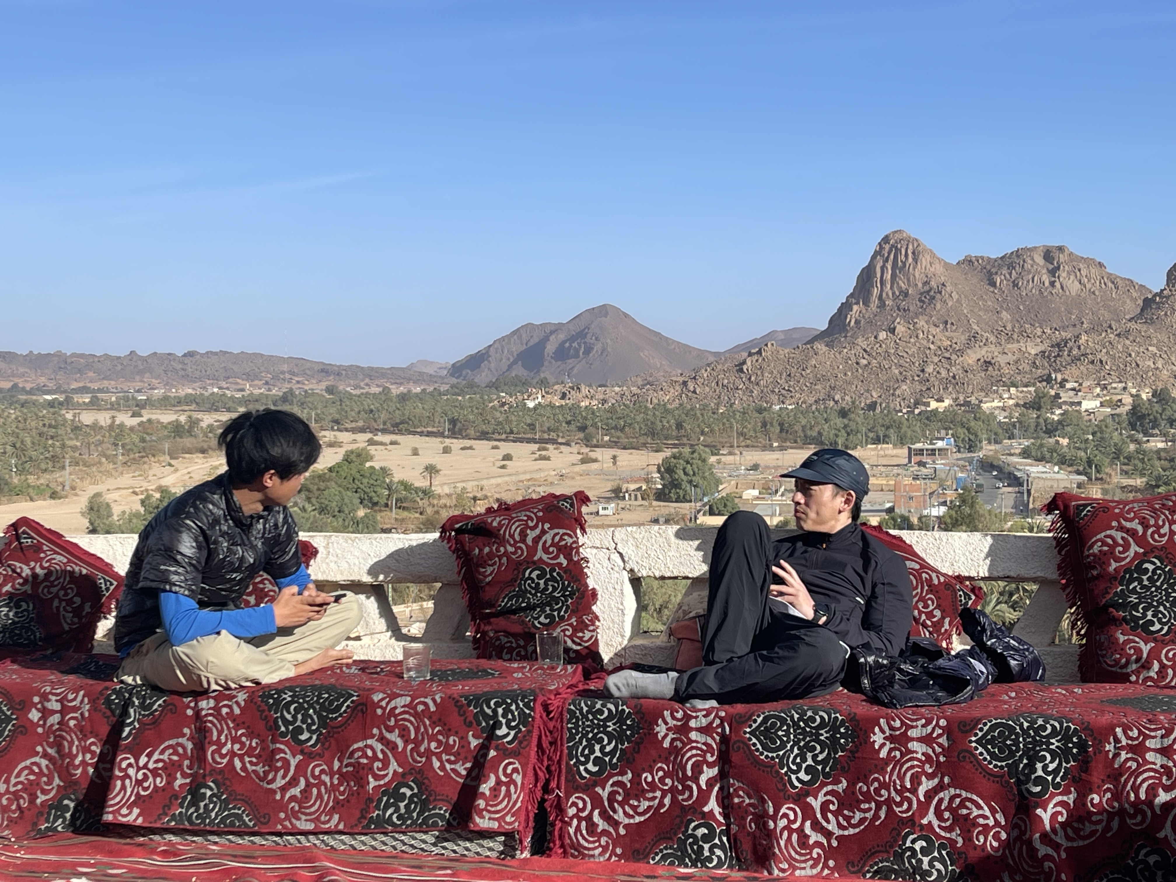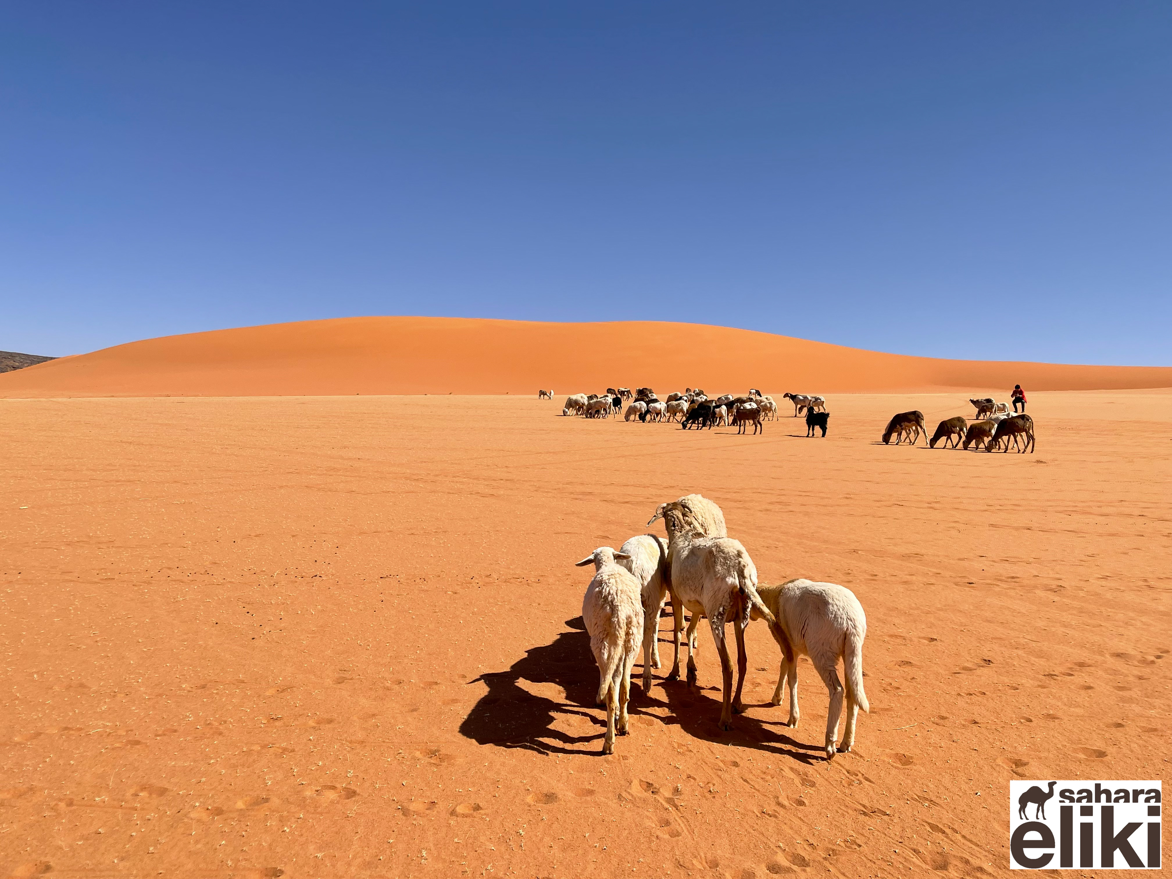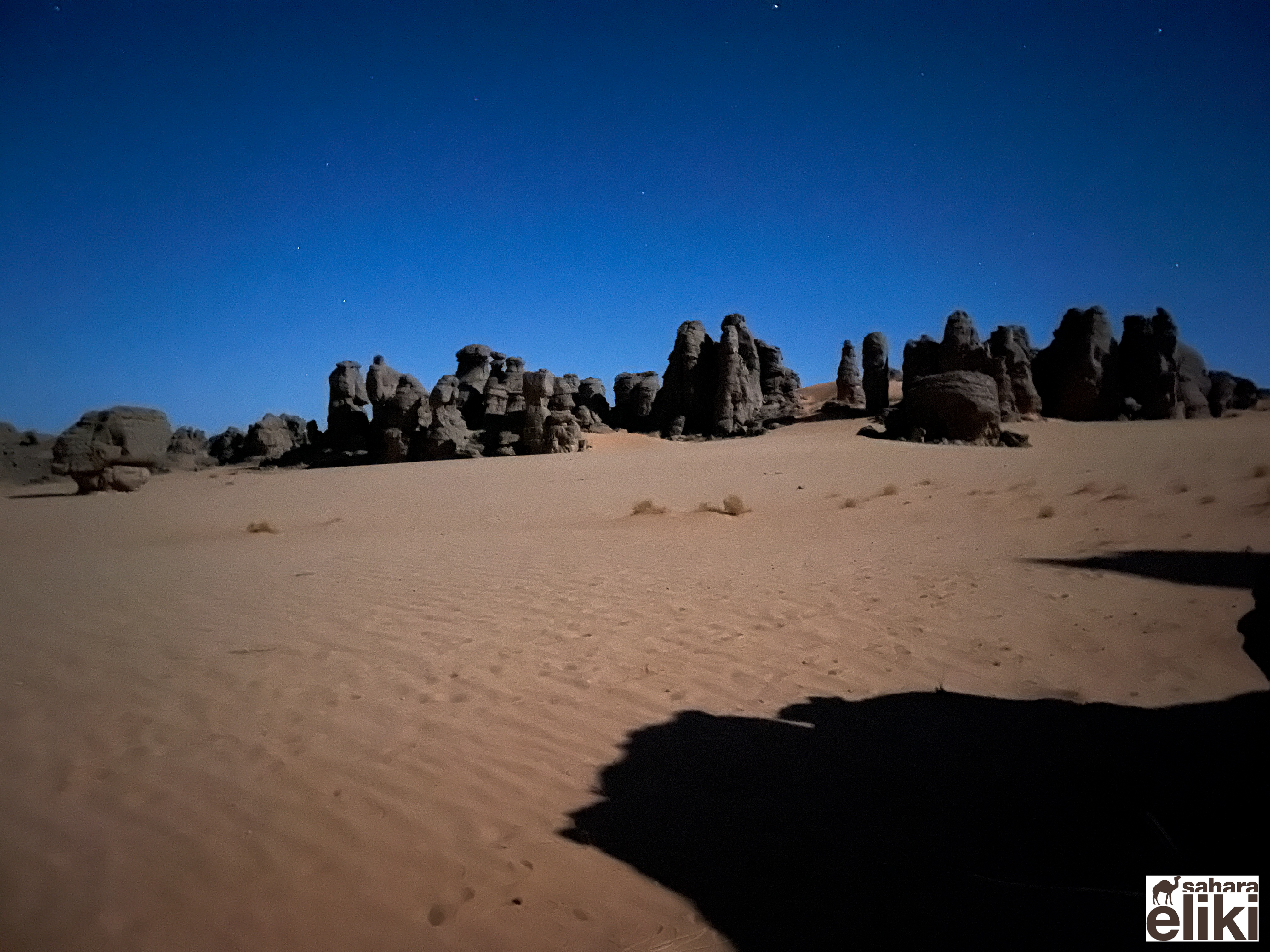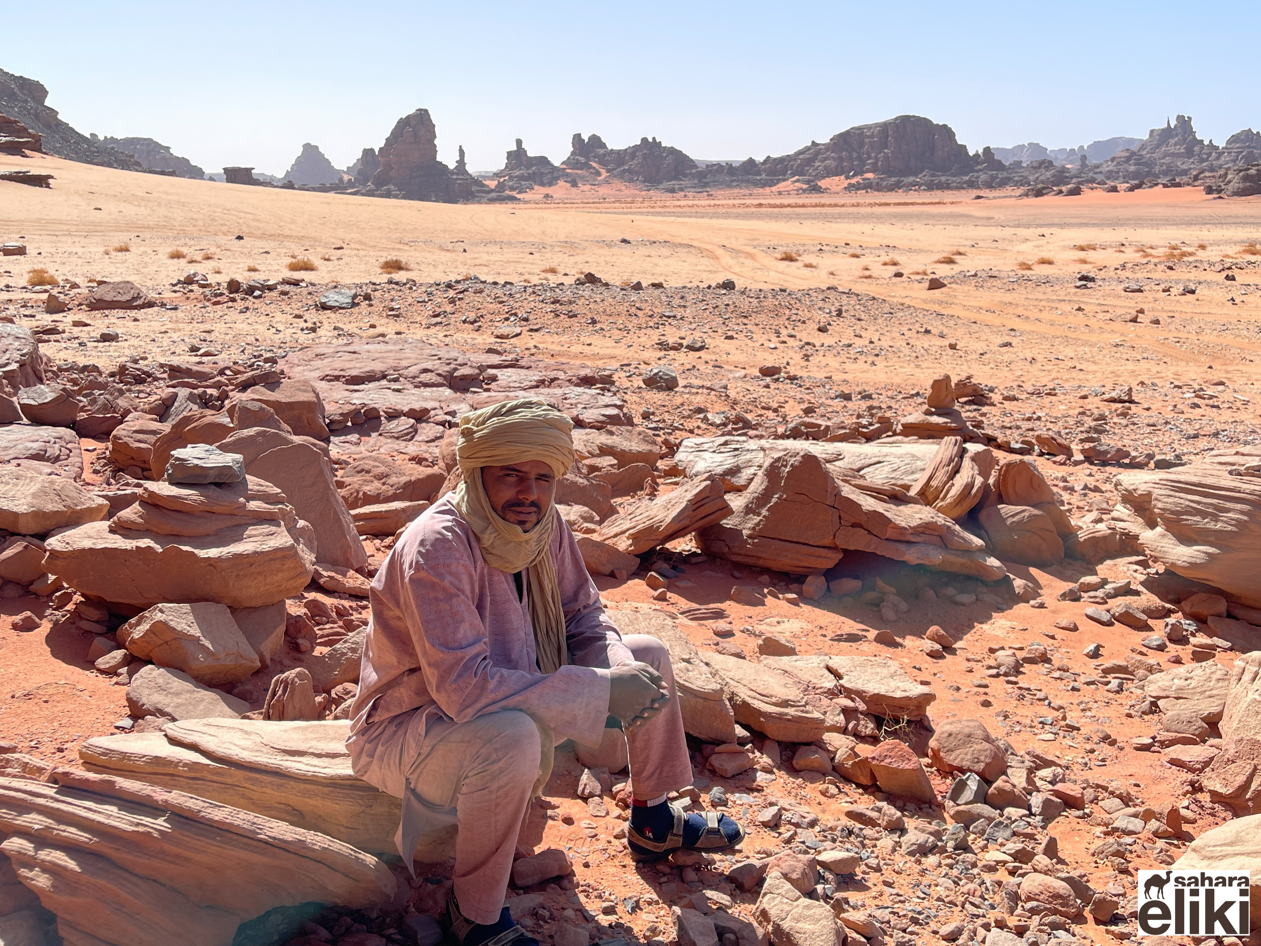 2023年3月、日本のシューズブランド「スイコック」からトゥアレグ族と旅をしながらカタログ撮影をしたいという依頼があって、そのための特別なエリキツアーを企画しました。友人のカメラマン名越啓介さんが紹介してくれたスイコックは、日本のブランド企業としてはじめてアルジェリアの砂漠を舞台にすることを決めました。ジャネットからリビアの国境に広がる「赤いタドラート」は、オレンジ色の砂丘を囲む巨大な岩盤の稀有な景色が150キロも広がり、麒麟や象の岩絵もたくさん残っている絶景です。モロッコの砂漠と違って誰もすれ違いませんでした。二週間目はタッシリナジェール砂漠を7人のトゥアレグとラクダ15頭のキャラバンと一緒に移動しながら、スイコックの撮影が続きました。ソーラーパネルが付いたラクダの上で、手綱を持ちながら写真を撮る名越さんの姿を見て、「これはサハラ・エリキだ!」と私は自慢を覚えました。ラクダ乗りを教えるのも、自然エネルギーで砂漠を撮影するコツも、サハラ.エリキの大事な使命です!アルジェリアの砂漠で撮影されたスイコックのカタログは来年出版される予定です。