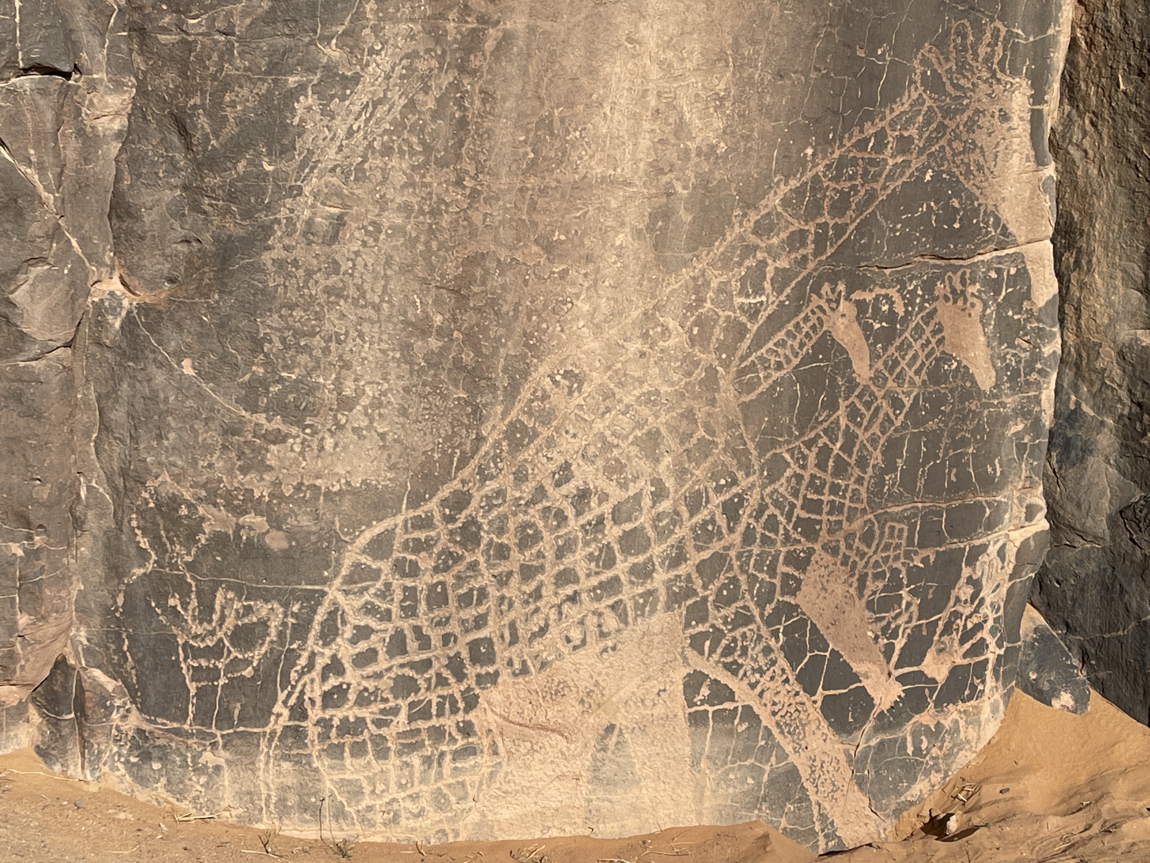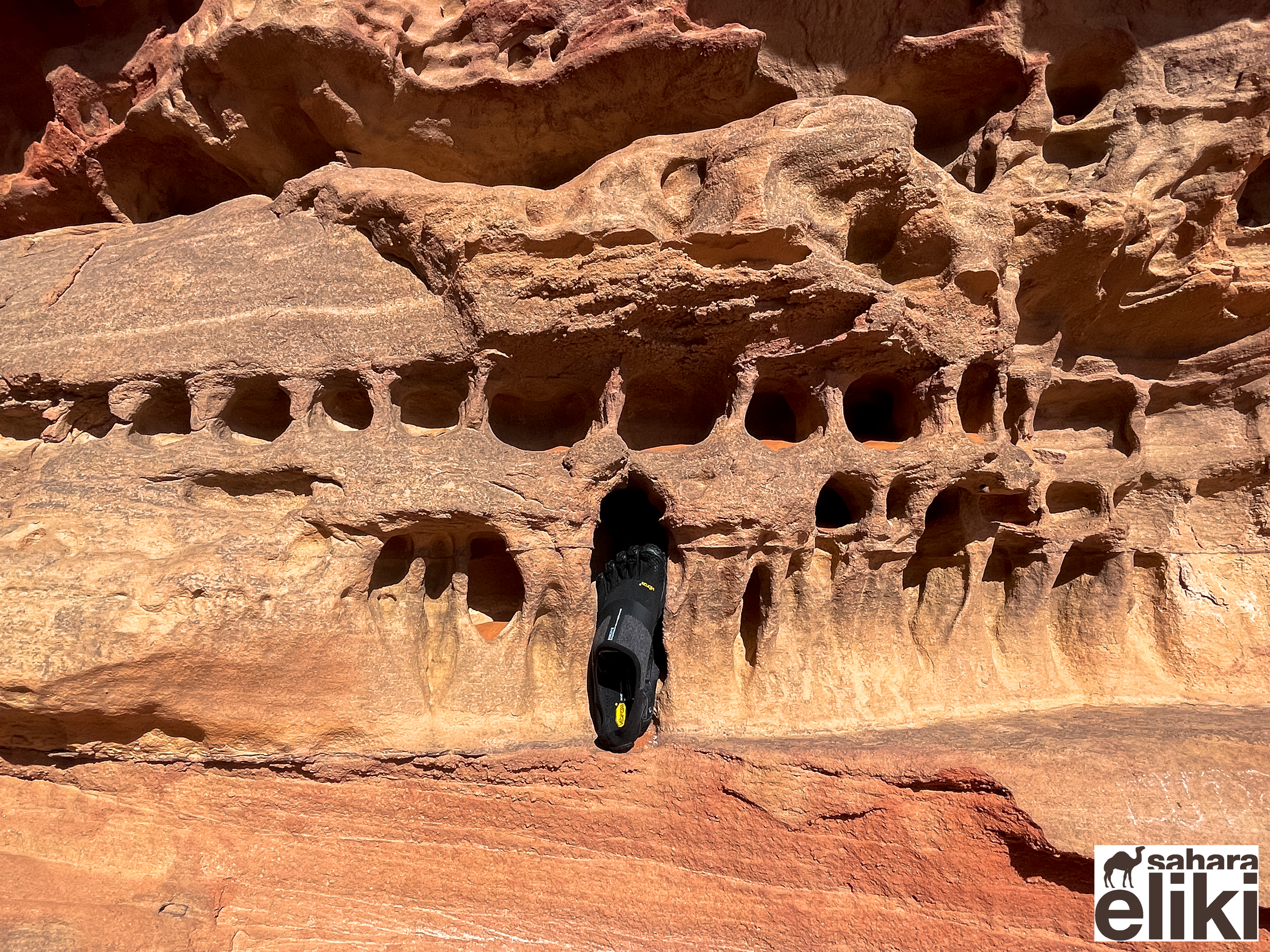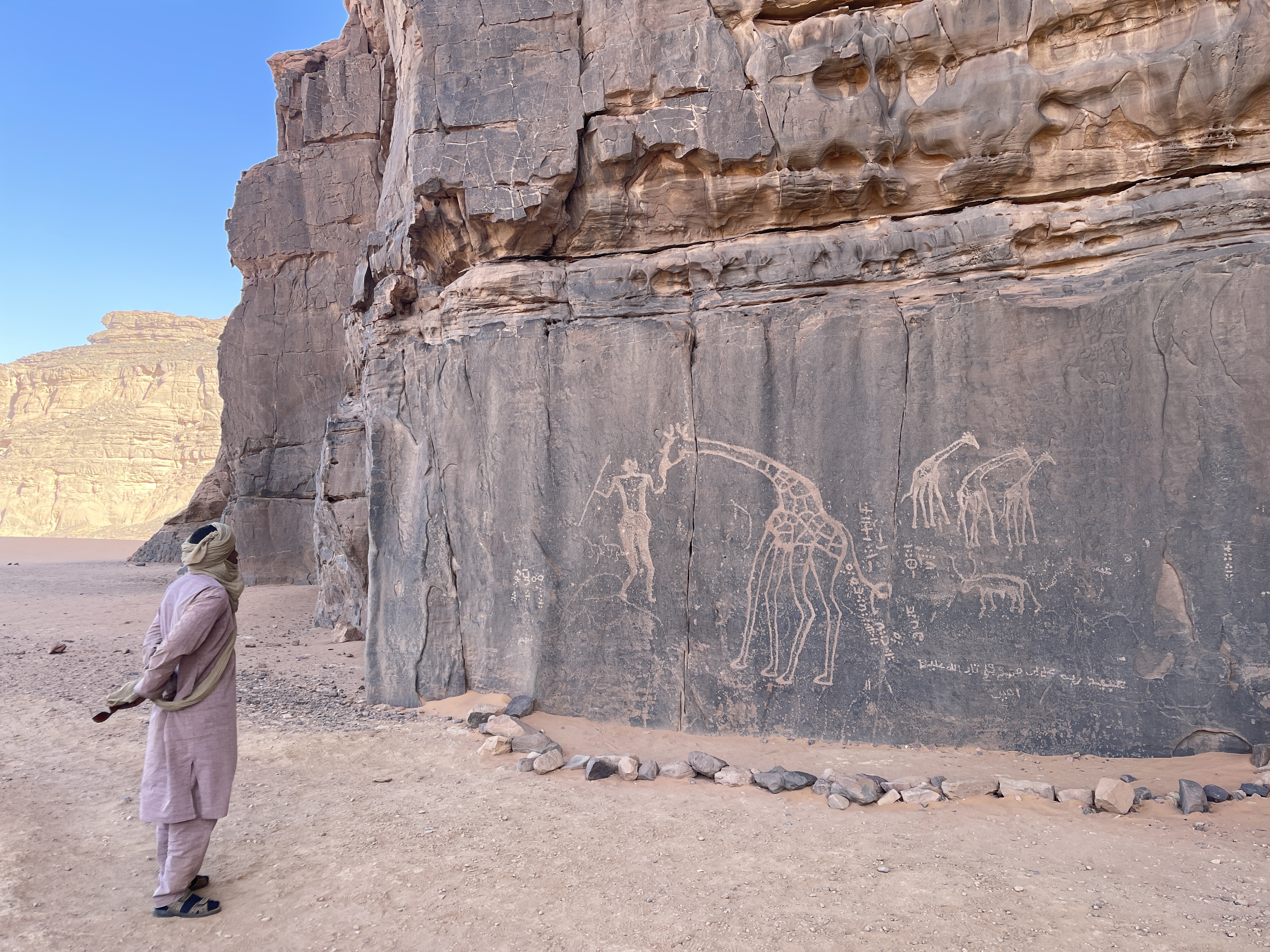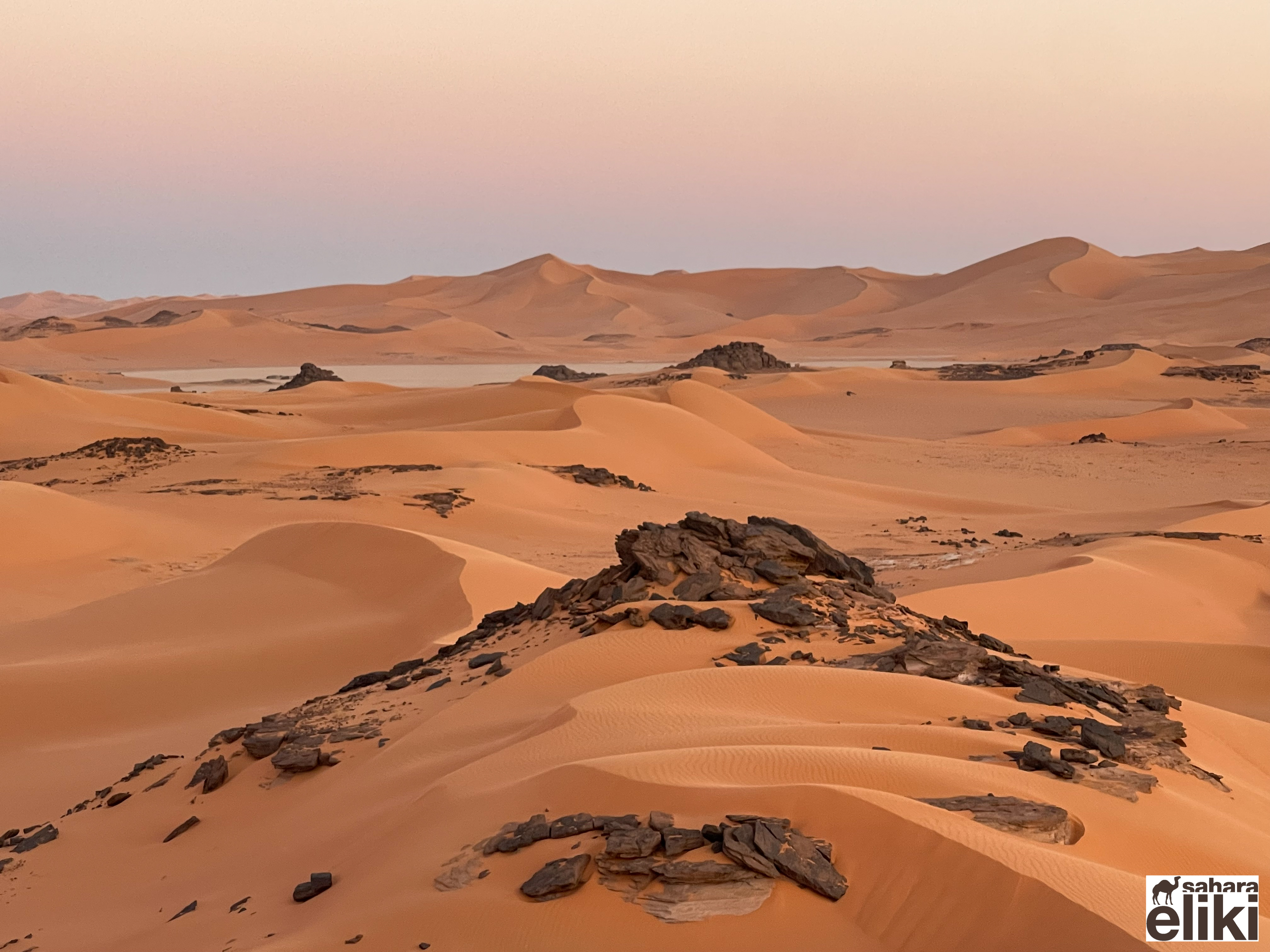 2023年3月、日本のシューズブランド「スイコック」からトゥアレグ族と旅をしながらカタログ撮影をしたいという依頼があって、そのための特別なエリキツアーを企画しました。友人のカメラマン名越啓介さんが紹介してくれたスイコックは、日本のブランド企業としてはじめてアルジェリアの砂漠を舞台にすることを決めました。ジャネットからリビアの国境に広がる「赤いタドラート」は、オレンジ色の砂丘を囲む巨大な岩盤の稀有な景色が150キロも広がり、麒麟や象の岩絵もたくさん残っている絶景です。モロッコの砂漠と違って誰もすれ違いませんでした。二週間目はタッシリナジェール砂漠を7人のトゥアレグとラクダ15頭のキャラバンと一緒に移動しながら、スイコックの撮影が続きました。ソーラーパネルが付いたラクダの上で、手綱を持ちながら写真を撮る名越さんの姿を見て、「これはサハラ・エリキだ!」と私は自慢を覚えました。ラクダ乗りを教えるのも、自然エネルギーで砂漠を撮影するコツも、サハラ.エリキの大事な使命です!アルジェリアの砂漠で撮影されたスイコックのカタログは来年出版される予定です。