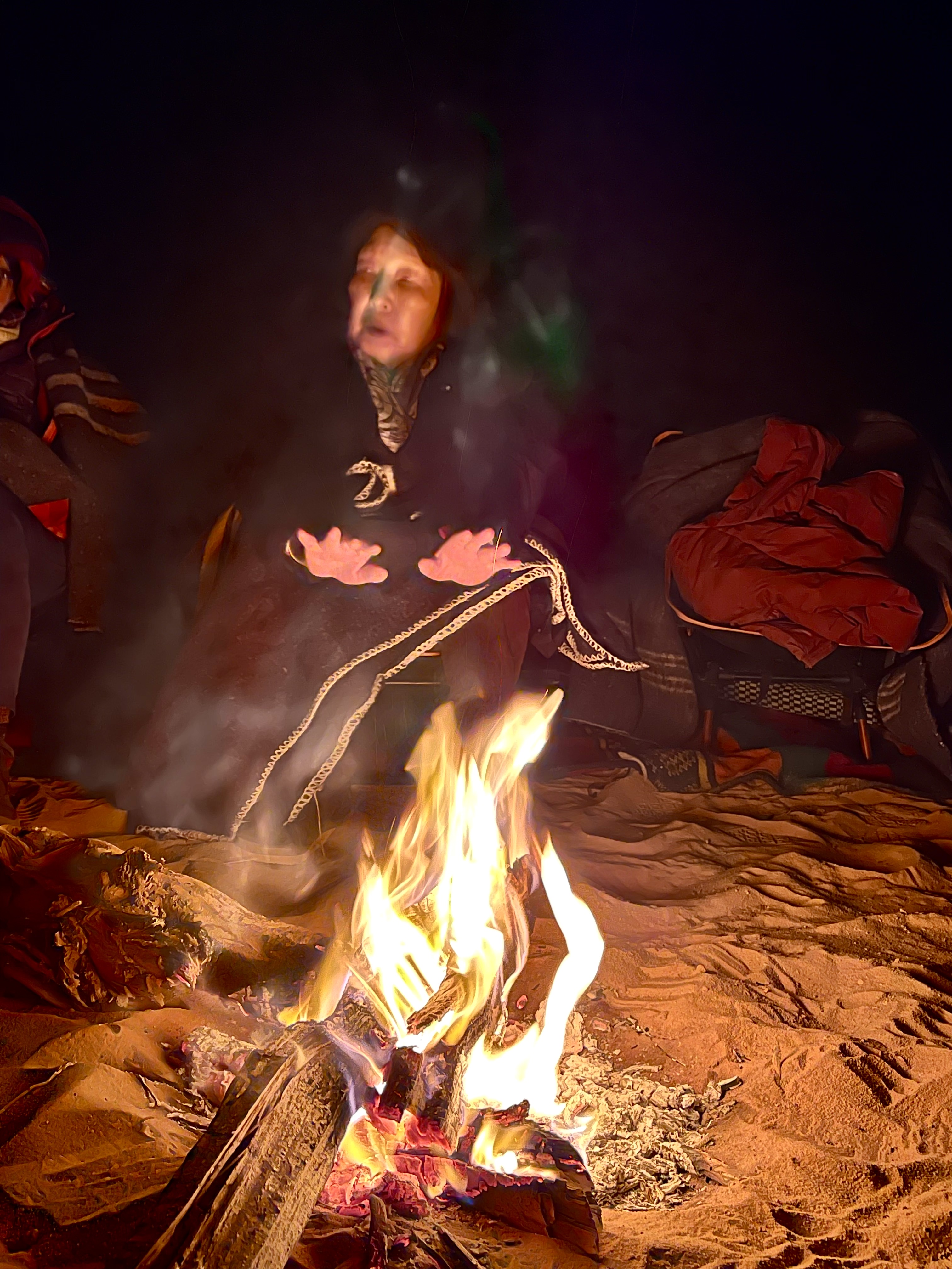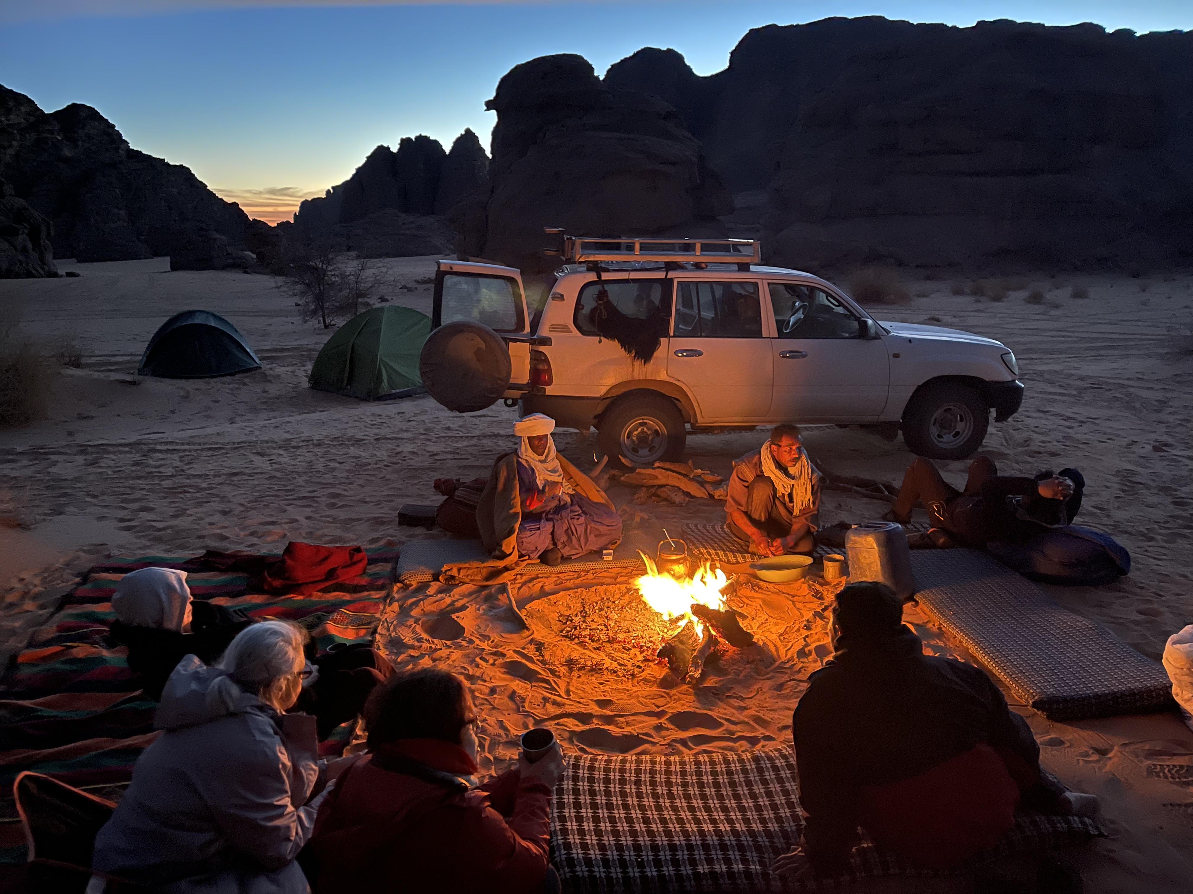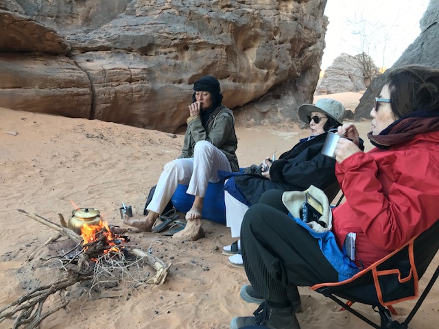 素晴らしい朝焼けを見て、朝食、歩いて、昼食、午後は壁画を見に行くか、私の場合は昼寝。夕方、焚き火を囲んで夕食と歓談。私はベジタリアンなのですが、コックさんが気を遣ってくださって、美味しいものをいっぱいいただきました。そうで無くても昼食は野菜、サラダで、たっぷり野菜をとれました。夜は私はテントより露天がよかったので、メイン・ガイドさんに快適なスポットを選んでもらい、風もなく、岩から輻射熱が出て、目を開ければ満点の星という環境でぐっすり眠れました。すごい贅沢!
