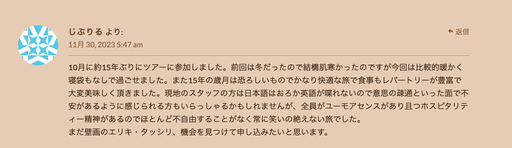 ガイドさんの目配り、気配りは素晴らしかったです。私はフランス在住なので、ツァレグのスタッフとフランス語で会話できるのも楽しかった。体力があれば、もう一度行きたい!