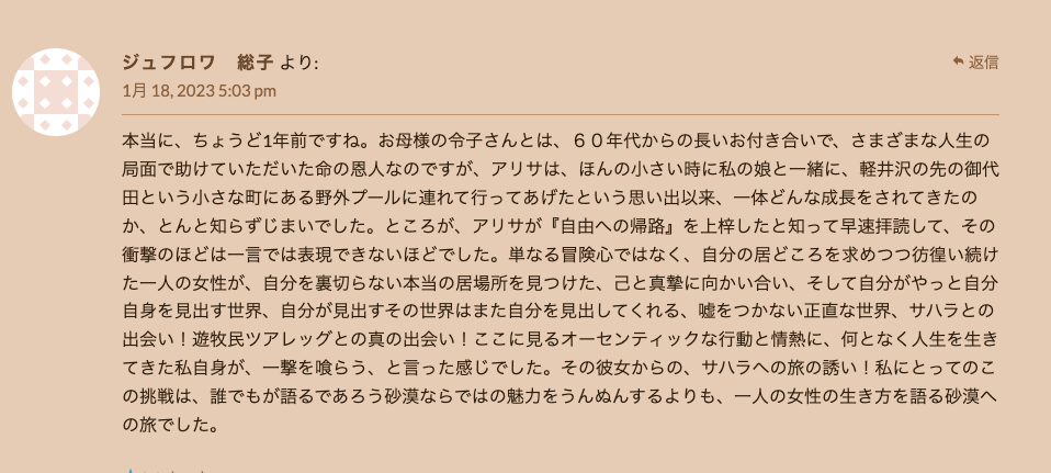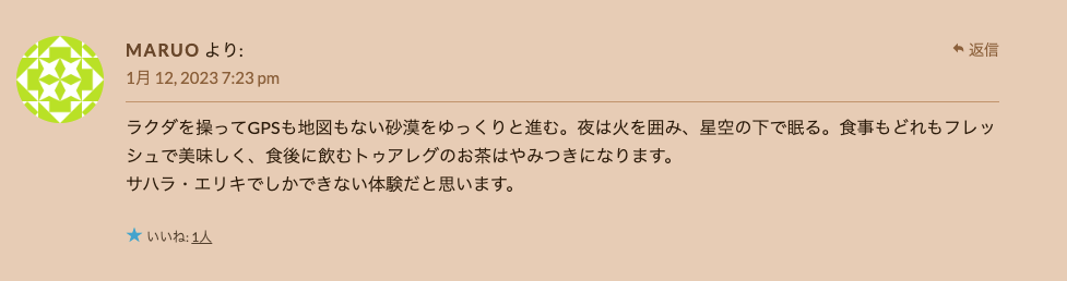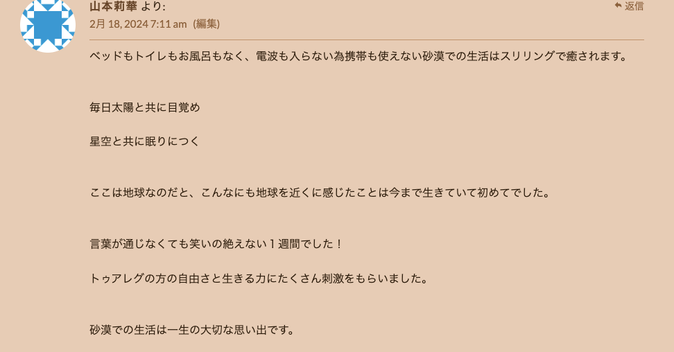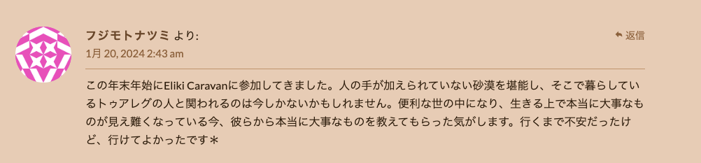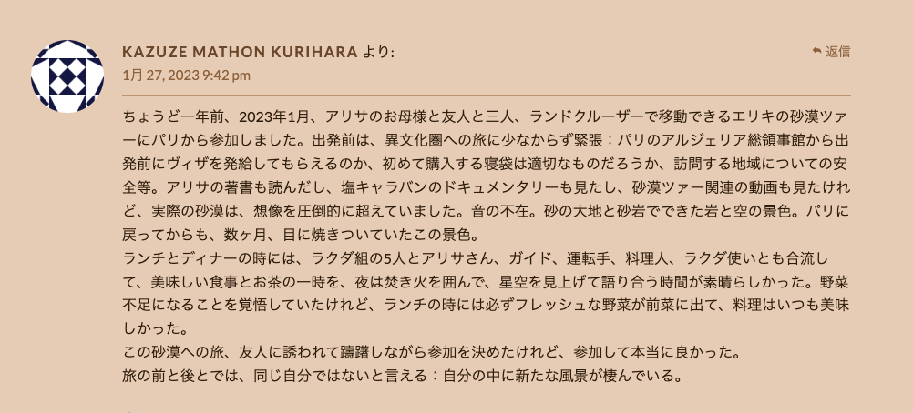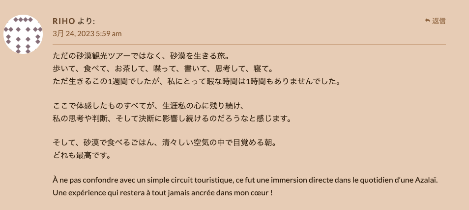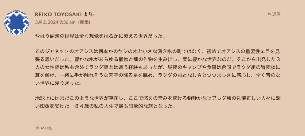 エリキツアーが復活した2022年からアルジェリアのサハラ砂漠まで来てくださったお客さまの大事な感想です。「サハラ砂漠に人生に一度だけ行ってみたい」という夢を叶えたくてサハラ・エリキに声をかけた様々な人たちの信頼感、ありがとうございました。サハラ砂漠にまだ未知なところがたくさんありますので、またおいで下さい。Les impressions de voyage de nos amis japonais ou taiwanais qui sont partis visiter les touaregs jusque dans le Sahara algérien pour accomplir un des rêves de leur vie! Nous les remercions pour leur confiance. Les activités d’Eliki ont repris depuis l’automne 2022, apres dix ans d’interruption et nous espérons accueillir aussi d’autres amis des quatre coins du monde. L’Algérie accepte les visas a l’arrivée, et il y a des vols directs a partir de Paris, c’est le moment ou jamais de partir!