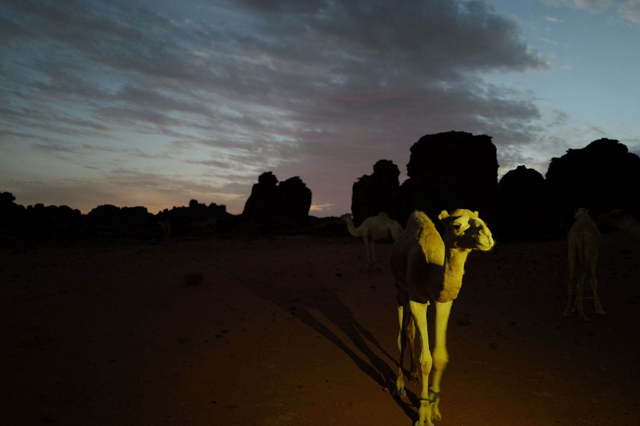 メンバーは日本人7人、スタッフ7人、ラクダえーと11頭だったかな?うち一頭は救急ラクダで、これがいて、とても助かりました。ついでにラクダ使いの少年の犬も一頭ついてきていました。
