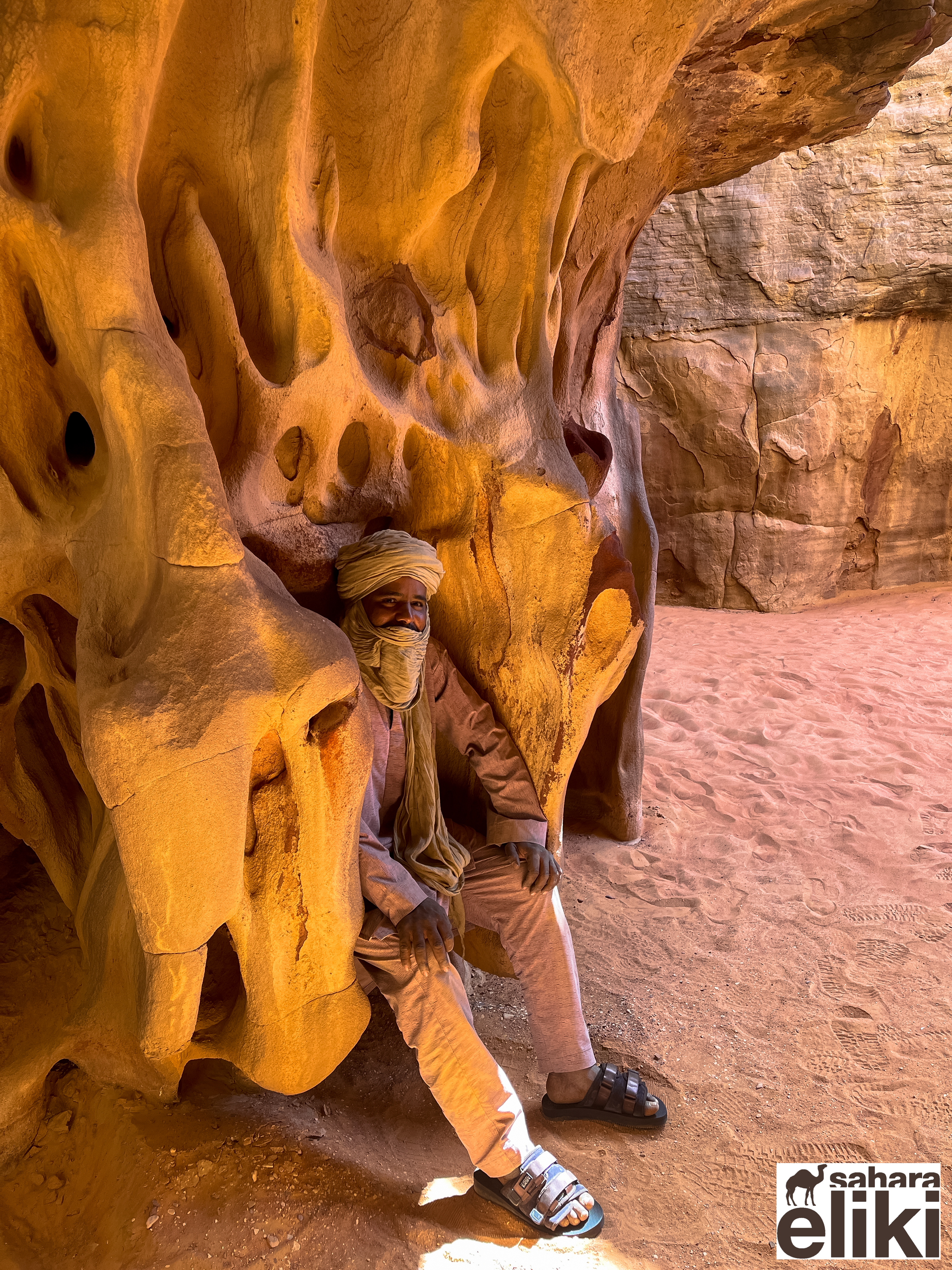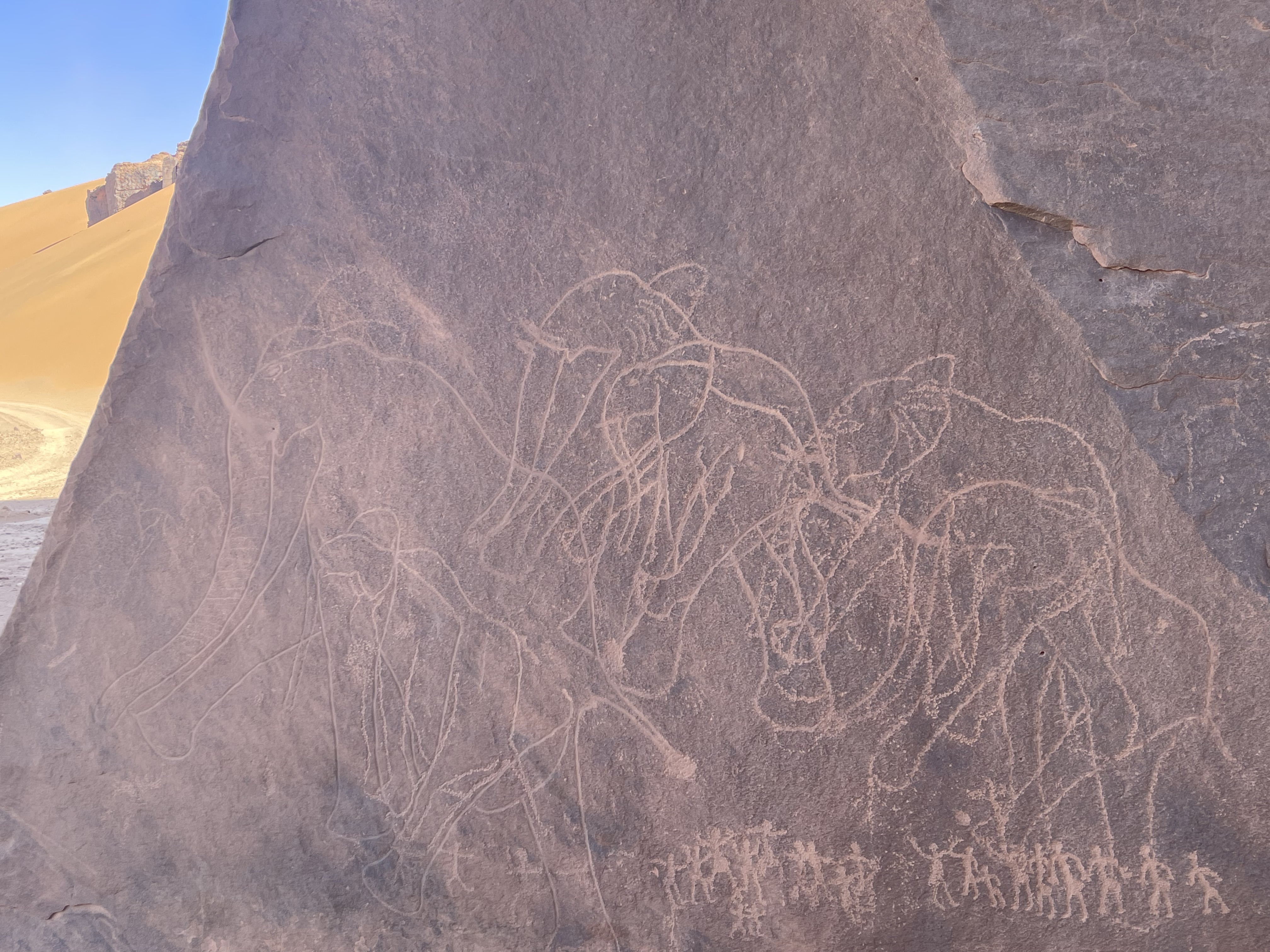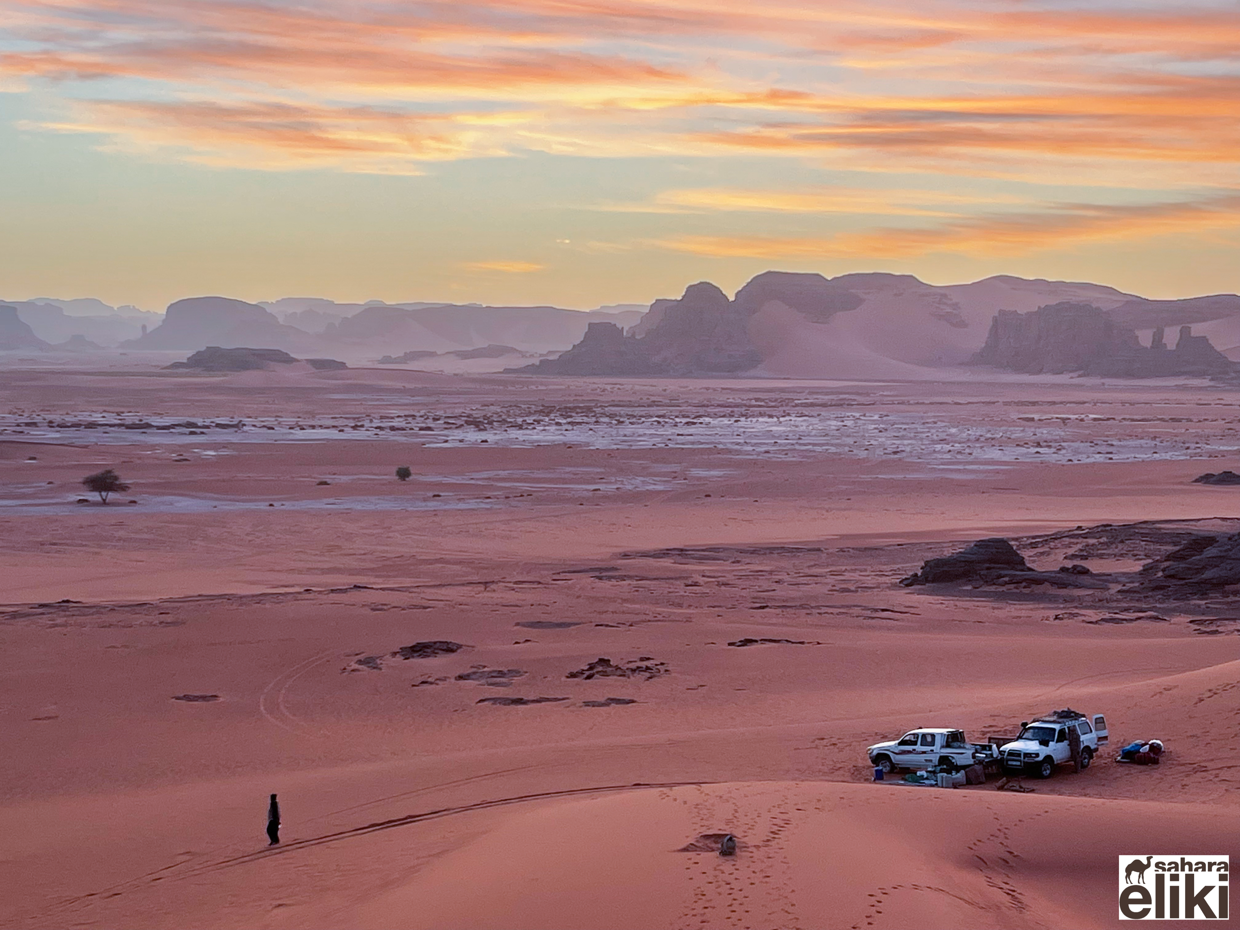 ジャネットから車で3時間移動してからリビアの国境に広がる「赤いタドラート」に着きます。オレンジ色の砂丘を囲む巨大な岩盤の稀有な砂漠が150キロも広がり、麒麟や象の岩絵もたくさん残っている絶景です。毎日車で移動し、岩絵を巡る時にガイドと一緒に砂漠を歩く形になります。