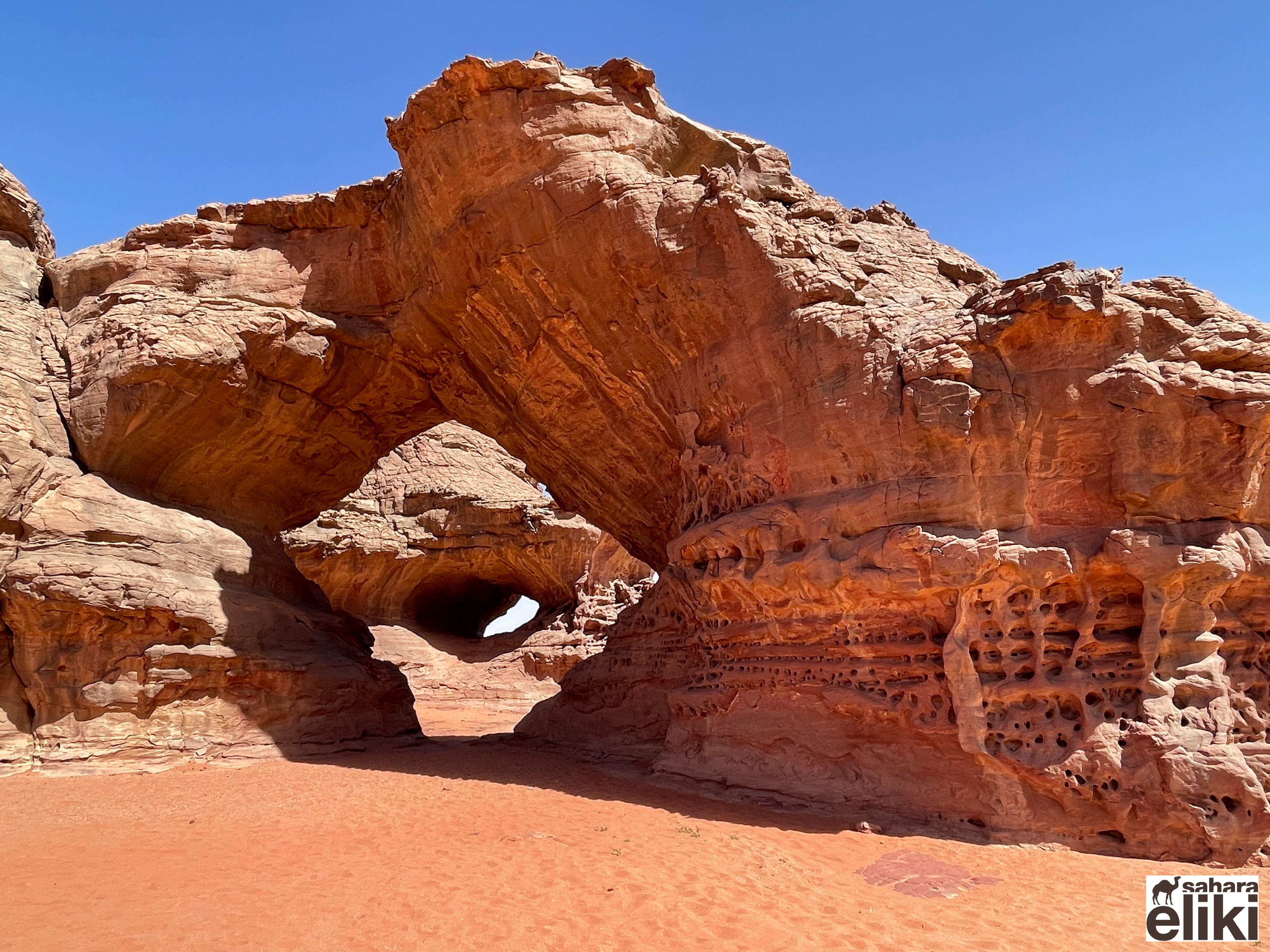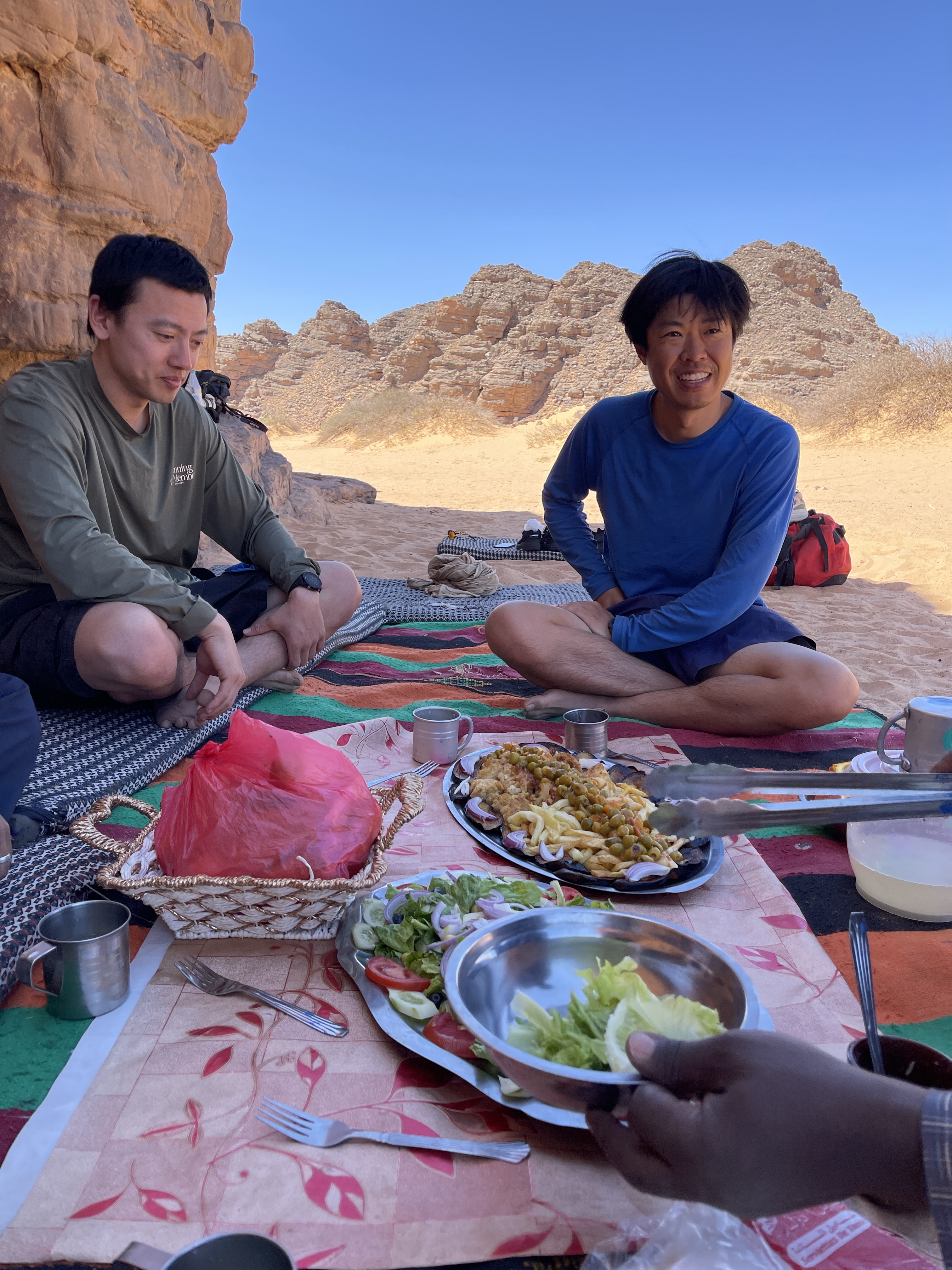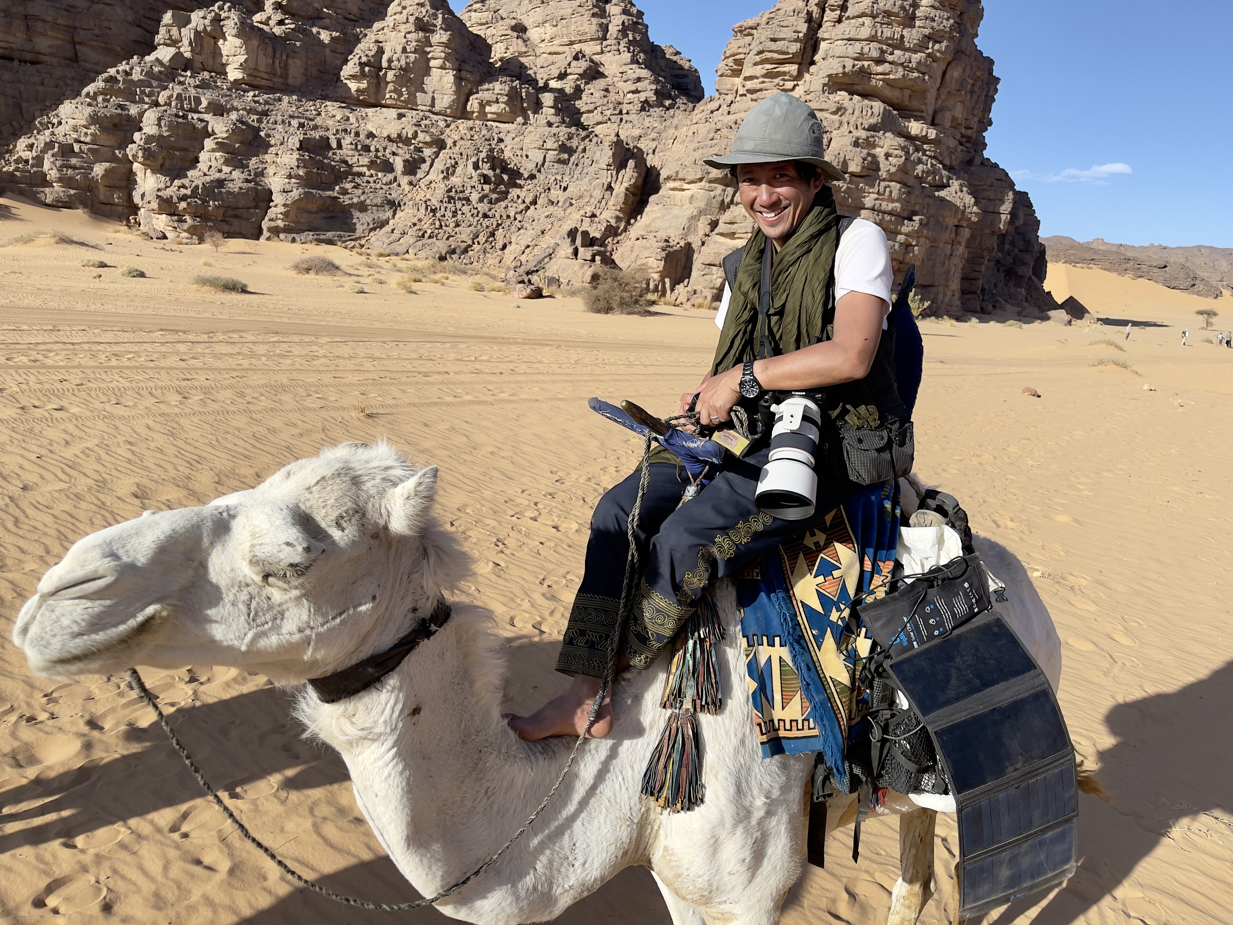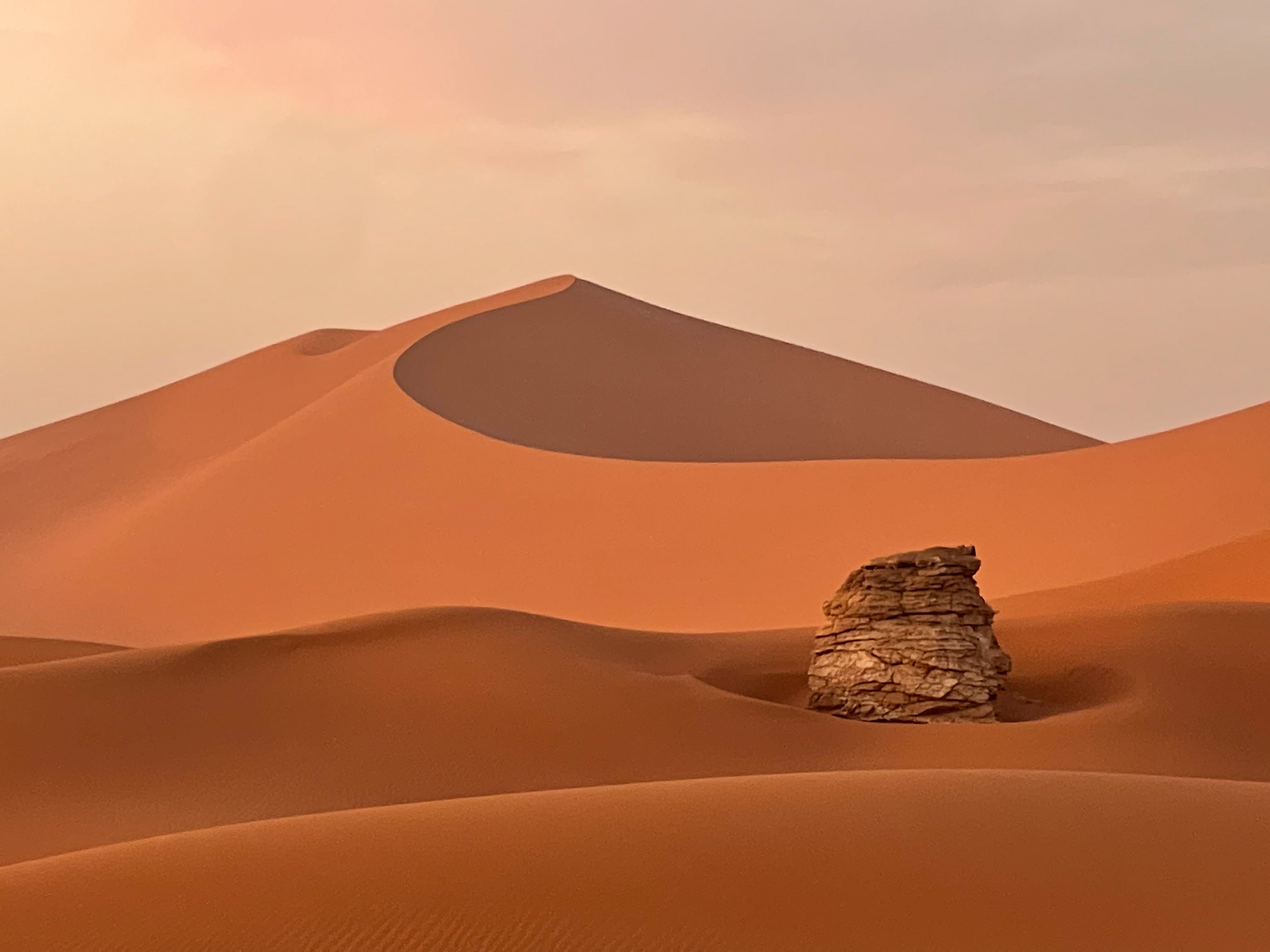 ジャネットから車で3時間移動してからリビアの国境に広がる「赤いタドラート」に着きます。オレンジ色の砂丘を囲む巨大な岩盤の稀有な砂漠が150キロも広がり、麒麟や象の岩絵もたくさん残っている絶景です。毎日車で移動し、岩絵を巡る時にガイドと一緒に砂漠を歩く形になります。